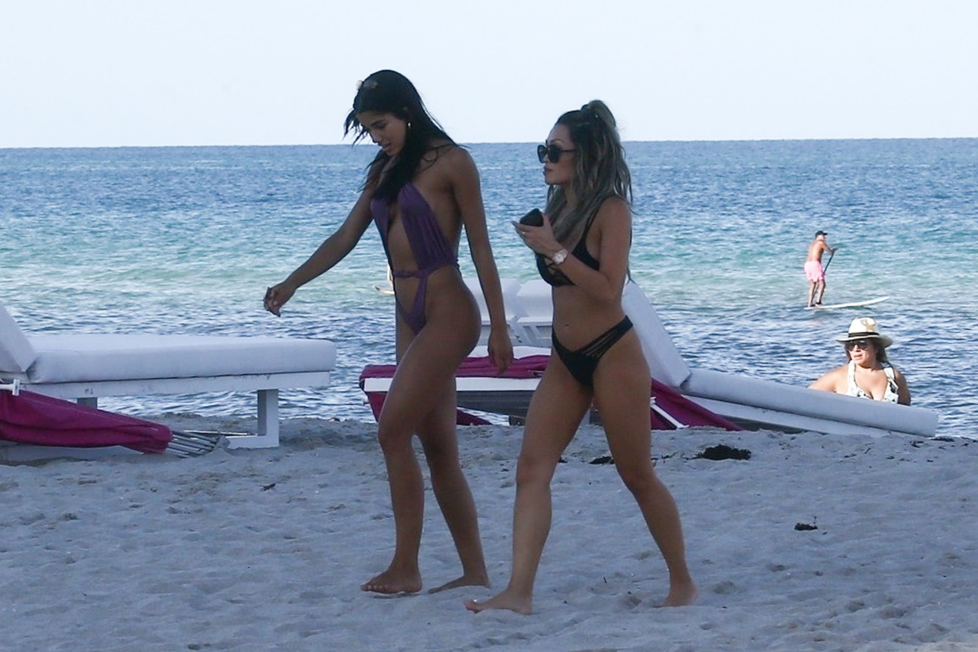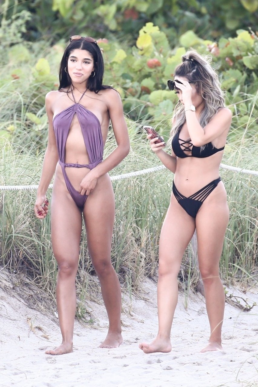 Model e influenciadora de mídia social Yovanna Ventura (22) arrasa com um ousado maiô roxo de uma peça na praia em Miami, 12/08/2018. A suposta ex de Justin Bieber chamou atenção junto com sua amiga enquanto as duas caminhavam pela praia.