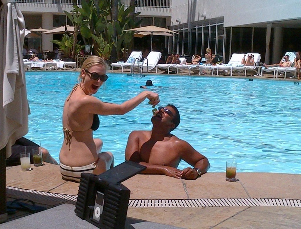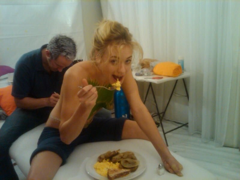 Estou apaixonado por ela desde "Chuck". Os seios pintados combinam com os seios nas outras fotos, então apostaria dinheiro que são dela. A segunda foto parece um lugar muito agradável para um almoço embalado. Eu passaria a língua naquele botão do amor tantas vezes e por tanto tempo quanto ela me deixasse.
