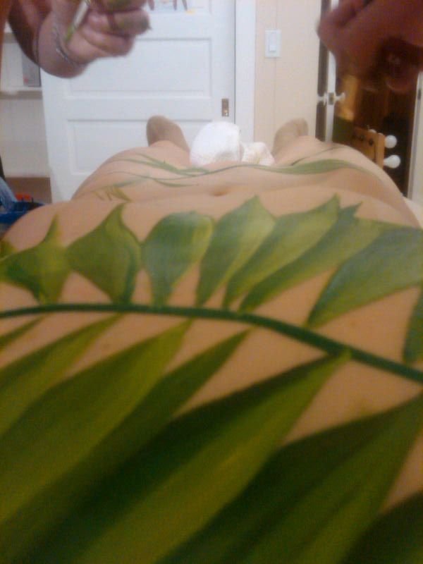 Quanto à pintura corporal, aquela tinta azul-esverdeada está envolvendo o lado errado do quadril dela. Também deveria ter pontas para as folhas e uma espinha dorsal passando pelo centro.