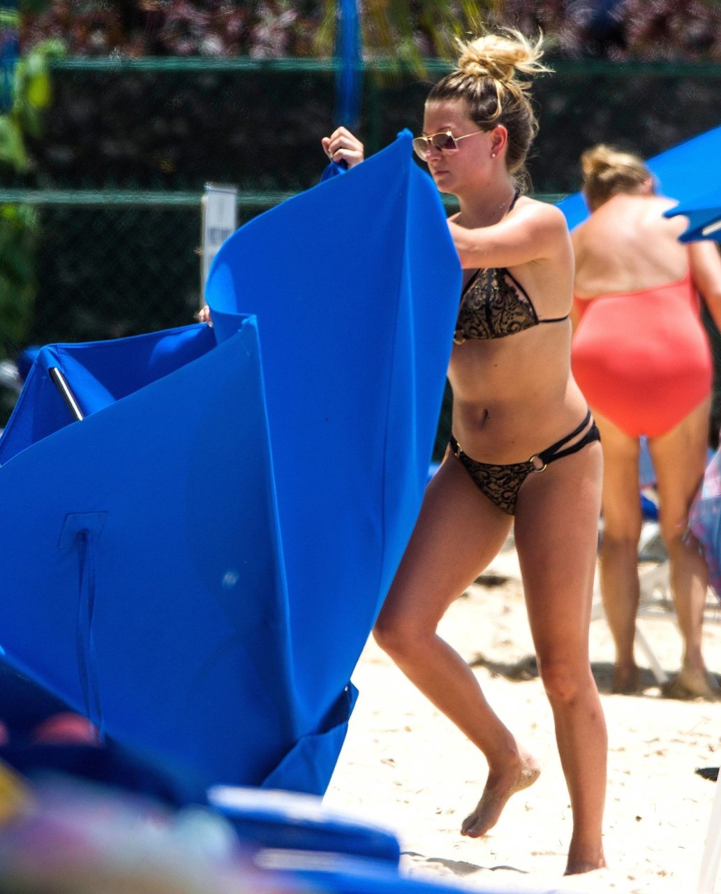 A estrela de “Love Island” Zara Holland e a mãe Cheryl Hakeney foram vistas na praia em Barbados, 13/04/2019. A ex-rainha da beleza exibiu seus seios e bumbum usando um biquíni estiloso com um design interessante no sutiã.