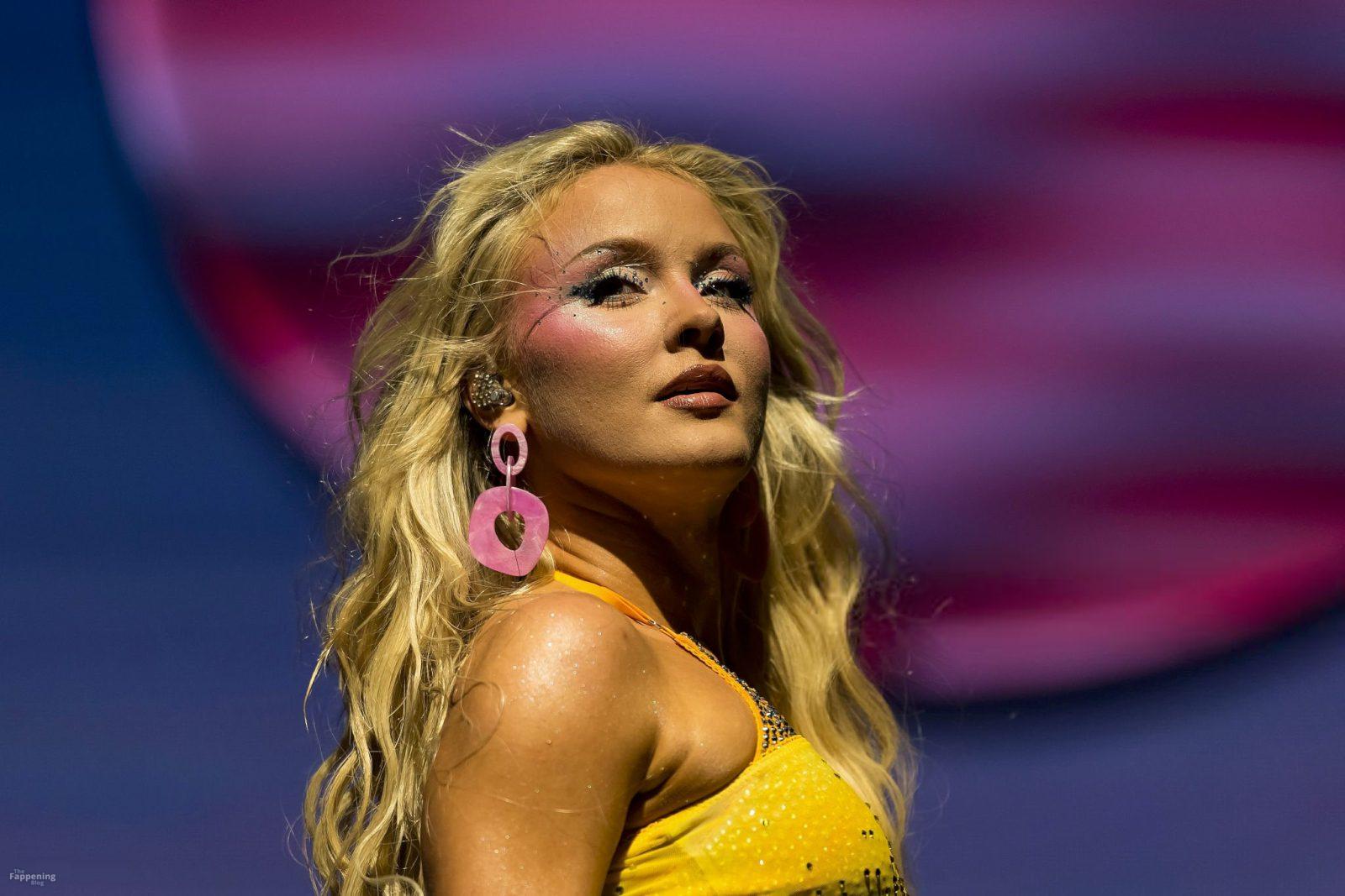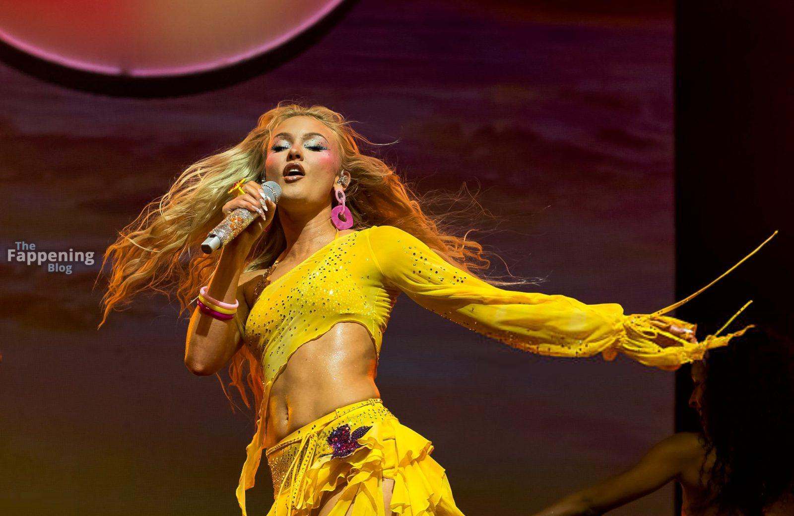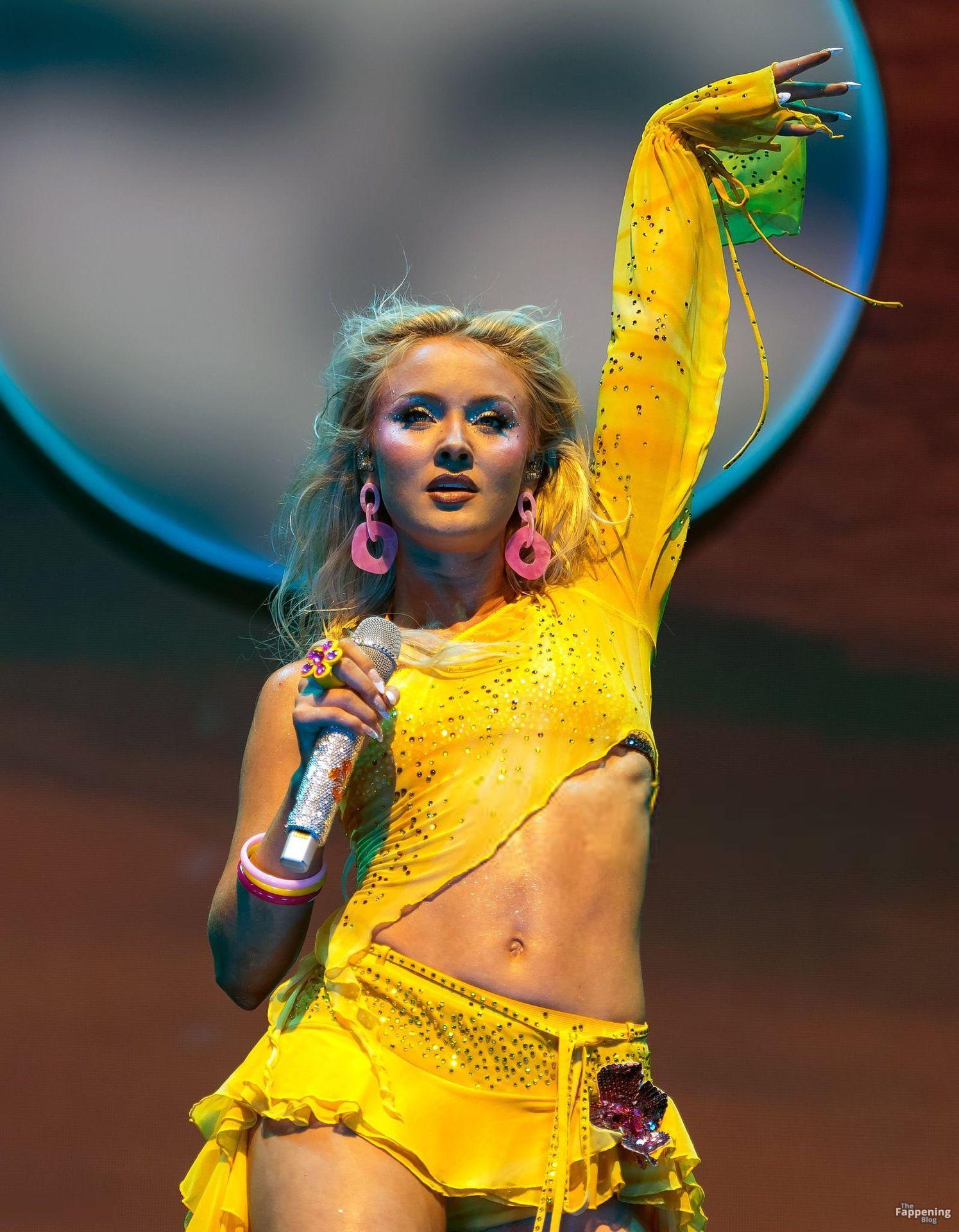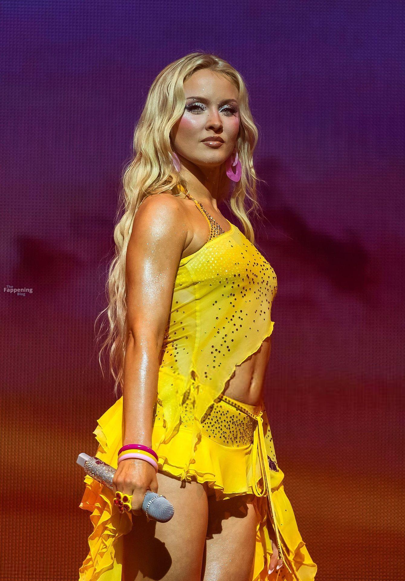 Zara Larsson subiu ao palco do OVO Arena Wembley com um top cropped amarelo transparente e uma minissaia que mostravam seu abdômen e pernas.