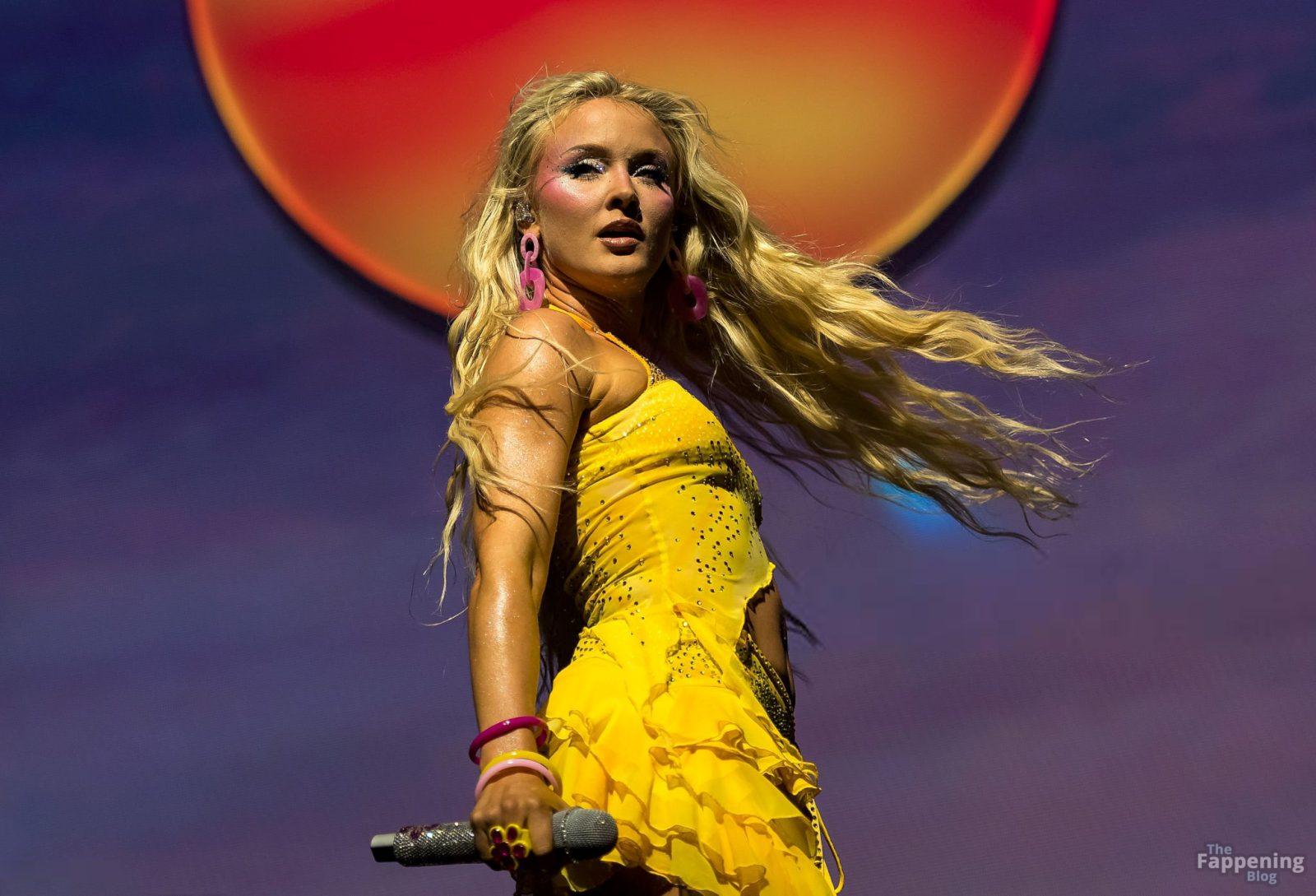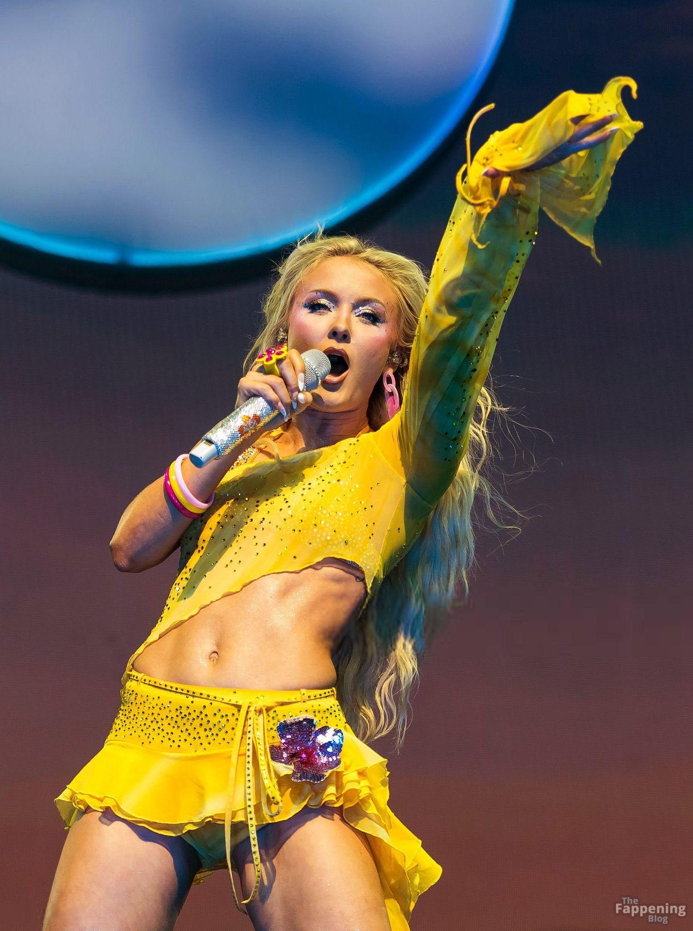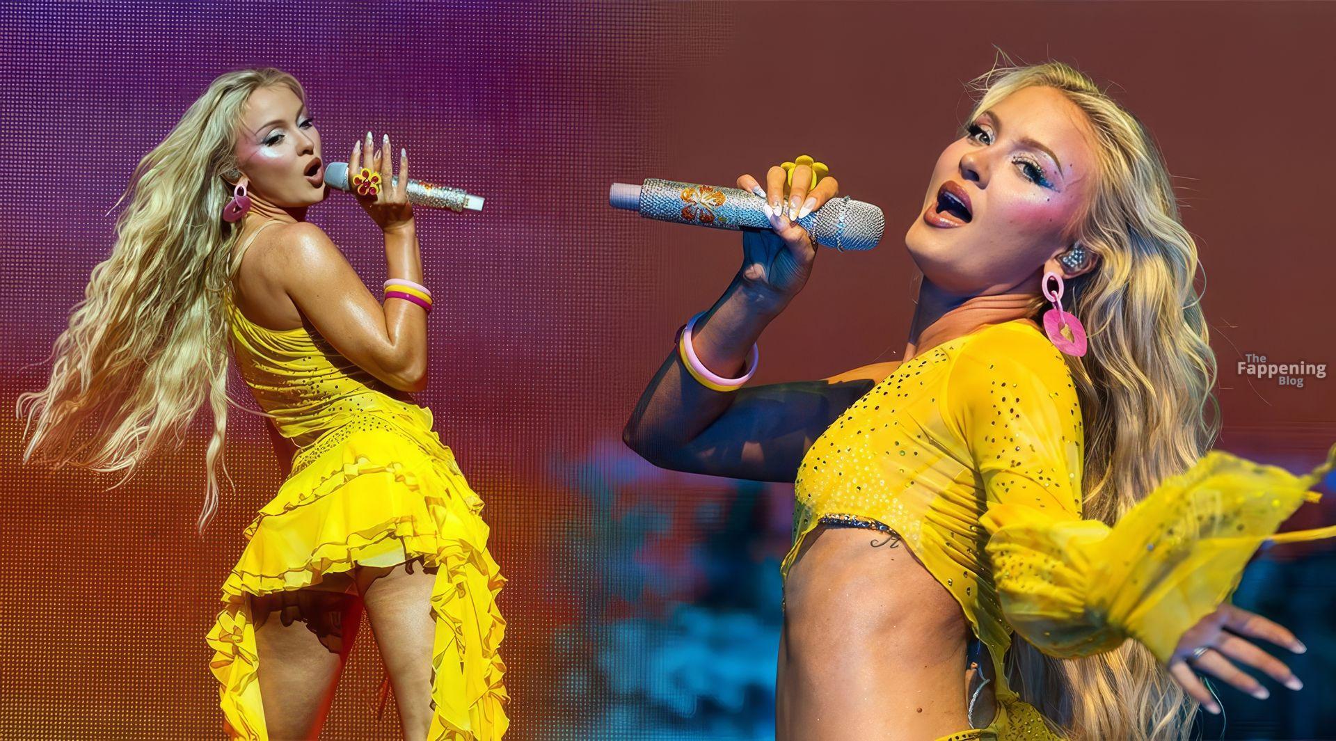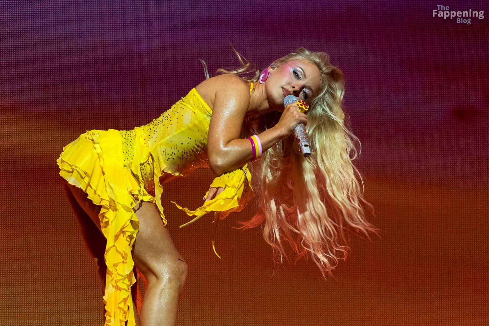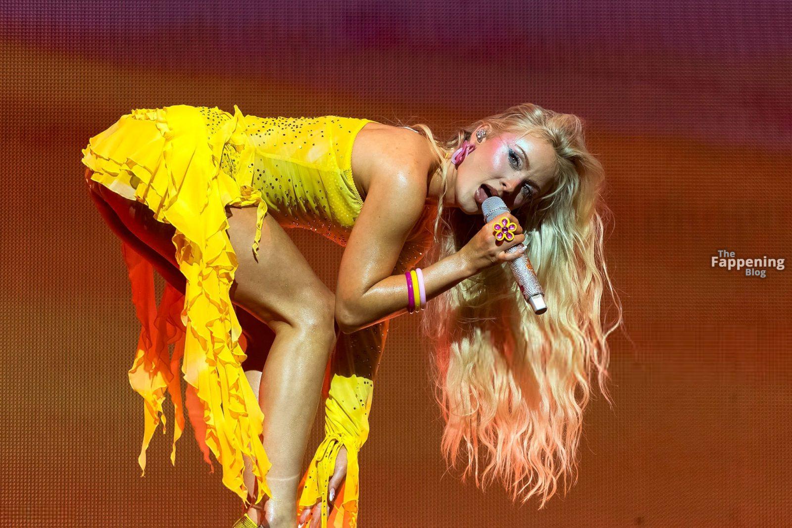 Zara Larsson subiu ao palco do OVO Arena Wembley com um top cropped amarelo transparente e uma minissaia que mostravam seu abdômen e pernas.