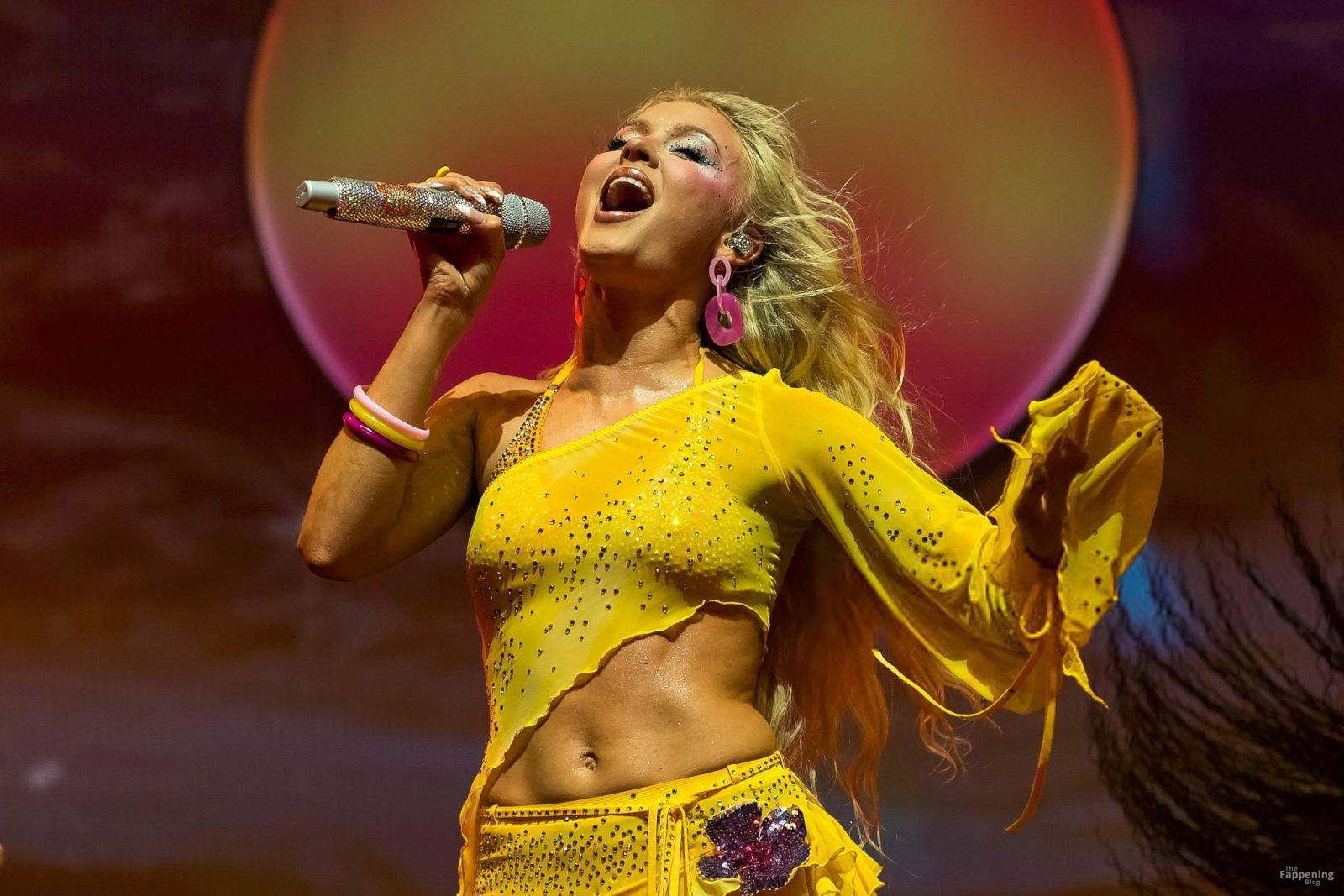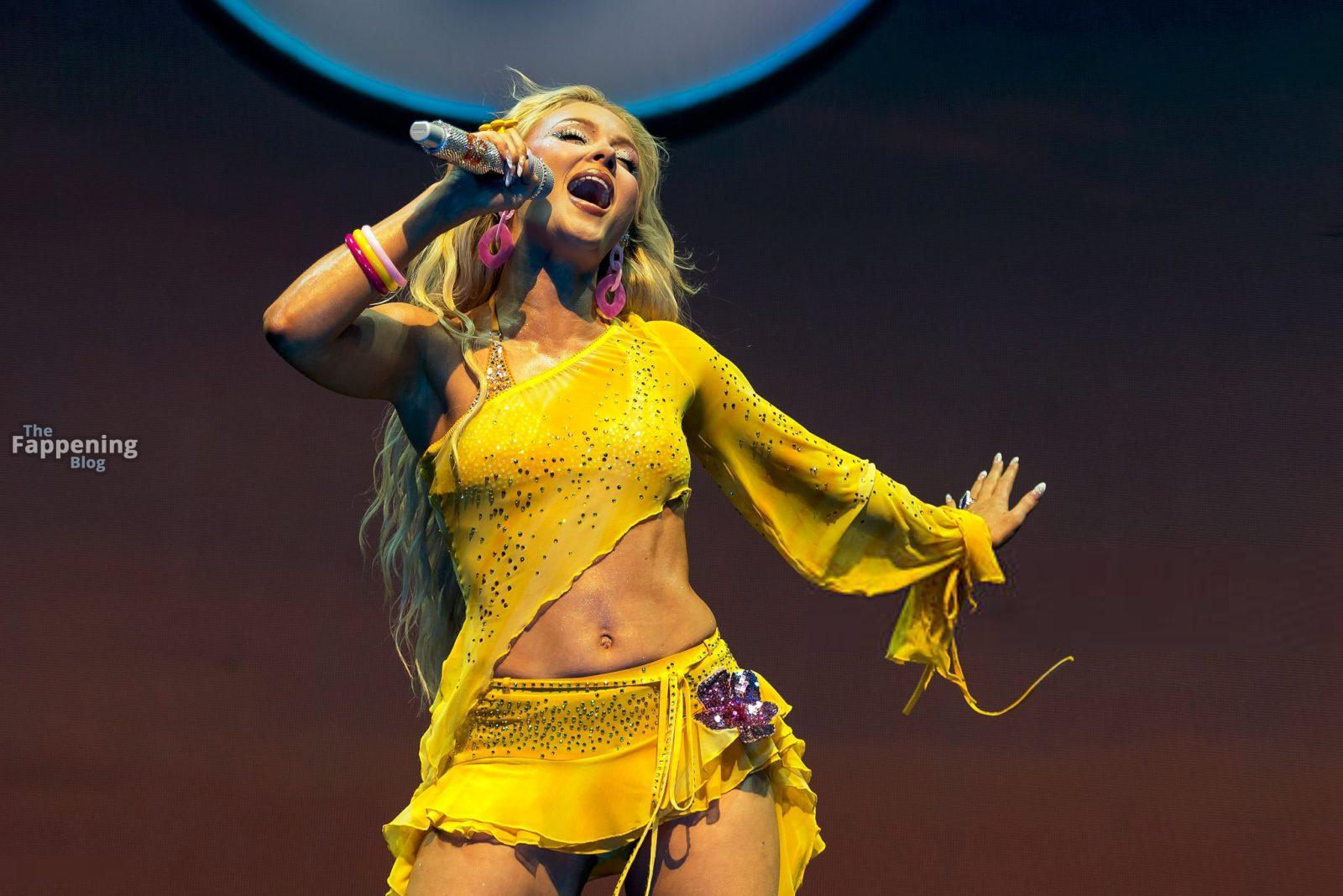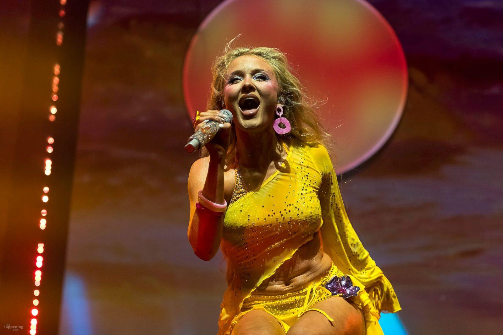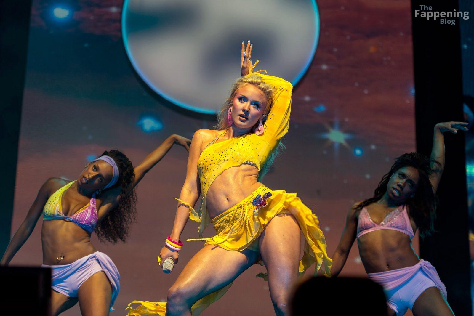 Zara Larsson subiu ao palco do OVO Arena Wembley com um top cropped amarelo transparente e uma minissaia que mostravam seu abdômen e pernas.