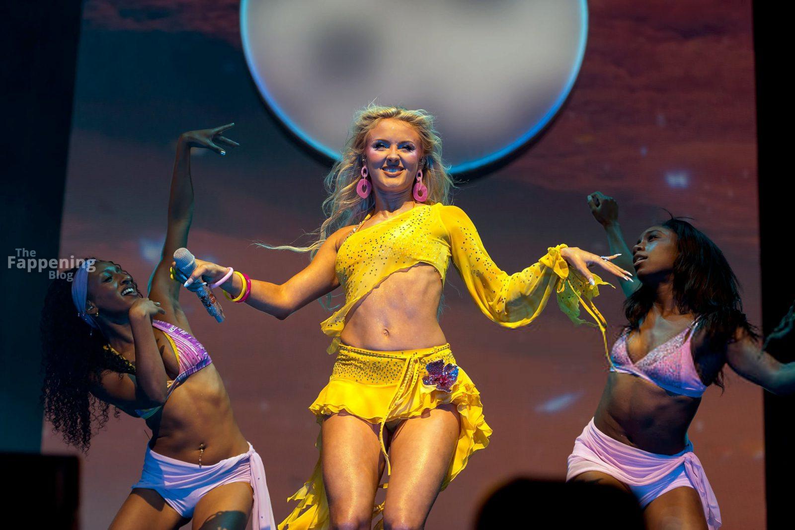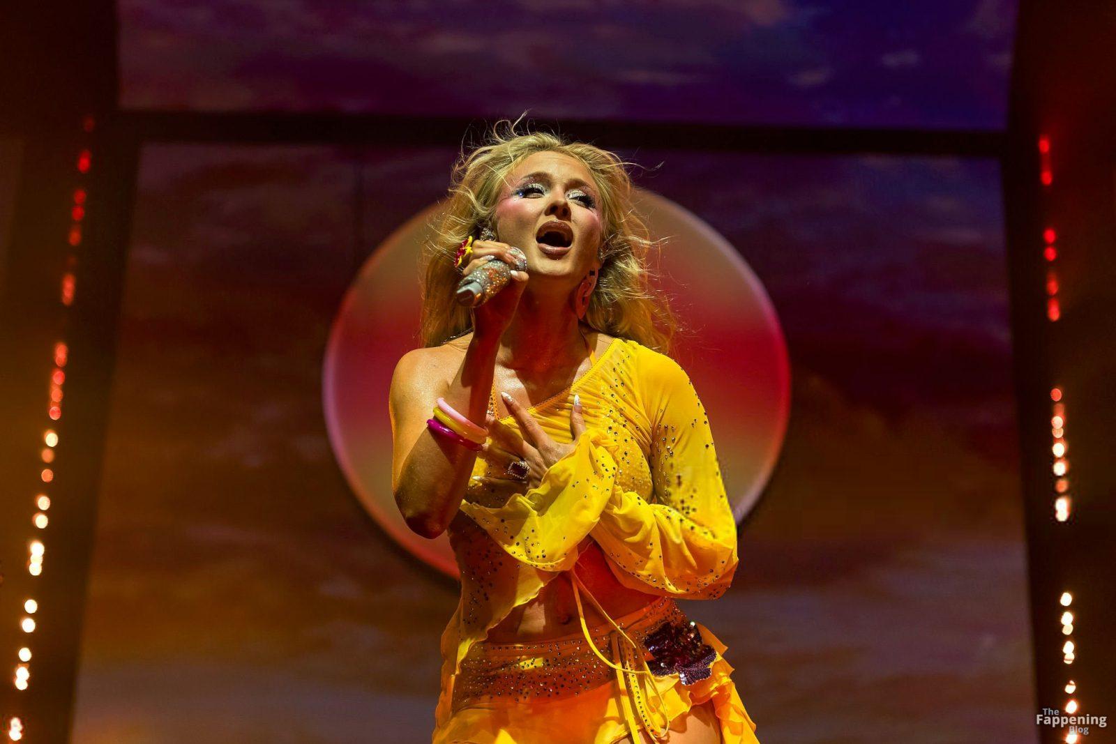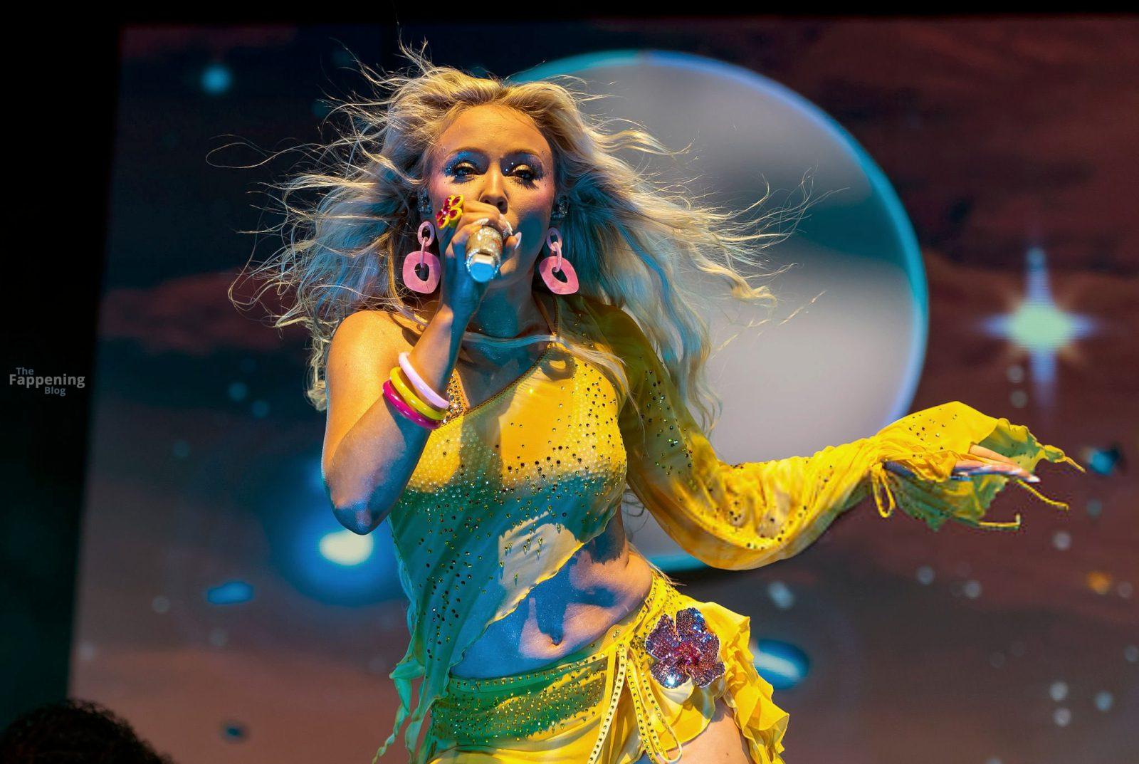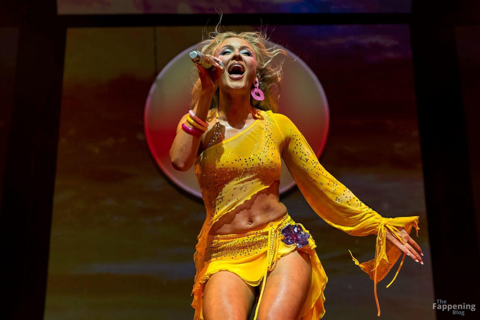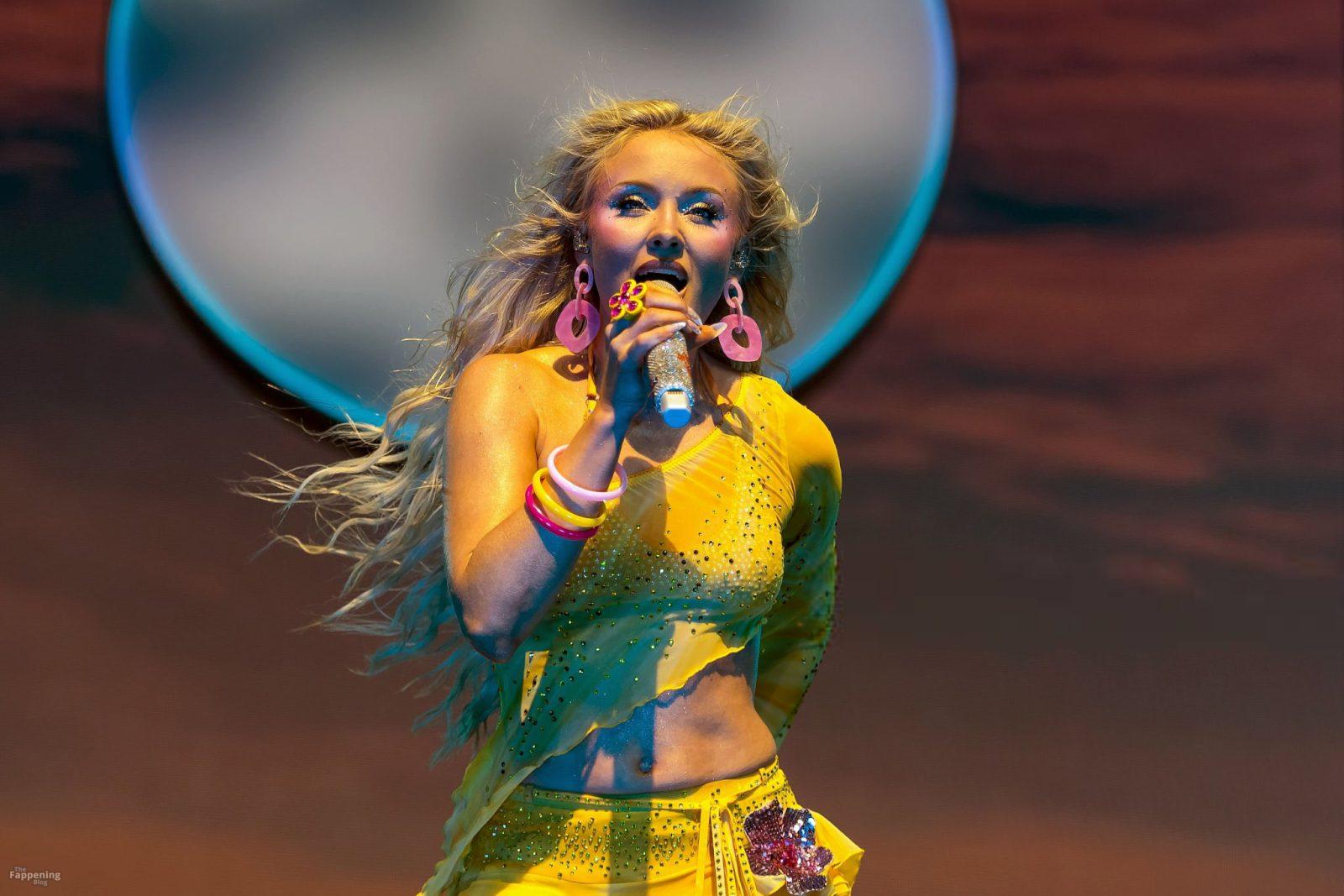 Zara Larsson subiu ao palco do OVO Arena Wembley com um top cropped amarelo transparente e uma minissaia que mostravam seu abdômen e pernas.