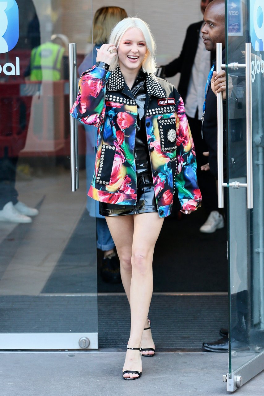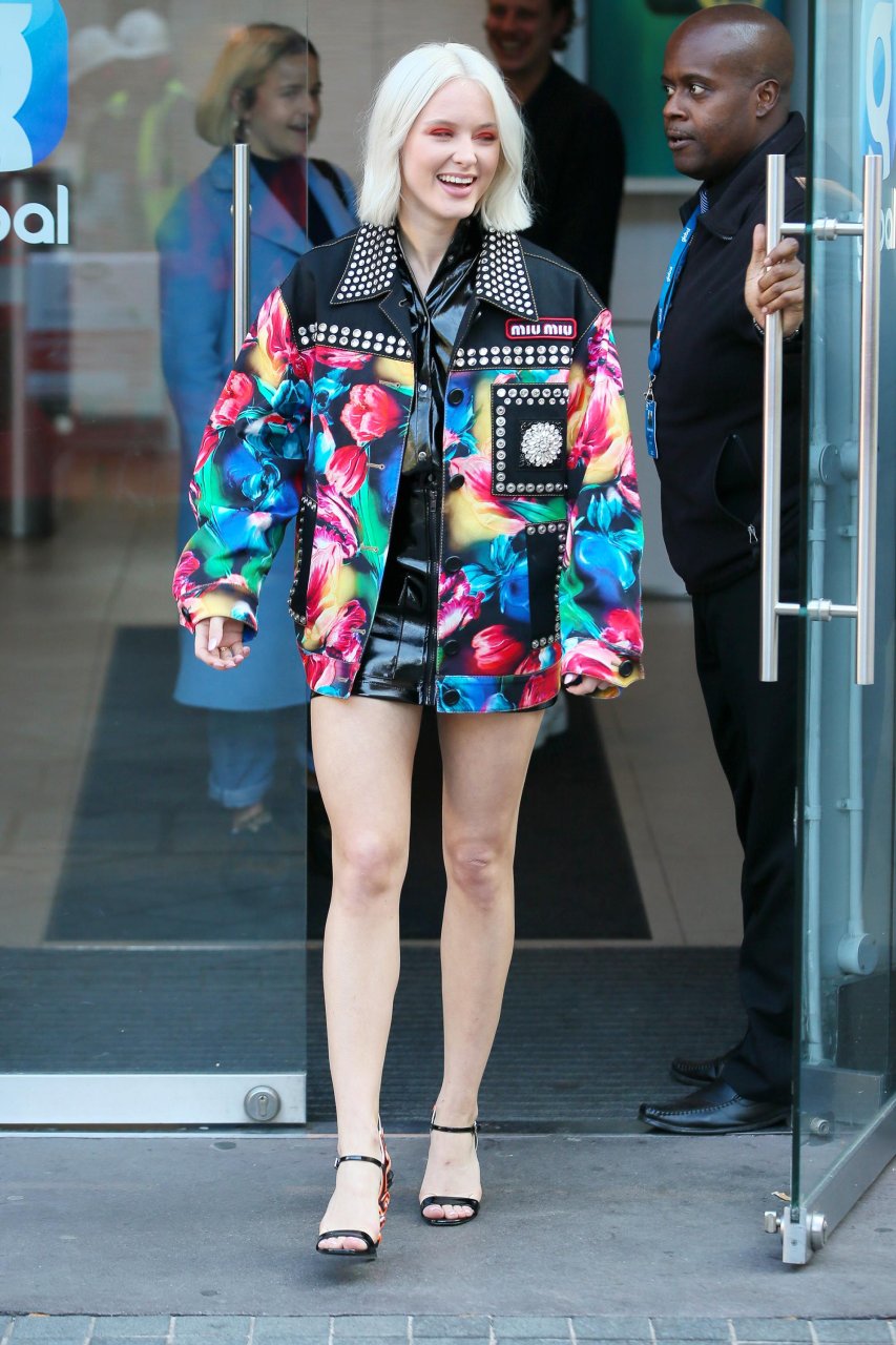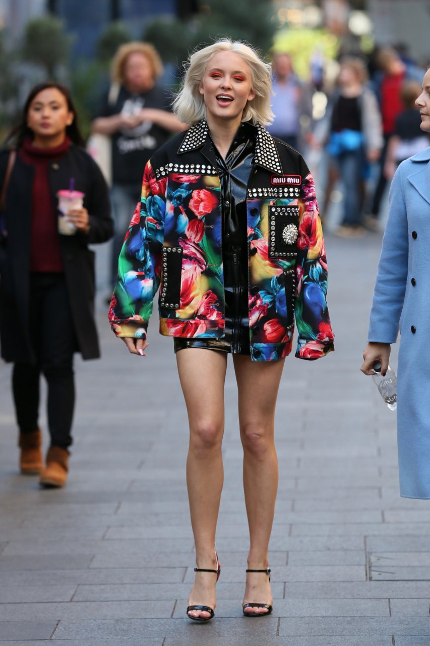 Zara Larsson, com pernas longas (20), foi vista usando uma jaqueta Miu Miu ao sair da Global Radio Station após promover seu novo single “Ruin My Life” em Londres, 16/10/2018.