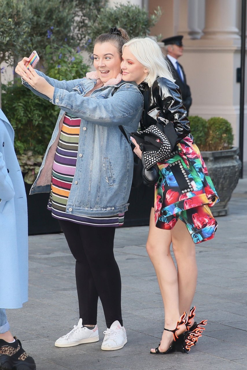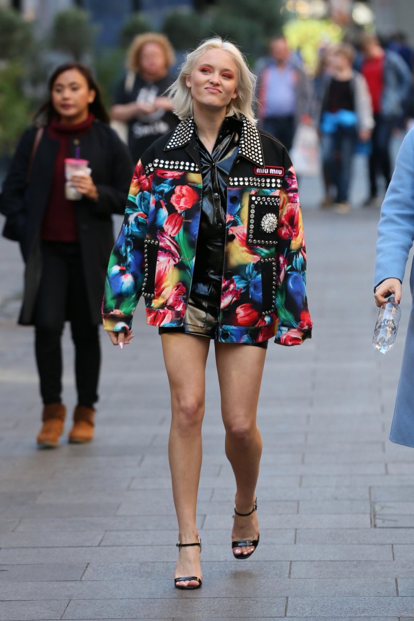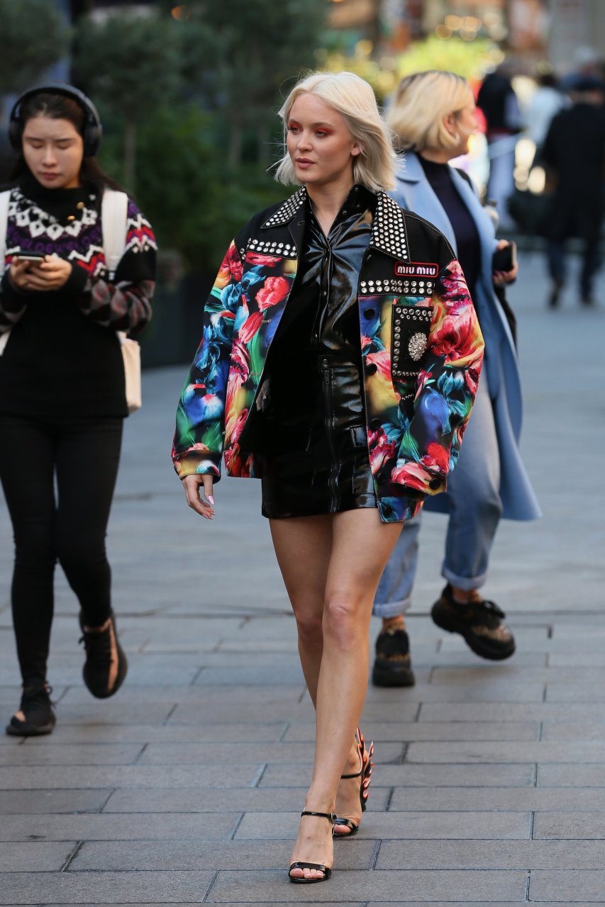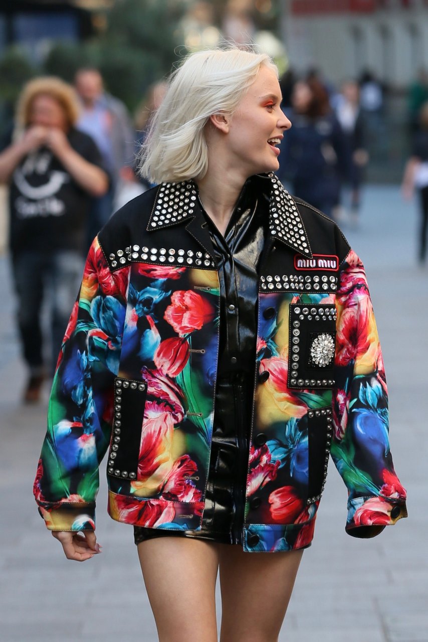 Zara Larsson, com pernas longas (20), foi vista usando uma jaqueta Miu Miu ao sair da Global Radio Station após promover seu novo single “Ruin My Life” em Londres, 16/10/2018.