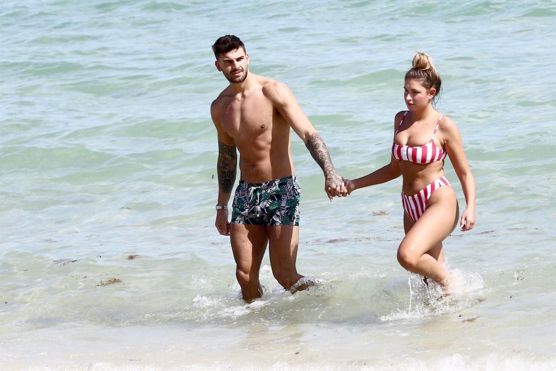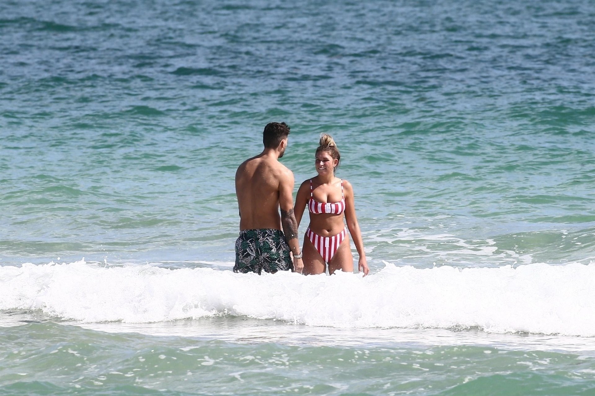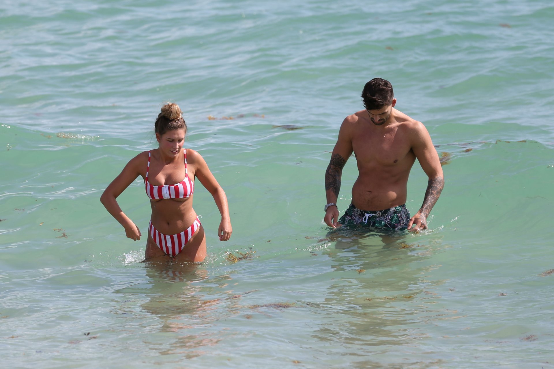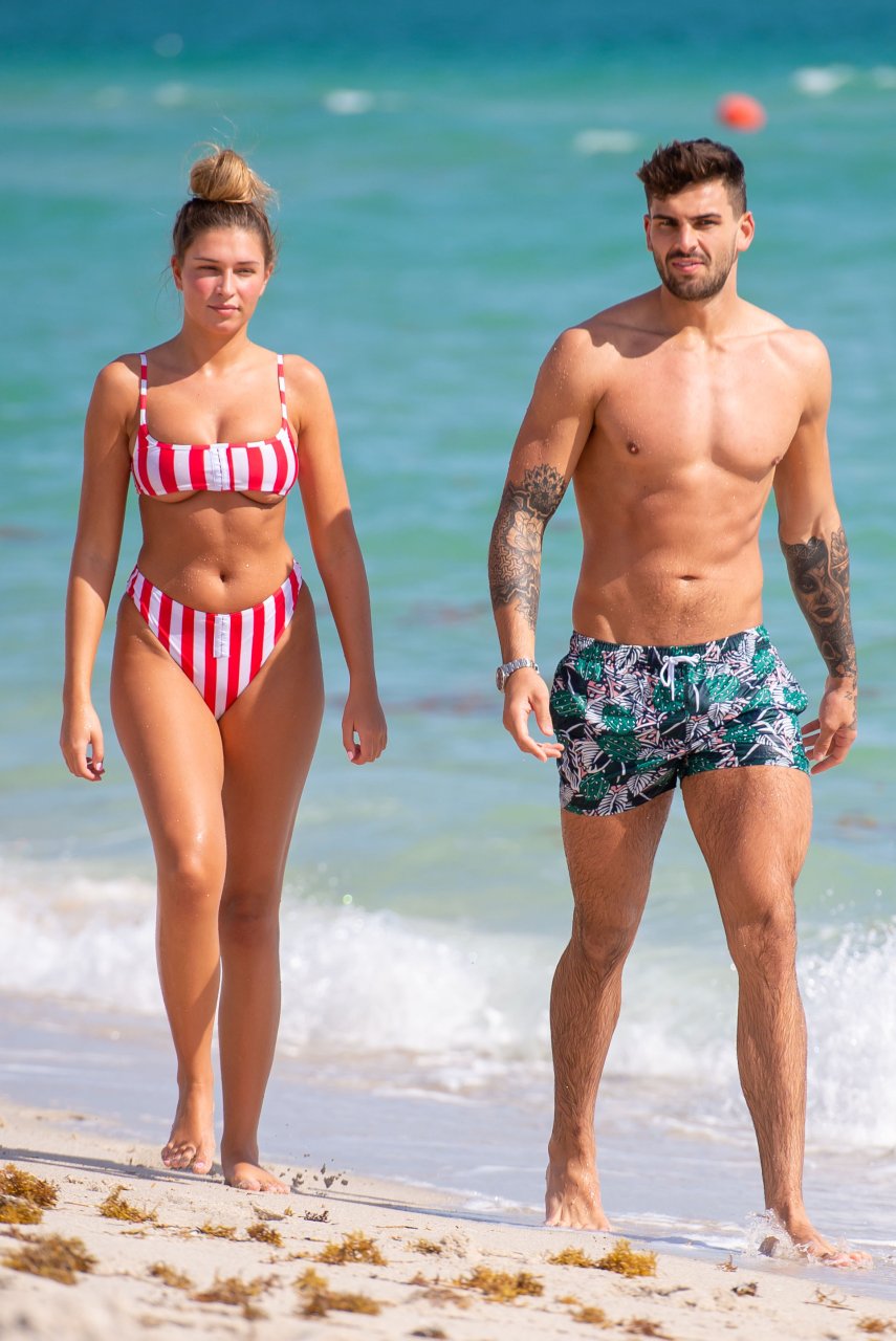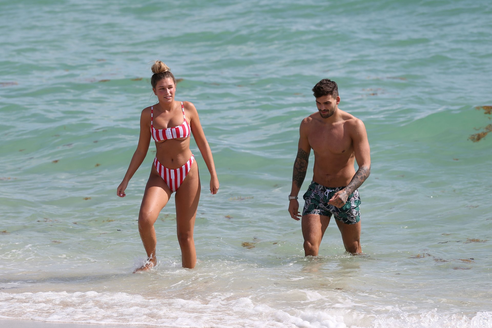 Zara impressionou Adam com uma viagem de aniversário para Miami e as Bahamas e hoje foi a primeira manhã deles ao sol. O casal de reality show que se conheceu no programa de sucesso parecia tão apaixonado como sempre enquanto demonstravam afeto público ao se refrescarem no oceano. Zara exibiu um underboob acentuado em um biquíni muito justo listrado vermelho e branco.