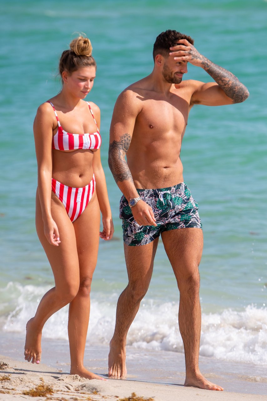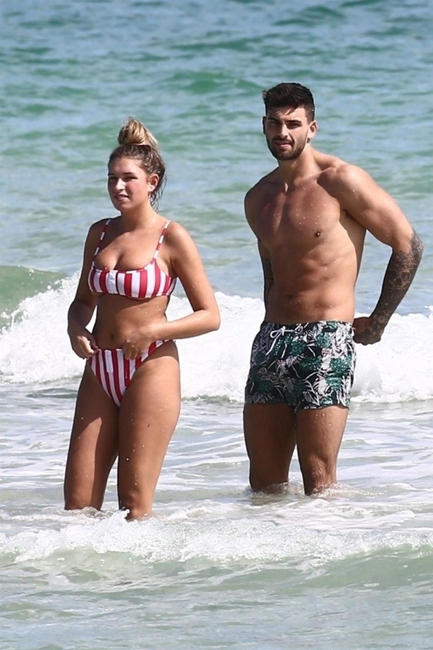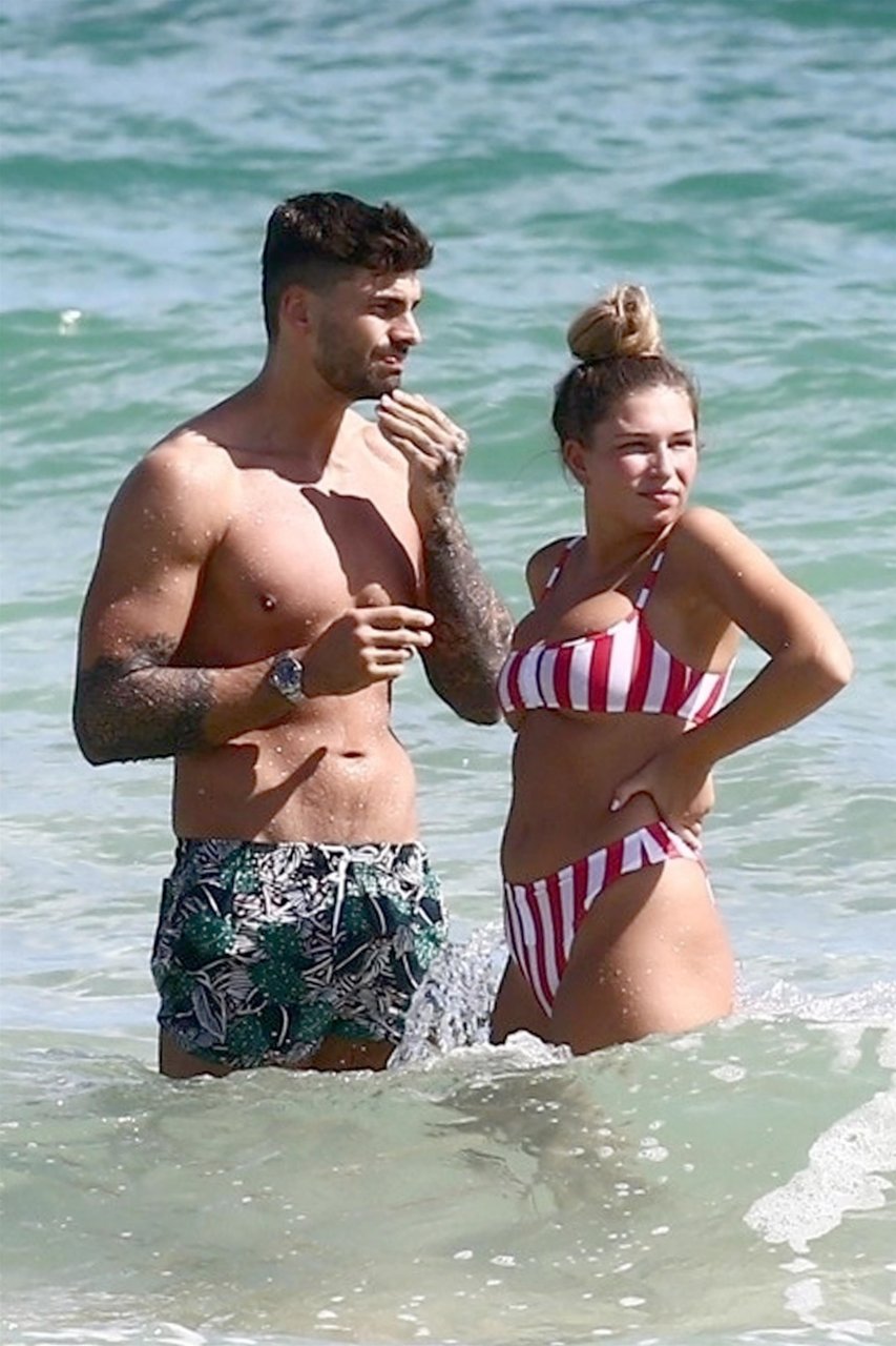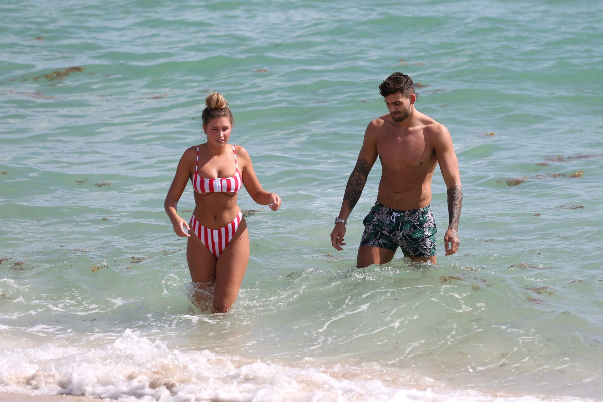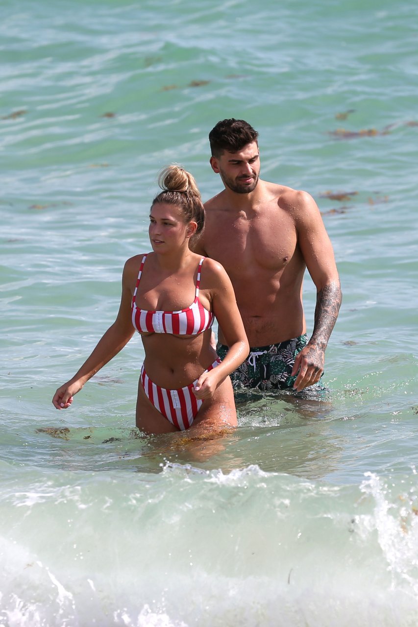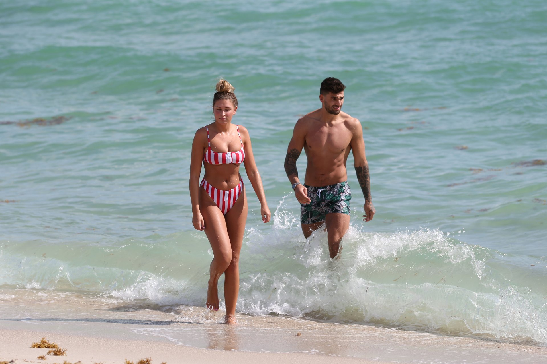 Zara impressionou Adam com uma viagem de aniversário para Miami e as Bahamas e hoje foi a primeira manhã deles ao sol. O casal de reality show que se conheceu no programa de sucesso parecia tão apaixonado como sempre enquanto demonstravam afeto público ao se refrescarem no oceano. Zara exibiu um underboob acentuado em um biquíni muito justo listrado vermelho e branco.