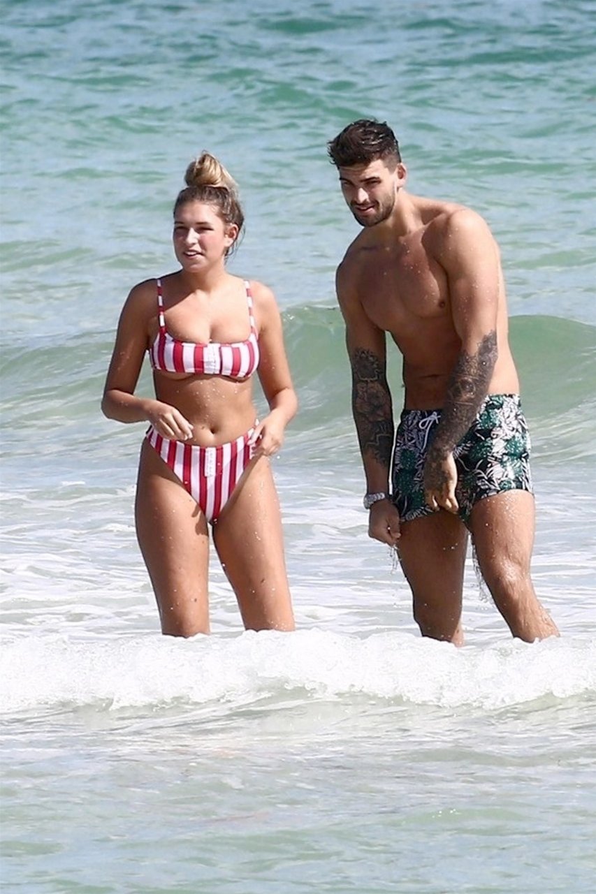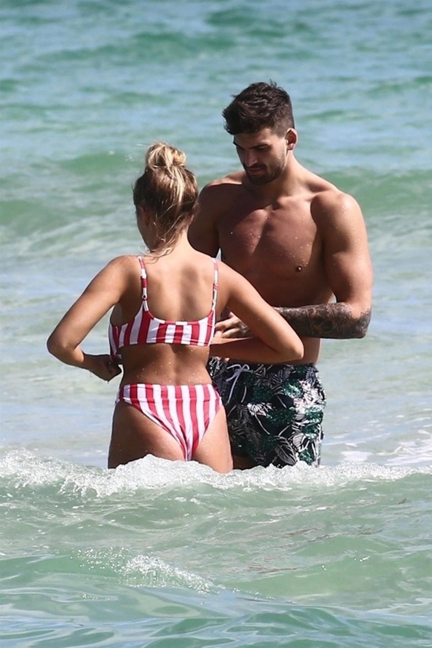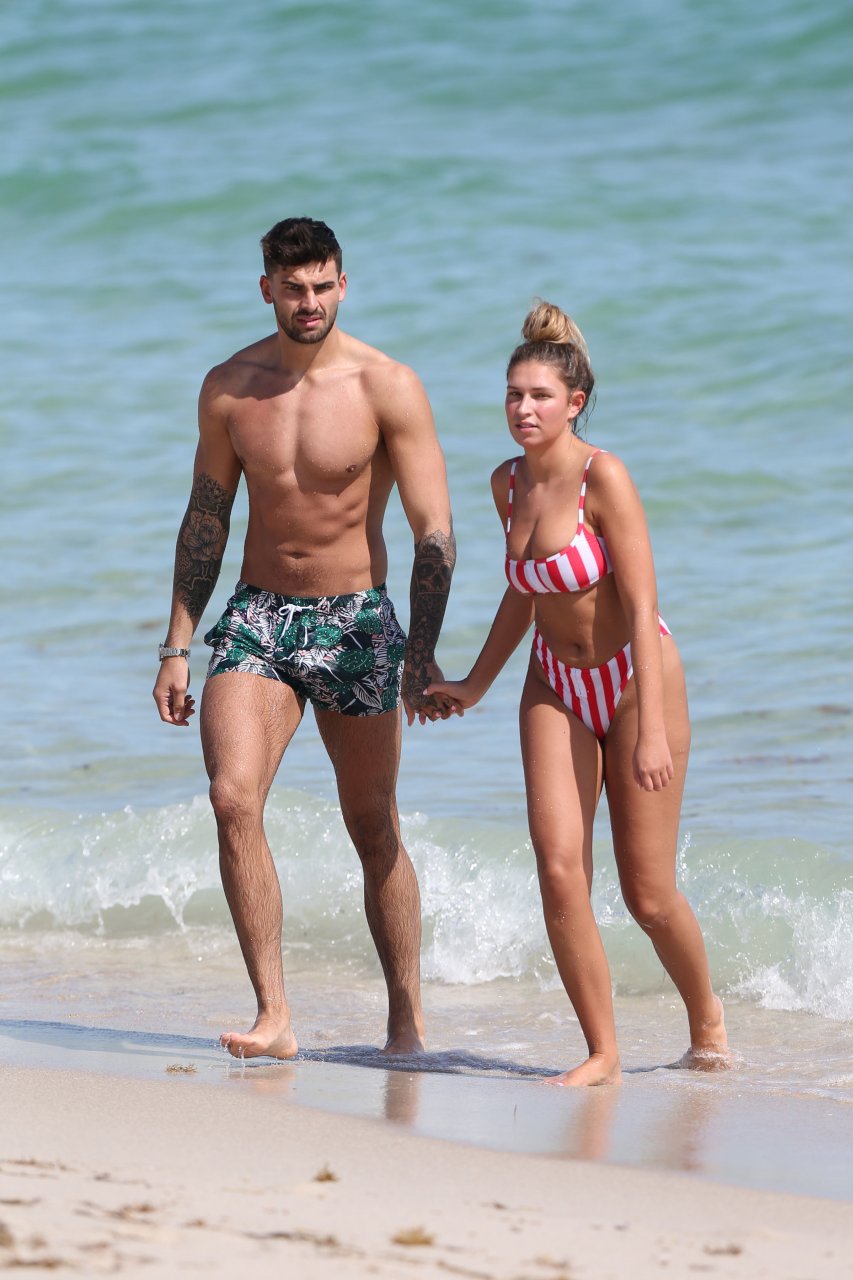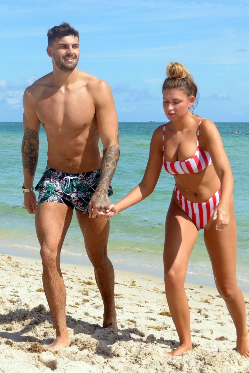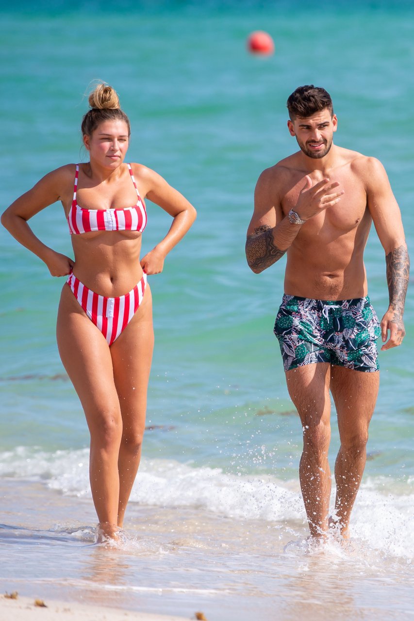 Zara impressionou Adam com uma viagem de aniversário para Miami e as Bahamas e hoje foi a primeira manhã deles ao sol. O casal de reality show que se conheceu no programa de sucesso parecia tão apaixonado como sempre enquanto demonstravam afeto público ao se refrescarem no oceano. Zara exibiu um underboob acentuado em um biquíni muito justo listrado vermelho e branco.