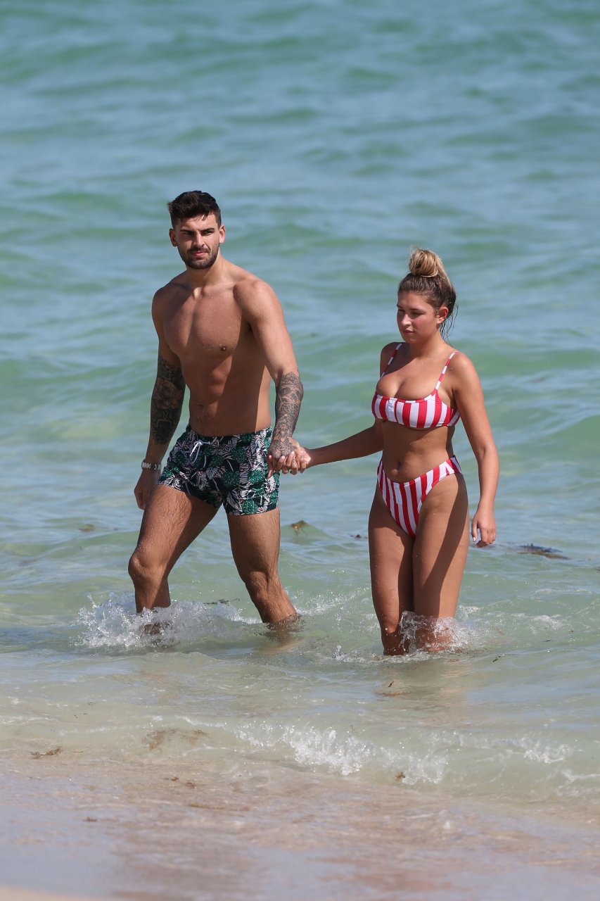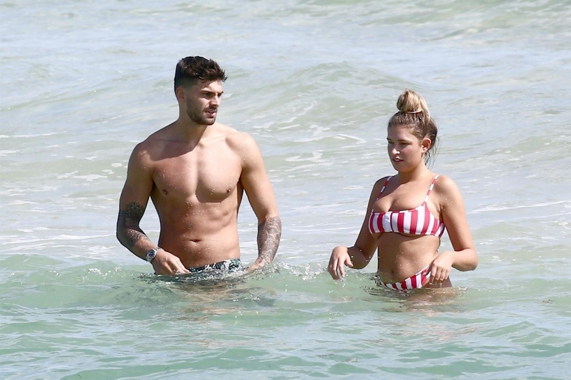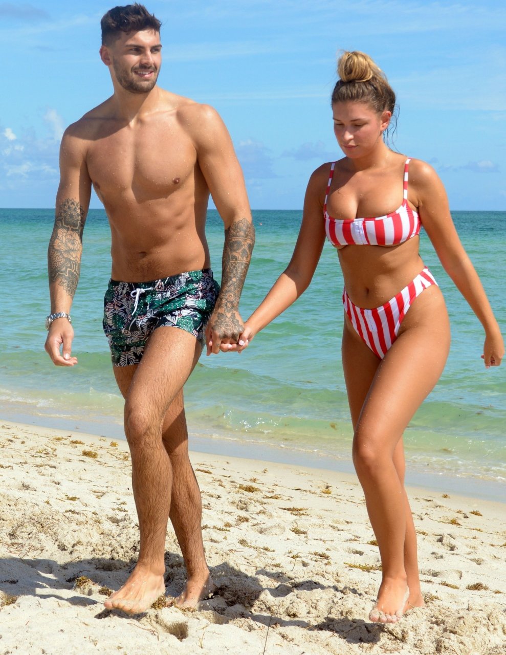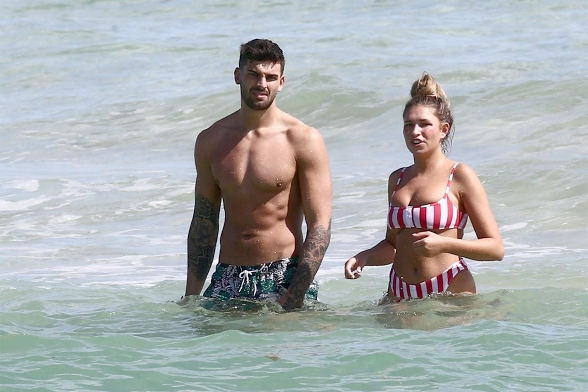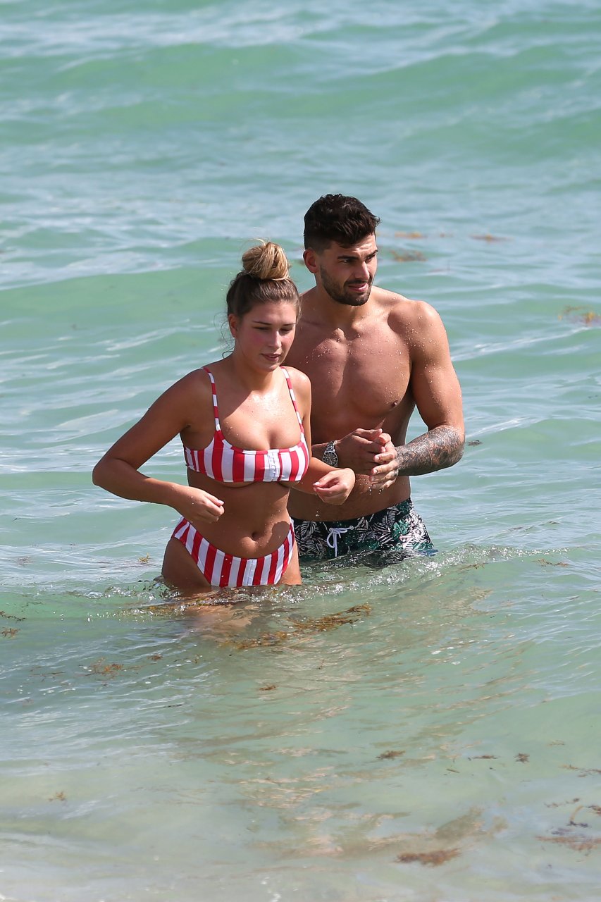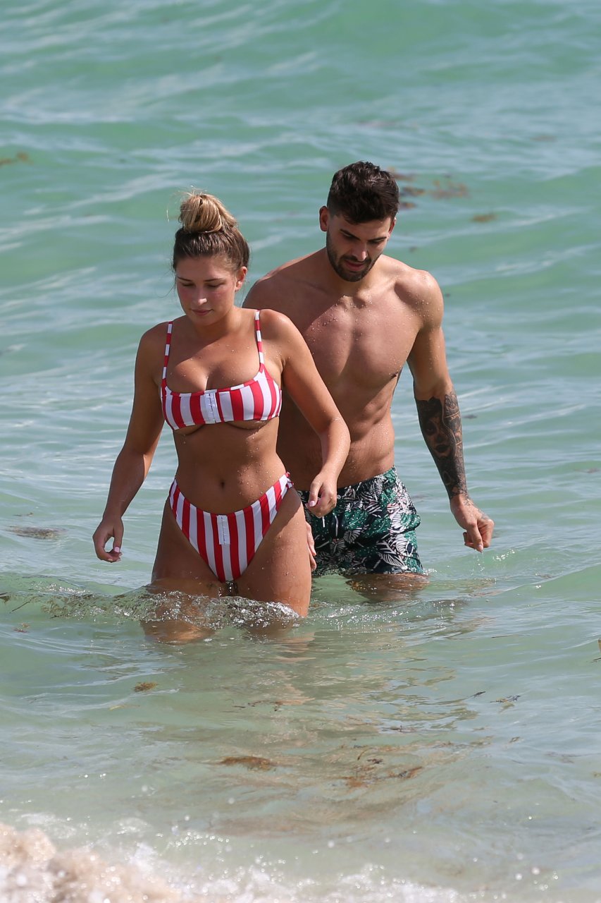 Zara impressionou Adam com uma viagem de aniversário para Miami e as Bahamas e hoje foi a primeira manhã deles ao sol. O casal de reality show que se conheceu no programa de sucesso parecia tão apaixonado como sempre enquanto demonstravam afeto público ao se refrescarem no oceano. Zara exibiu um underboob acentuado em um biquíni muito justo listrado vermelho e branco.