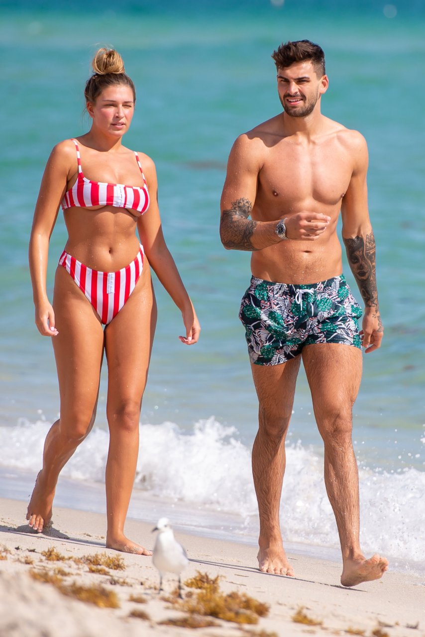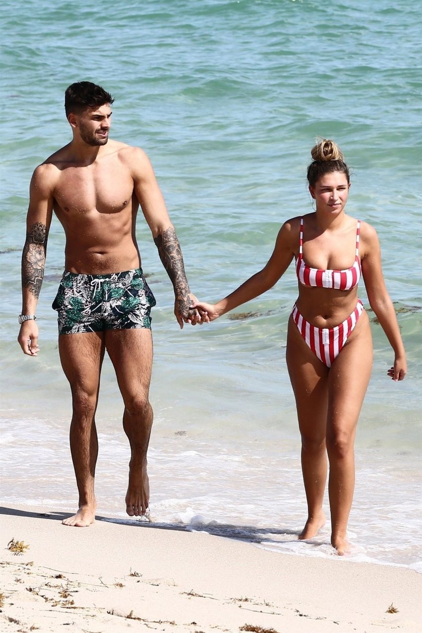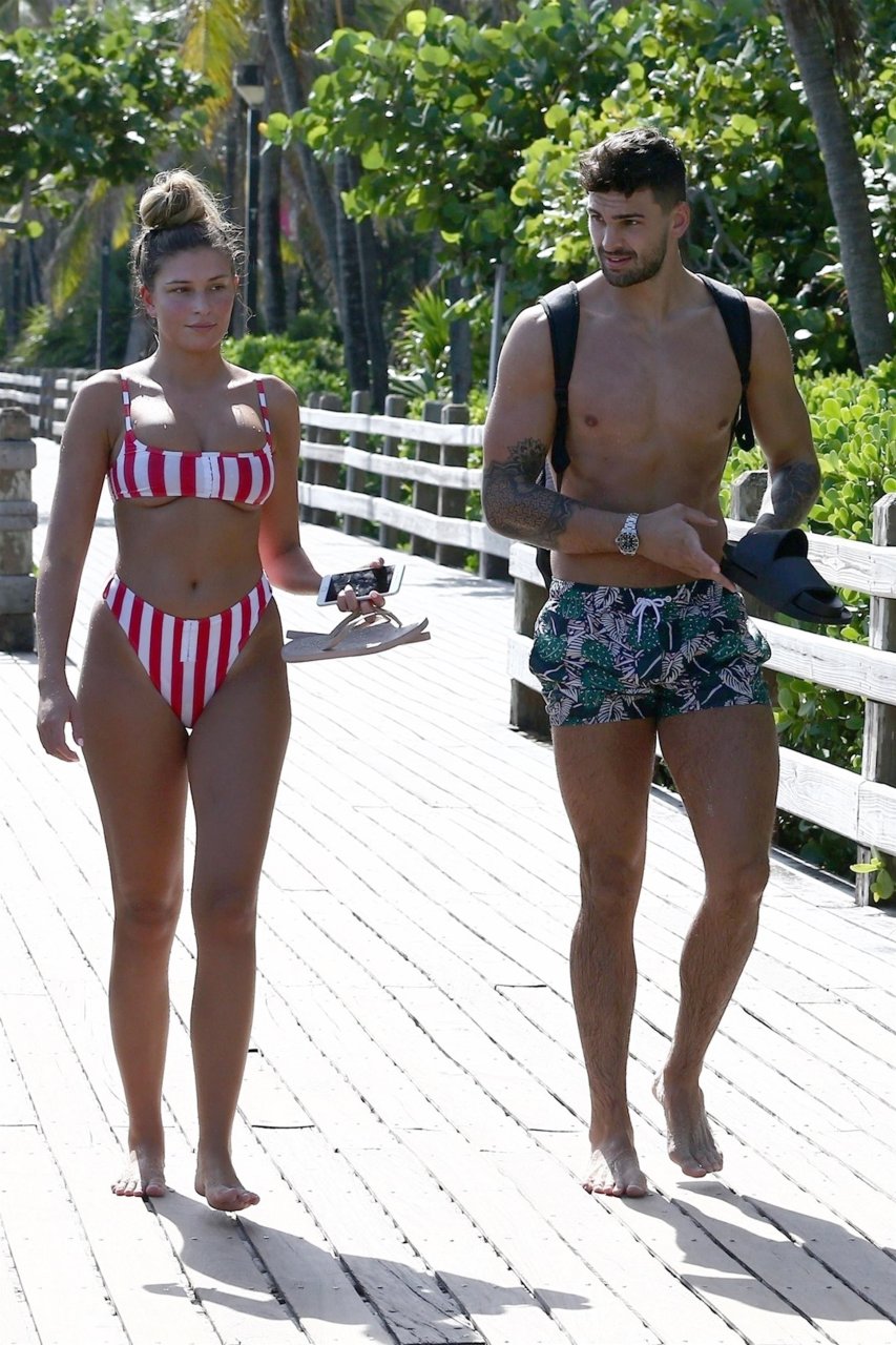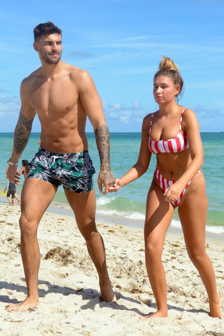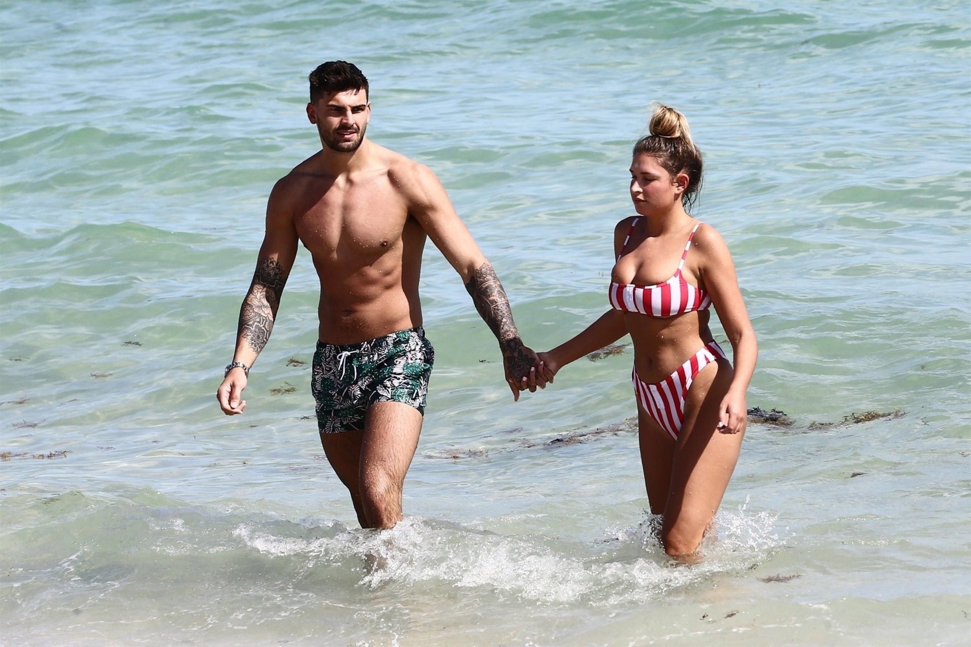 Zara impressionou Adam com uma viagem de aniversário para Miami e as Bahamas e hoje foi a primeira manhã deles ao sol. O casal de reality show que se conheceu no programa de sucesso parecia tão apaixonado como sempre enquanto demonstravam afeto público ao se refrescarem no oceano. Zara exibiu um underboob acentuado em um biquíni muito justo listrado vermelho e branco.