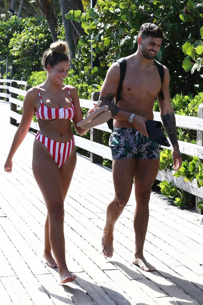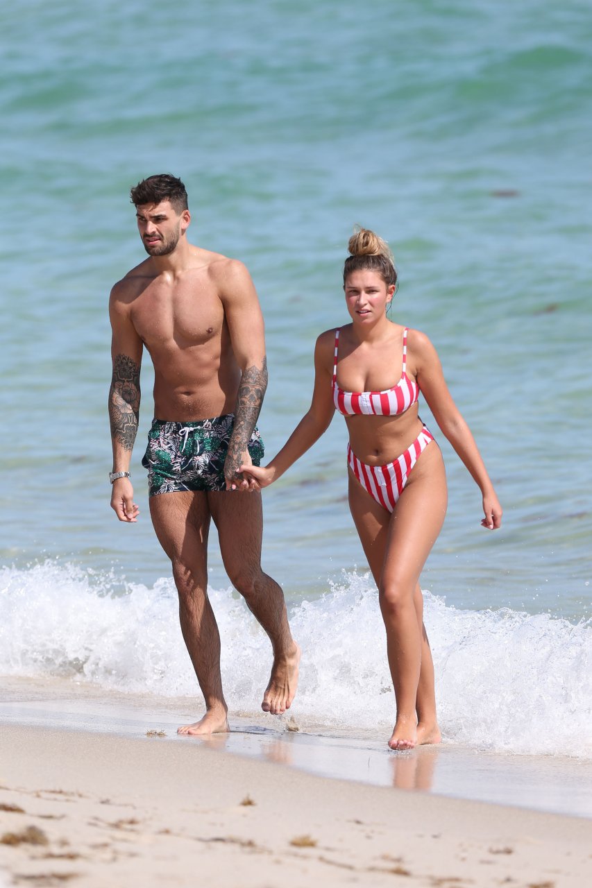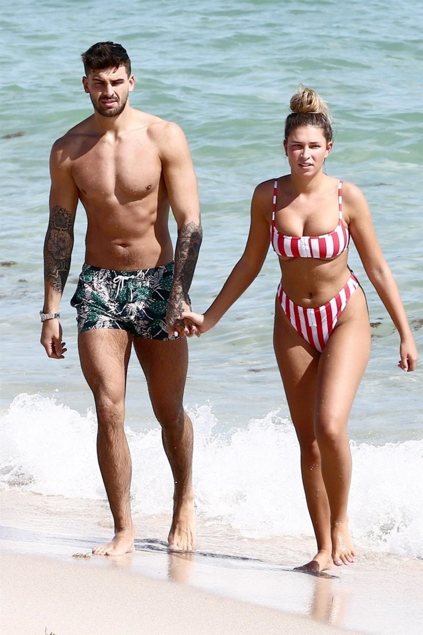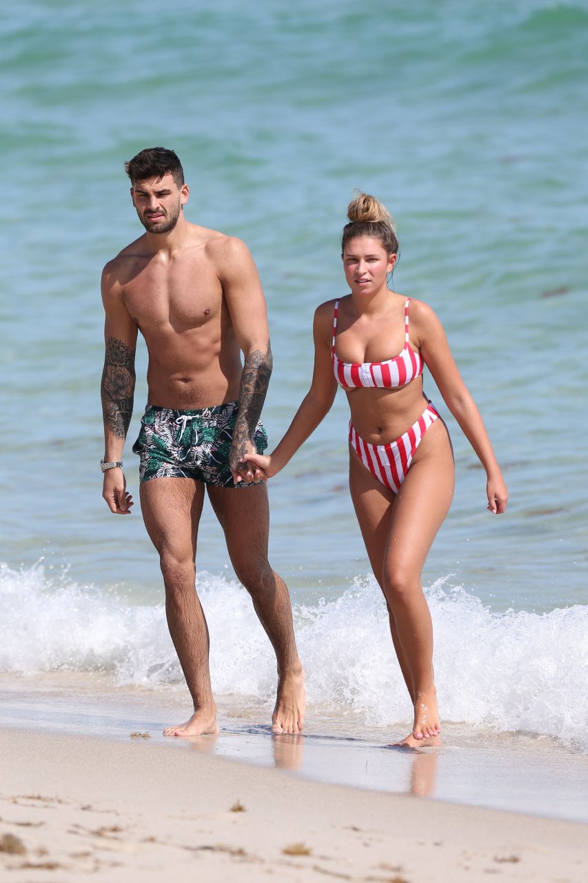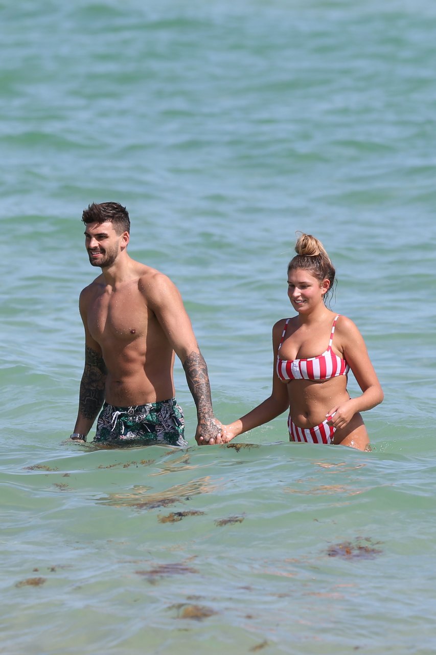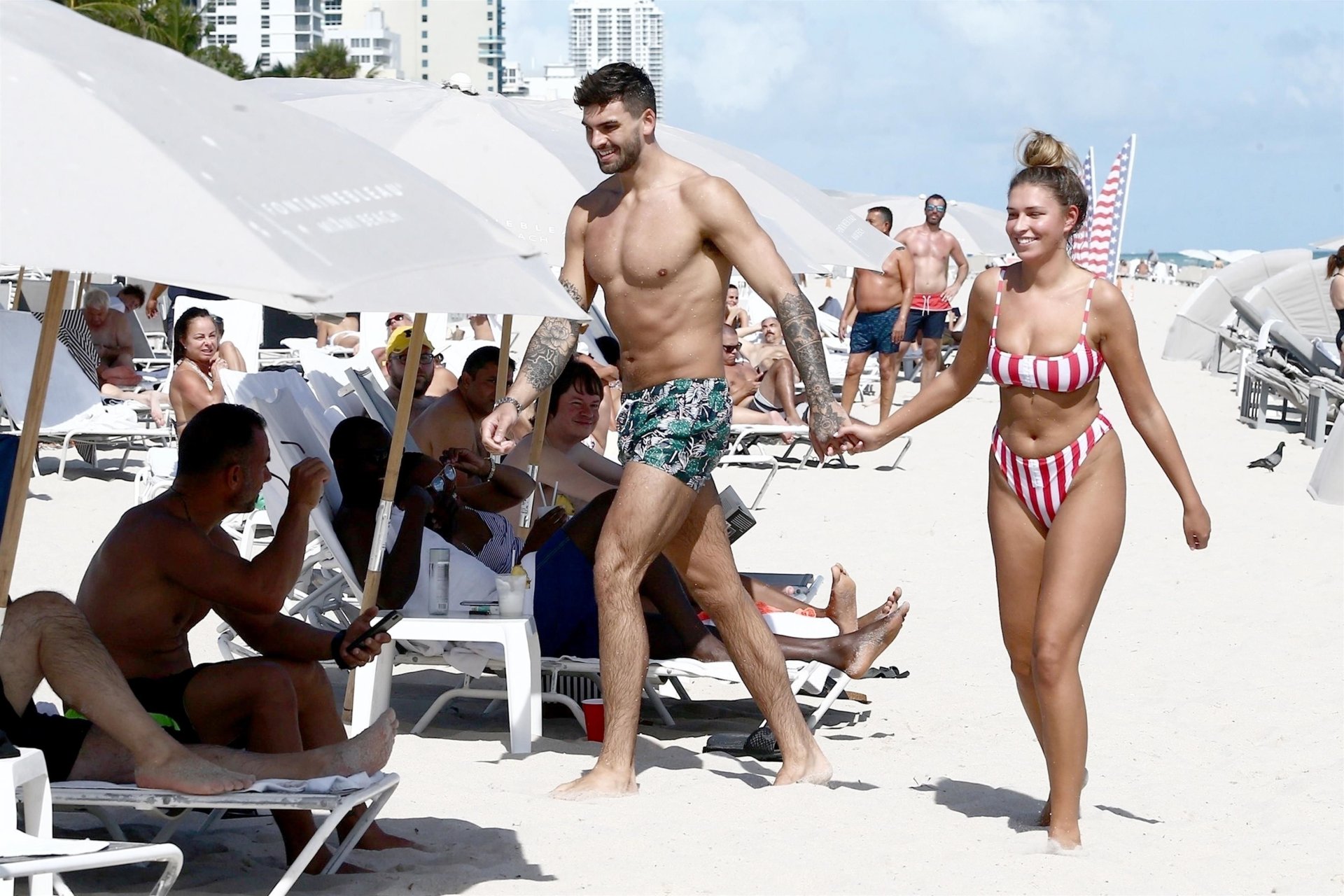 Zara impressionou Adam com uma viagem de aniversário para Miami e as Bahamas e hoje foi a primeira manhã deles ao sol. O casal de reality show que se conheceu no programa de sucesso parecia tão apaixonado como sempre enquanto demonstravam afeto público ao se refrescarem no oceano. Zara exibiu um underboob acentuado em um biquíni muito justo listrado vermelho e branco.