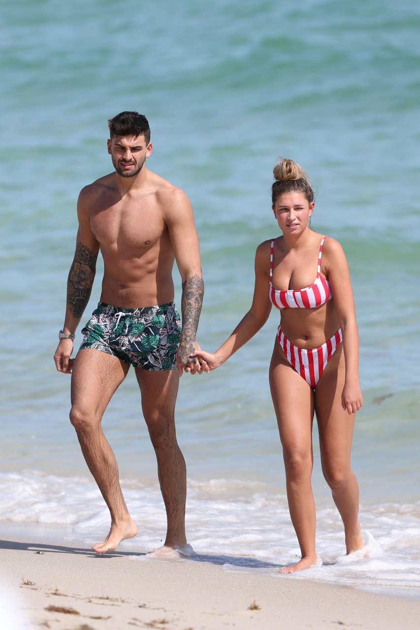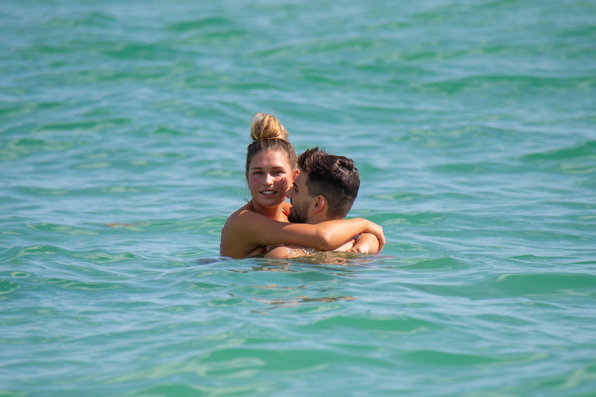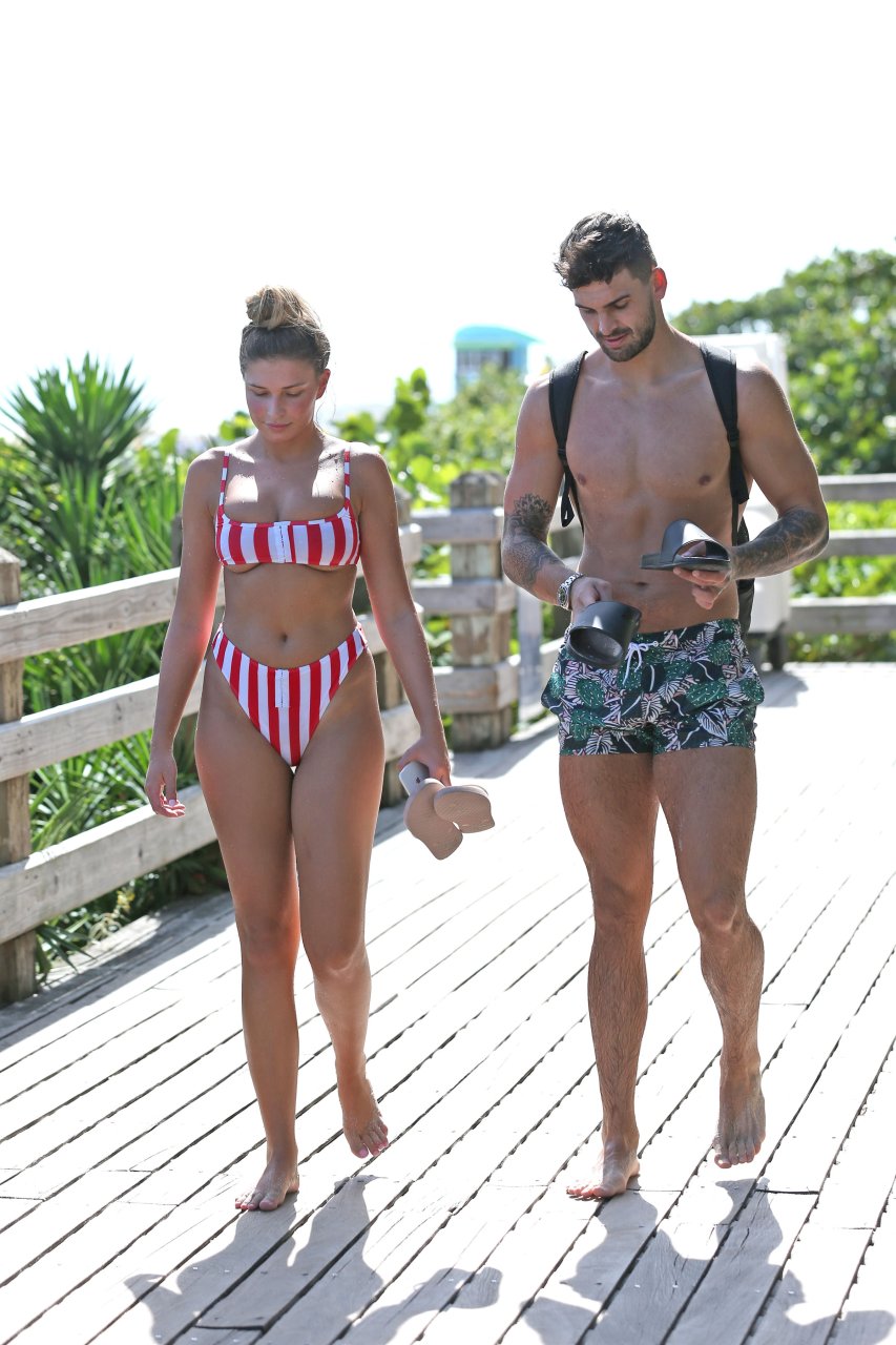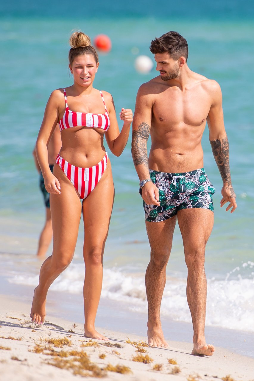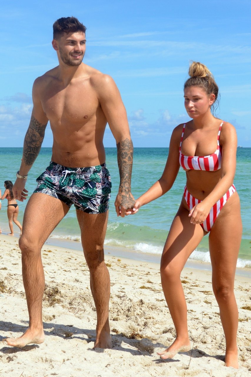 Zara impressionou Adam com uma viagem de aniversário para Miami e as Bahamas e hoje foi a primeira manhã deles ao sol. O casal de reality show que se conheceu no programa de sucesso parecia tão apaixonado como sempre enquanto demonstravam afeto público ao se refrescarem no oceano. Zara exibiu um underboob acentuado em um biquíni muito justo listrado vermelho e branco.