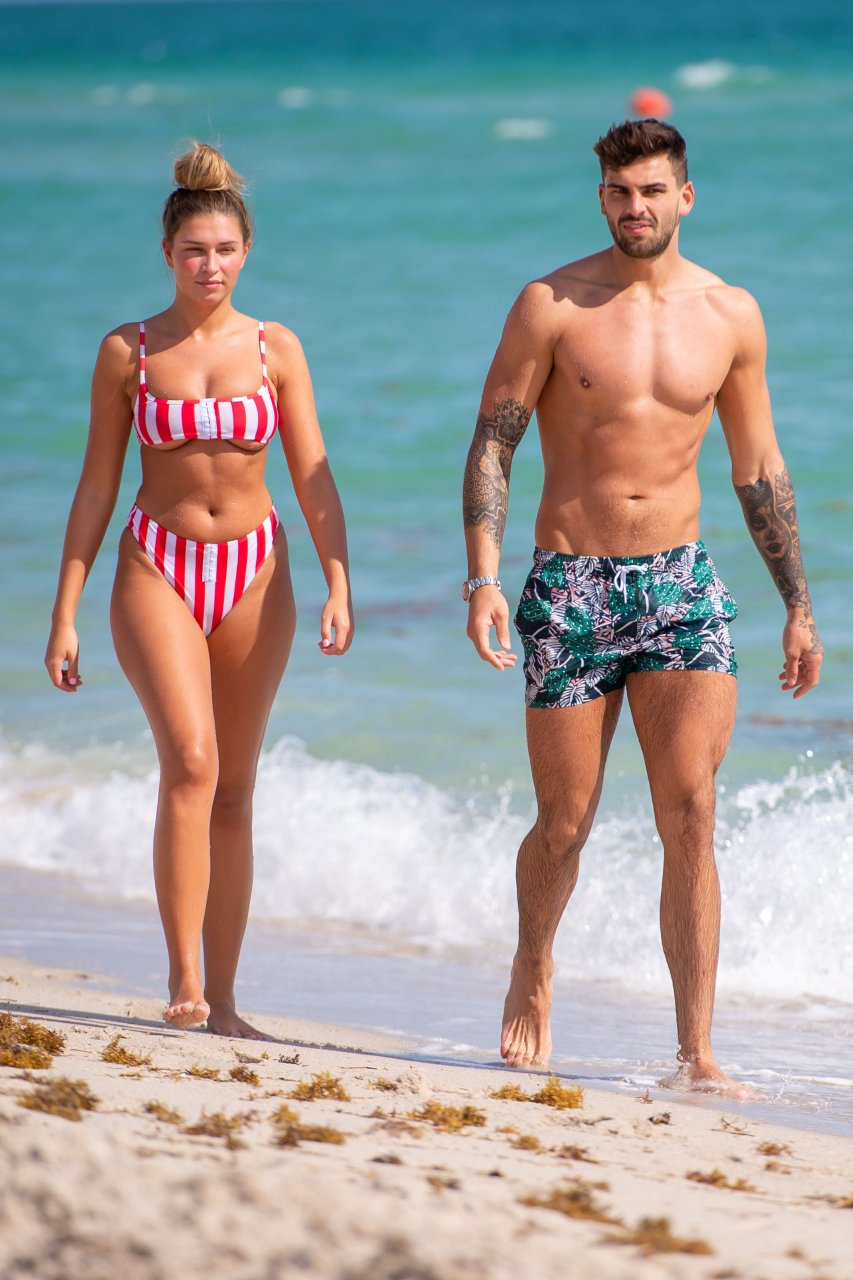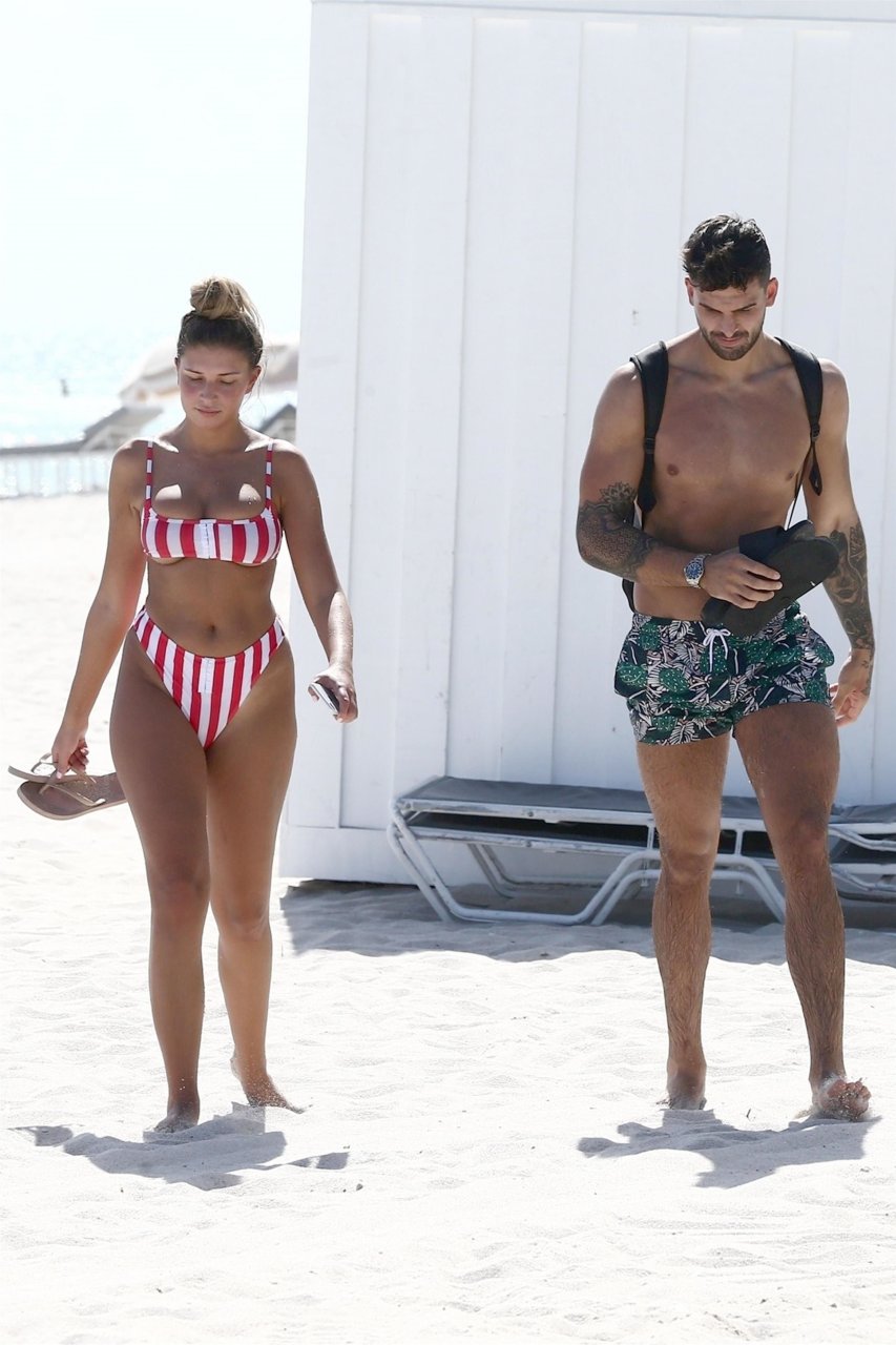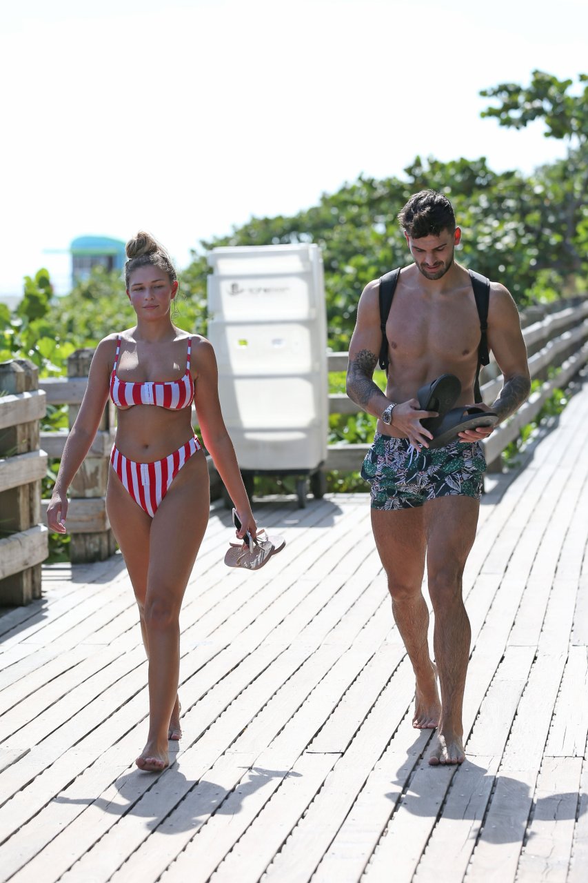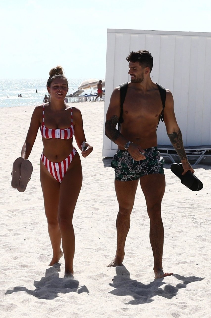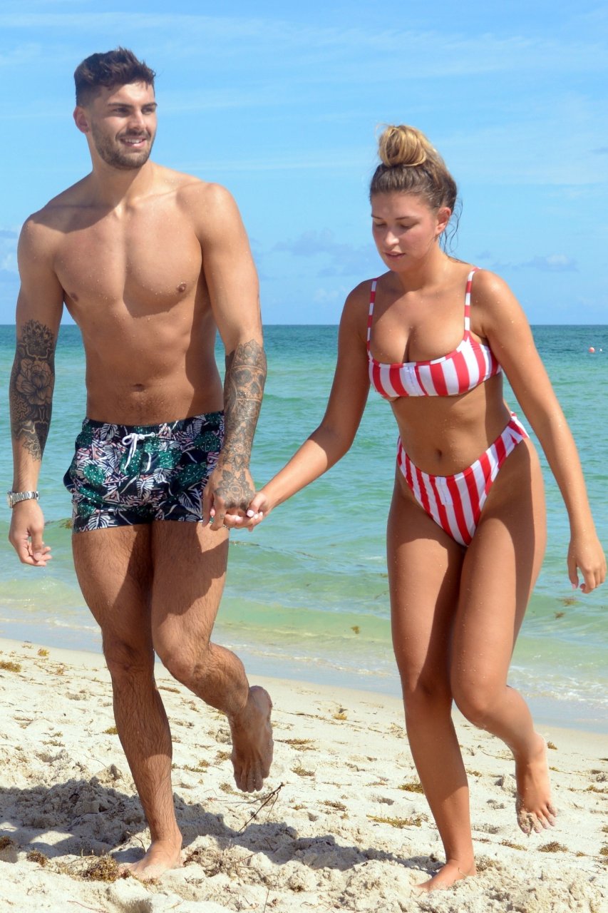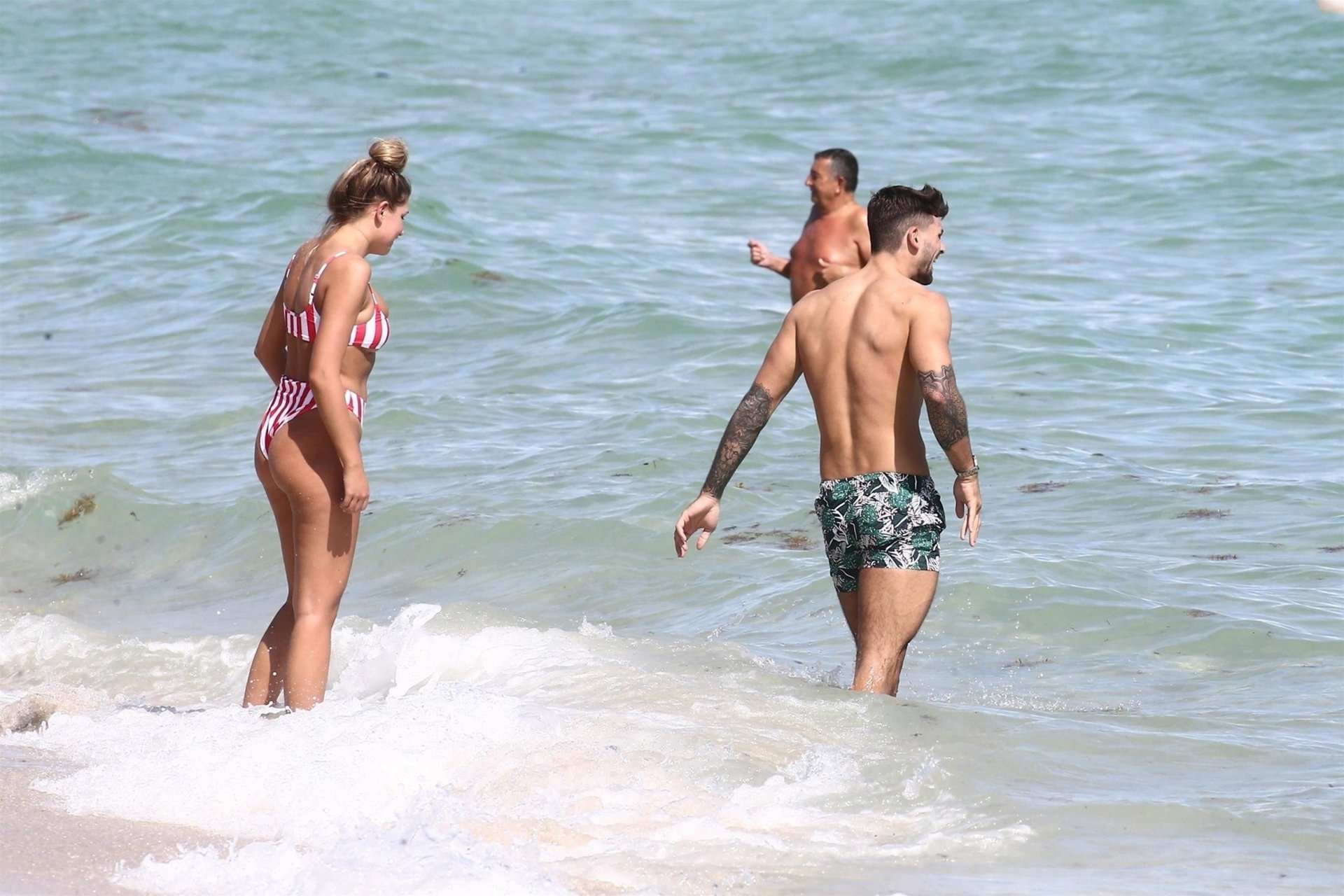 Zara impressionou Adam com uma viagem de aniversário para Miami e as Bahamas e hoje foi a primeira manhã deles ao sol. O casal de reality show que se conheceu no programa de sucesso parecia tão apaixonado como sempre enquanto demonstravam afeto público ao se refrescarem no oceano. Zara exibiu um underboob acentuado em um biquíni muito justo listrado vermelho e branco.