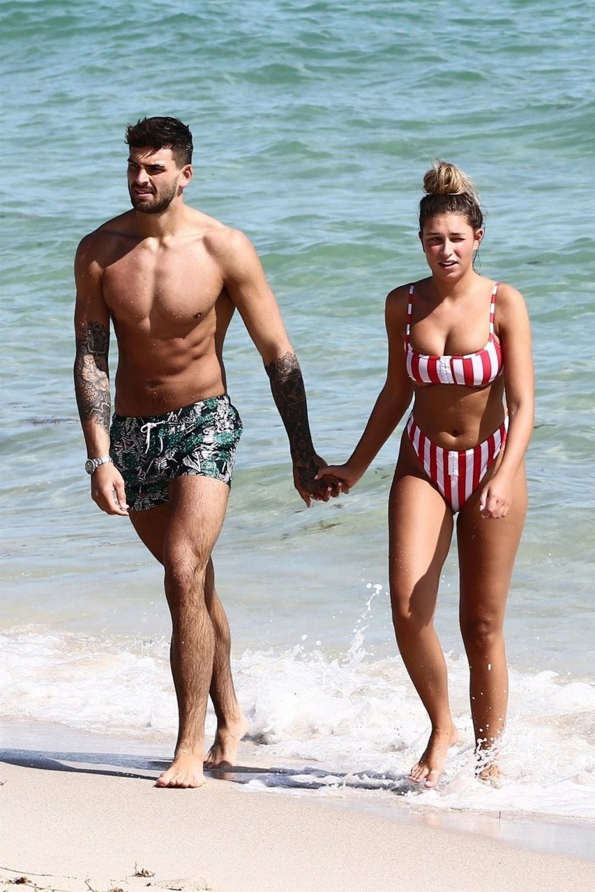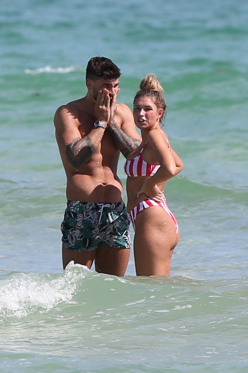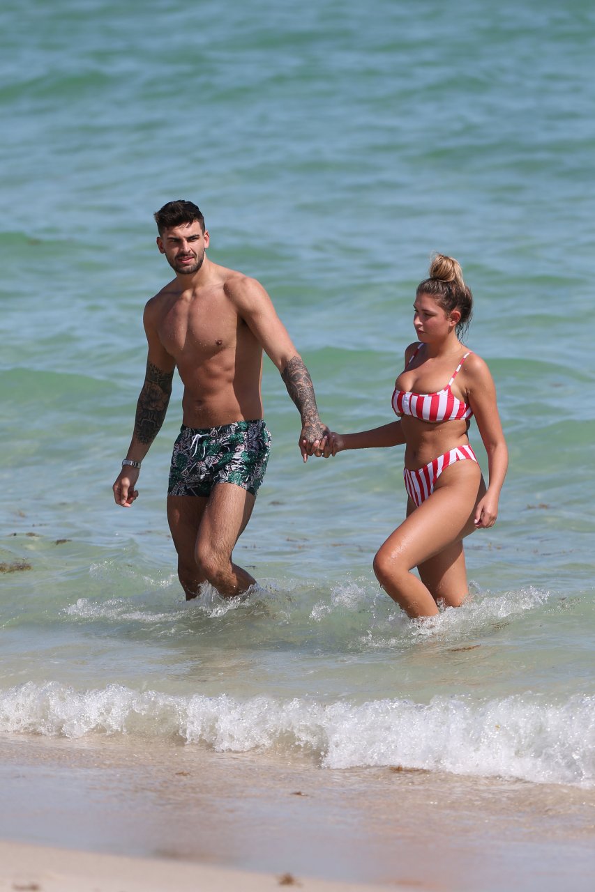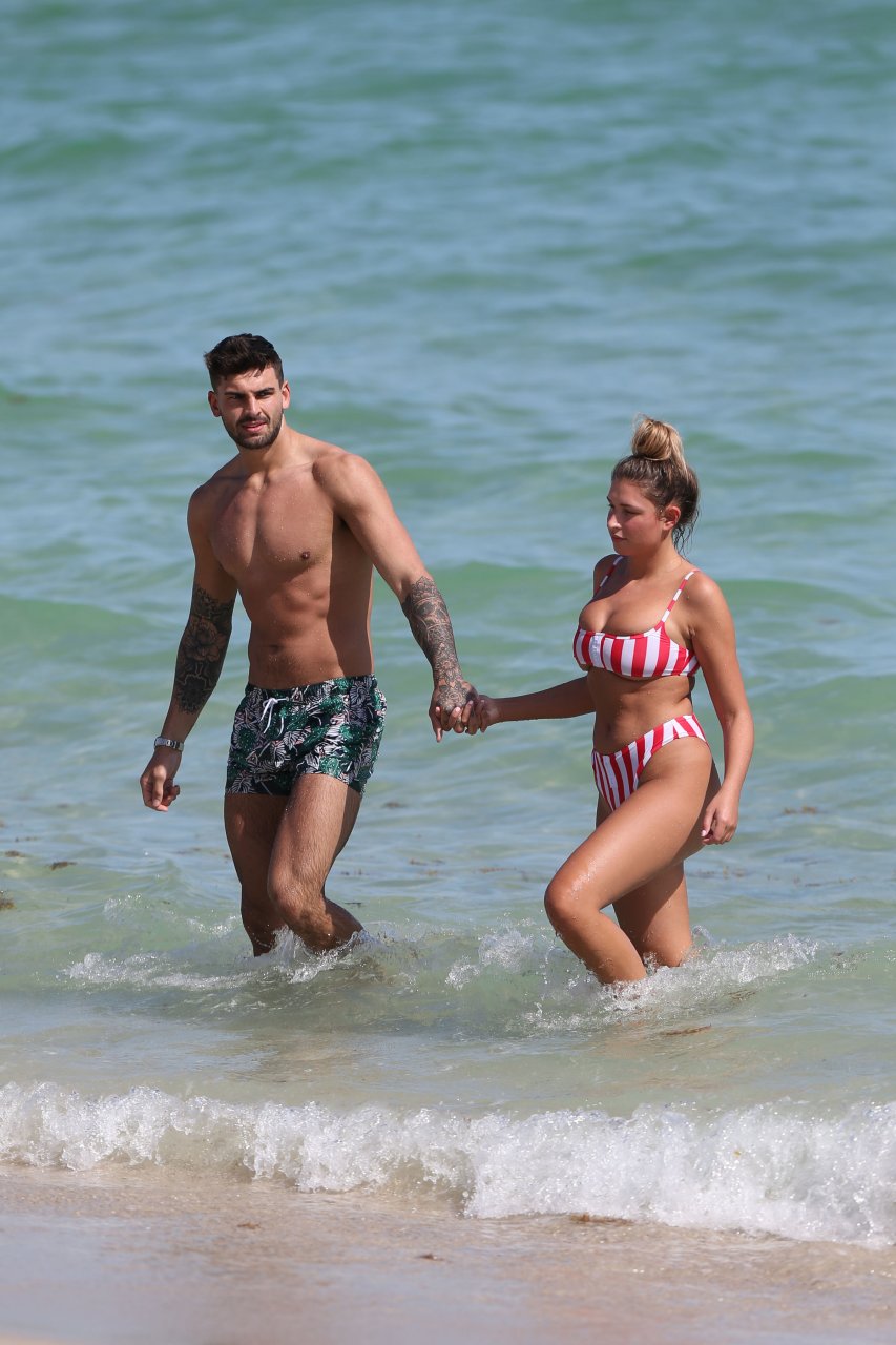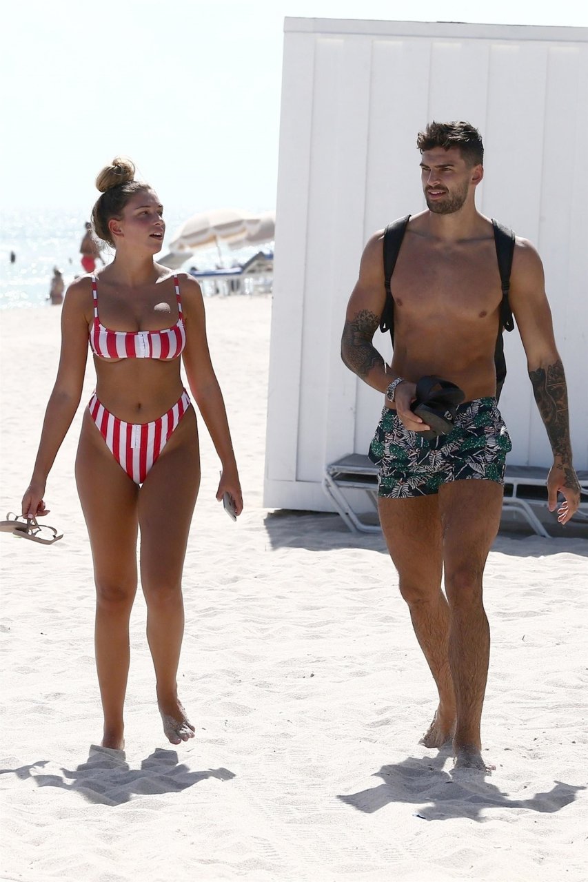 Zara impressionou Adam com uma viagem de aniversário para Miami e as Bahamas e hoje foi a primeira manhã deles ao sol. O casal de reality show que se conheceu no programa de sucesso parecia tão apaixonado como sempre enquanto demonstravam afeto público ao se refrescarem no oceano. Zara exibiu um underboob acentuado em um biquíni muito justo listrado vermelho e branco.