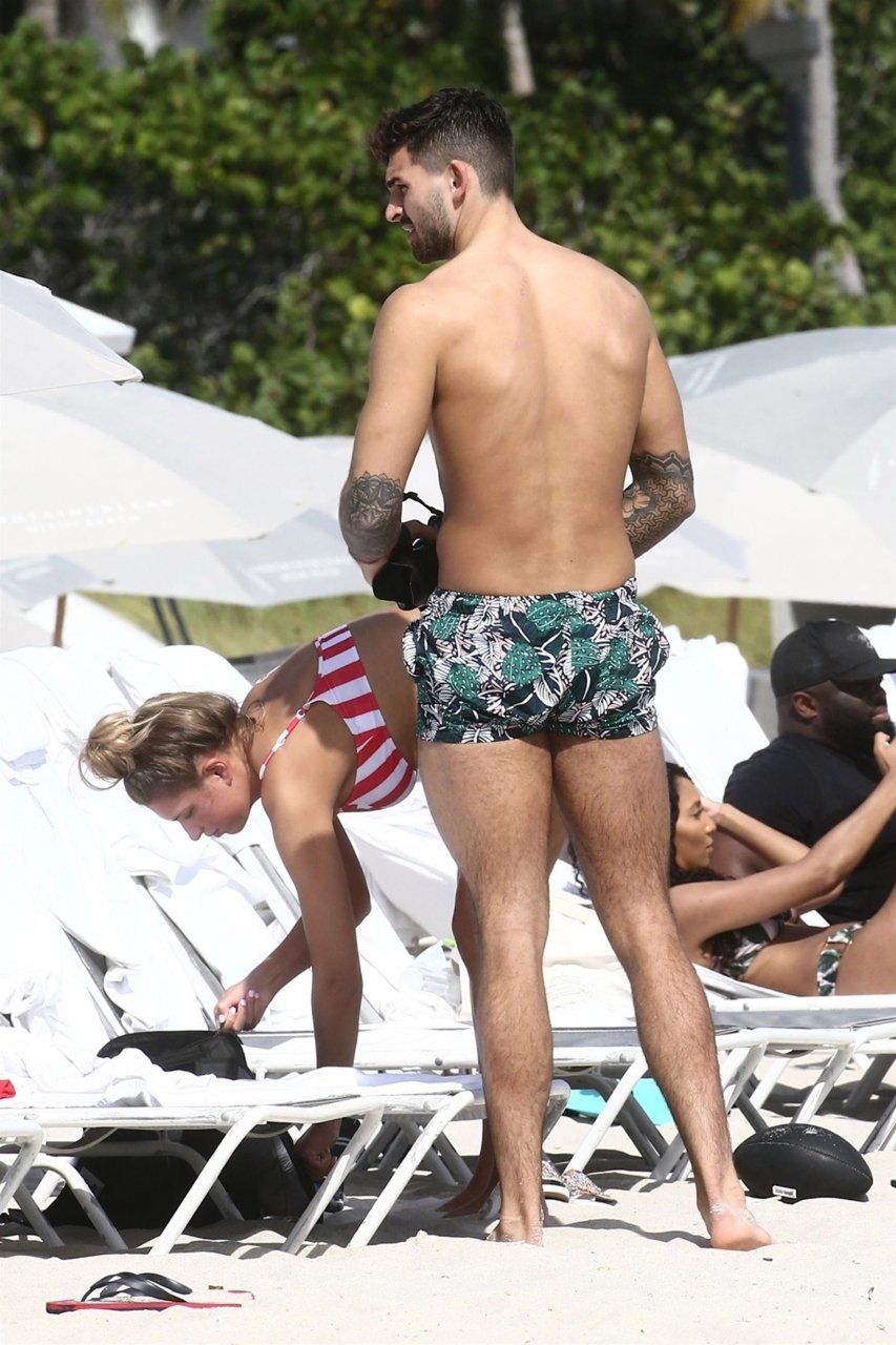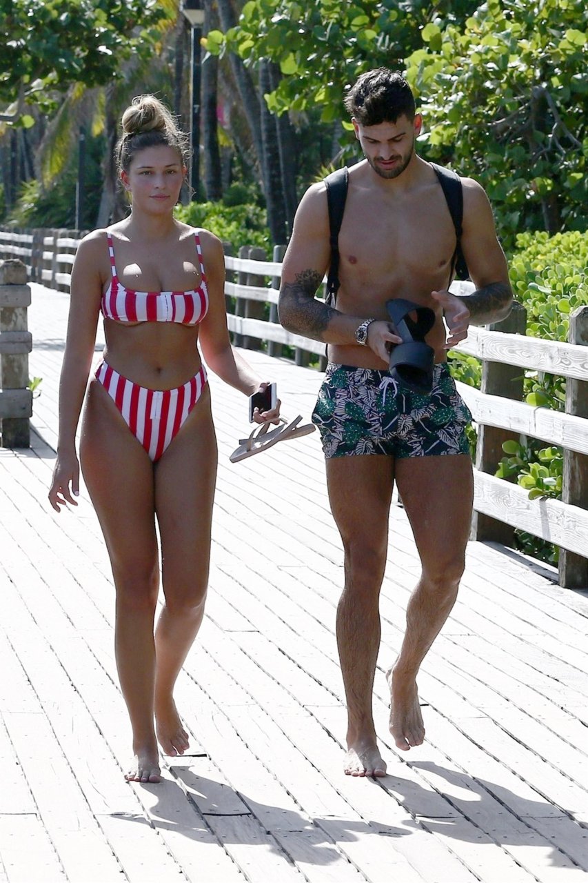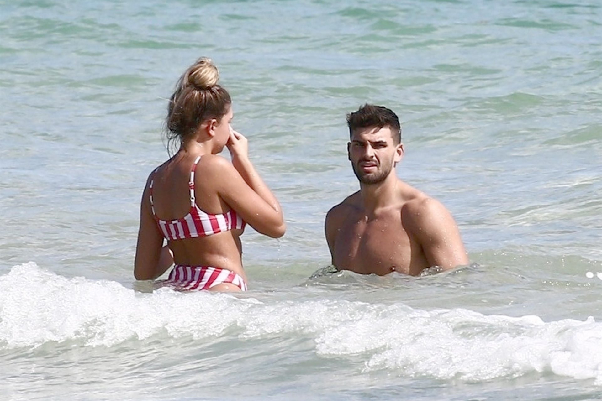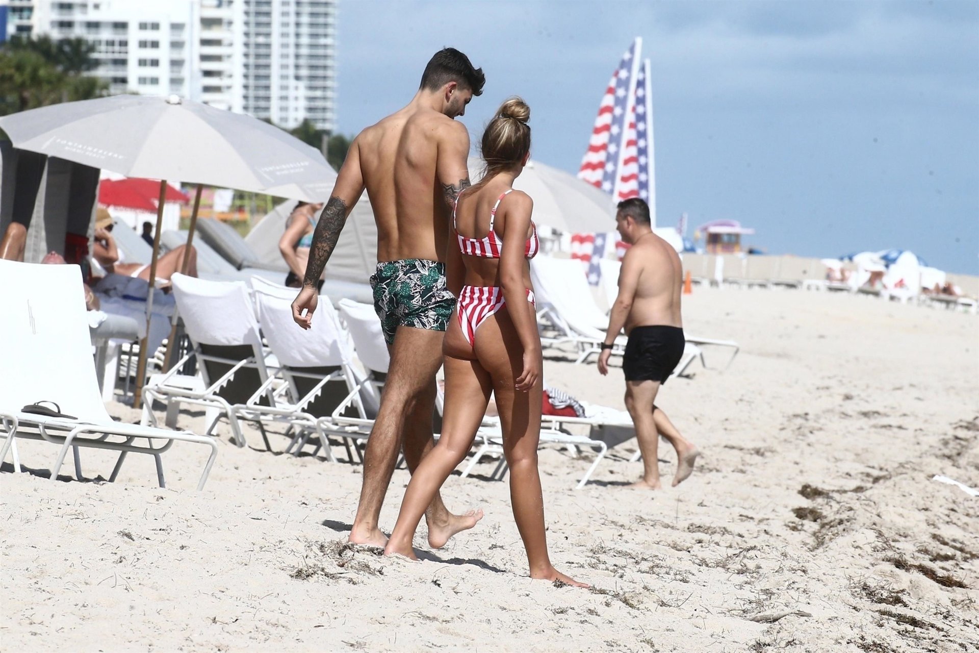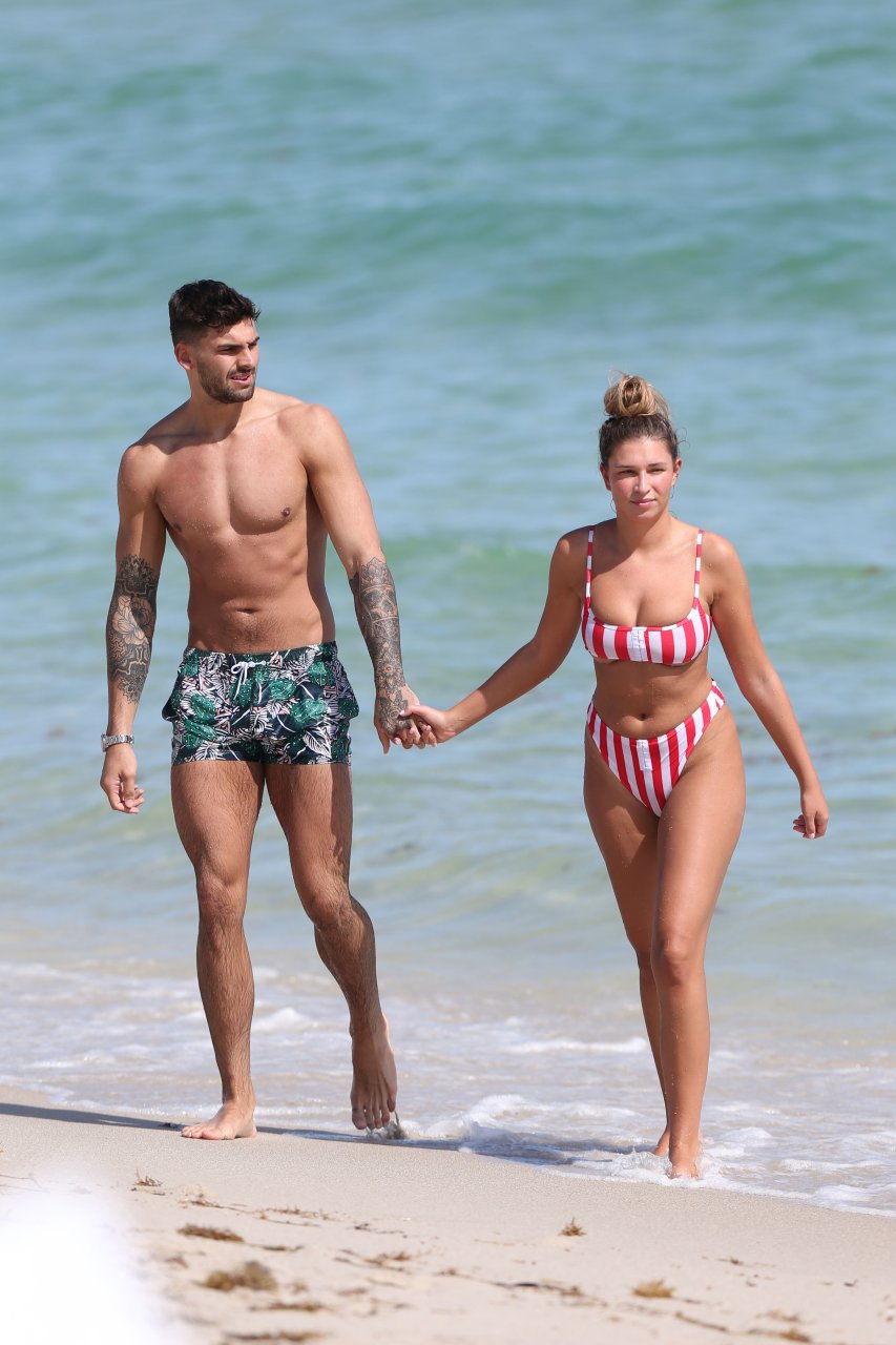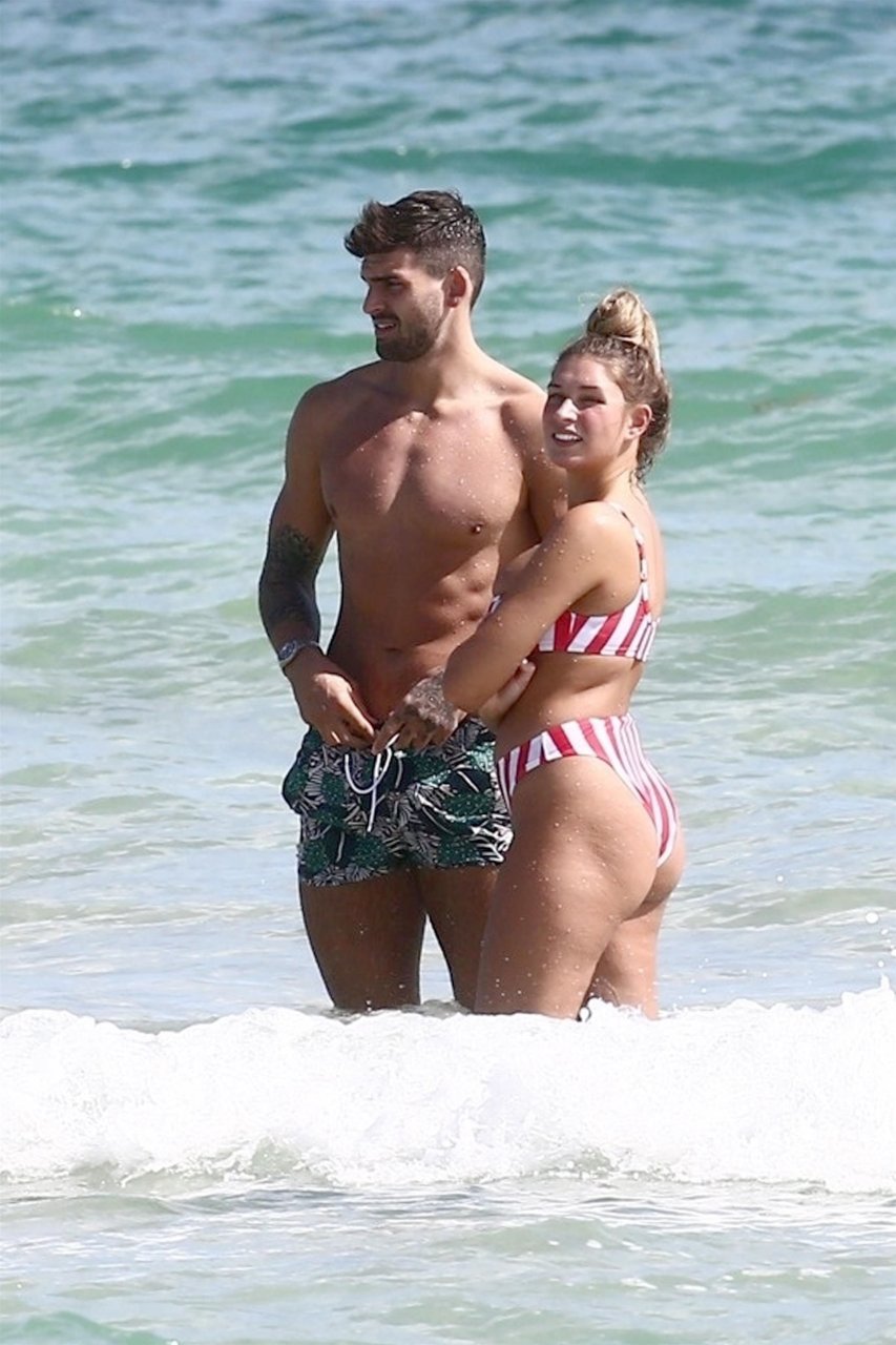 Zara impressionou Adam com uma viagem de aniversário para Miami e as Bahamas e hoje foi a primeira manhã deles ao sol. O casal de reality show que se conheceu no programa de sucesso parecia tão apaixonado como sempre enquanto demonstravam afeto público ao se refrescarem no oceano. Zara exibiu um underboob acentuado em um biquíni muito justo listrado vermelho e branco.