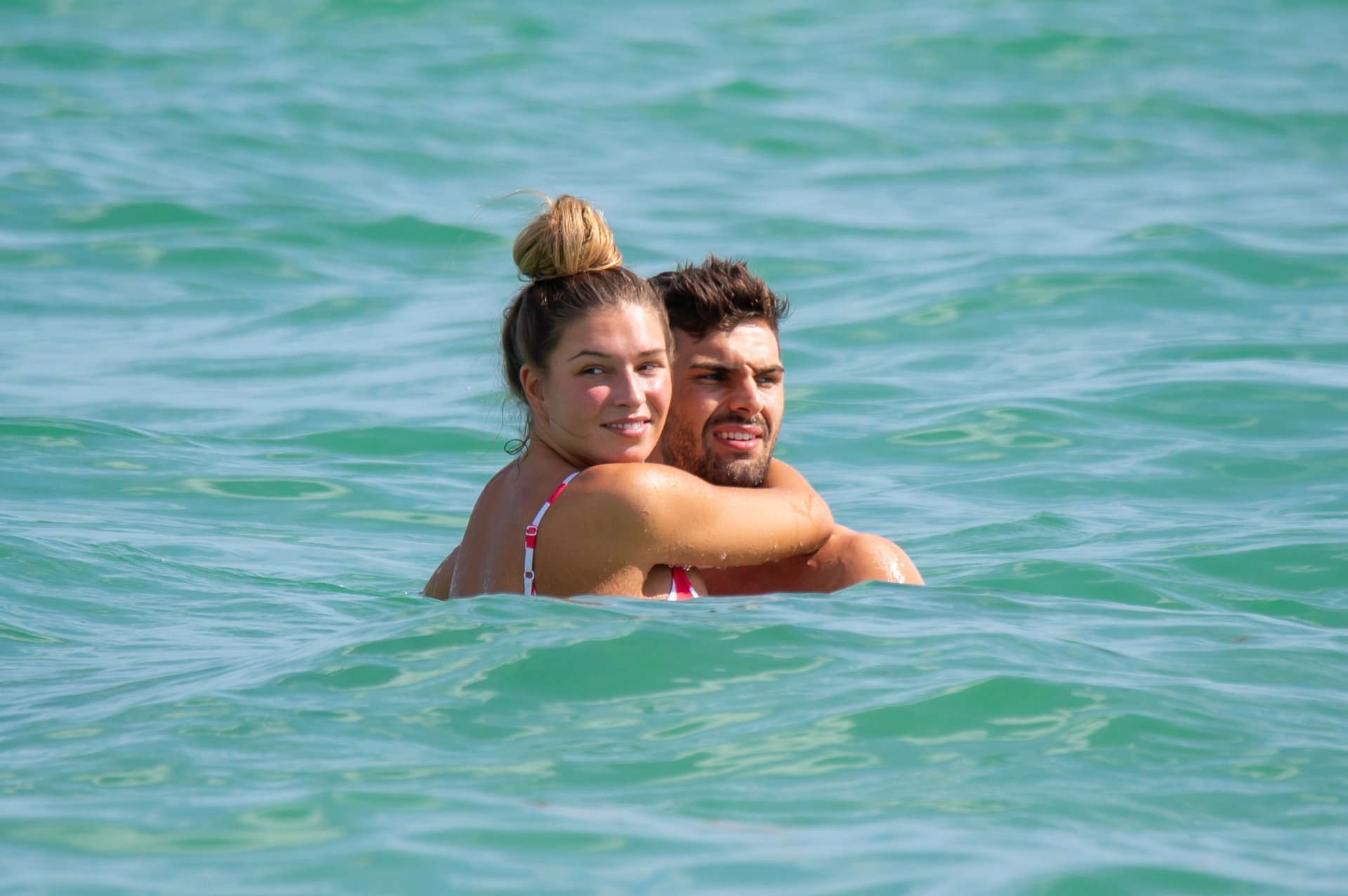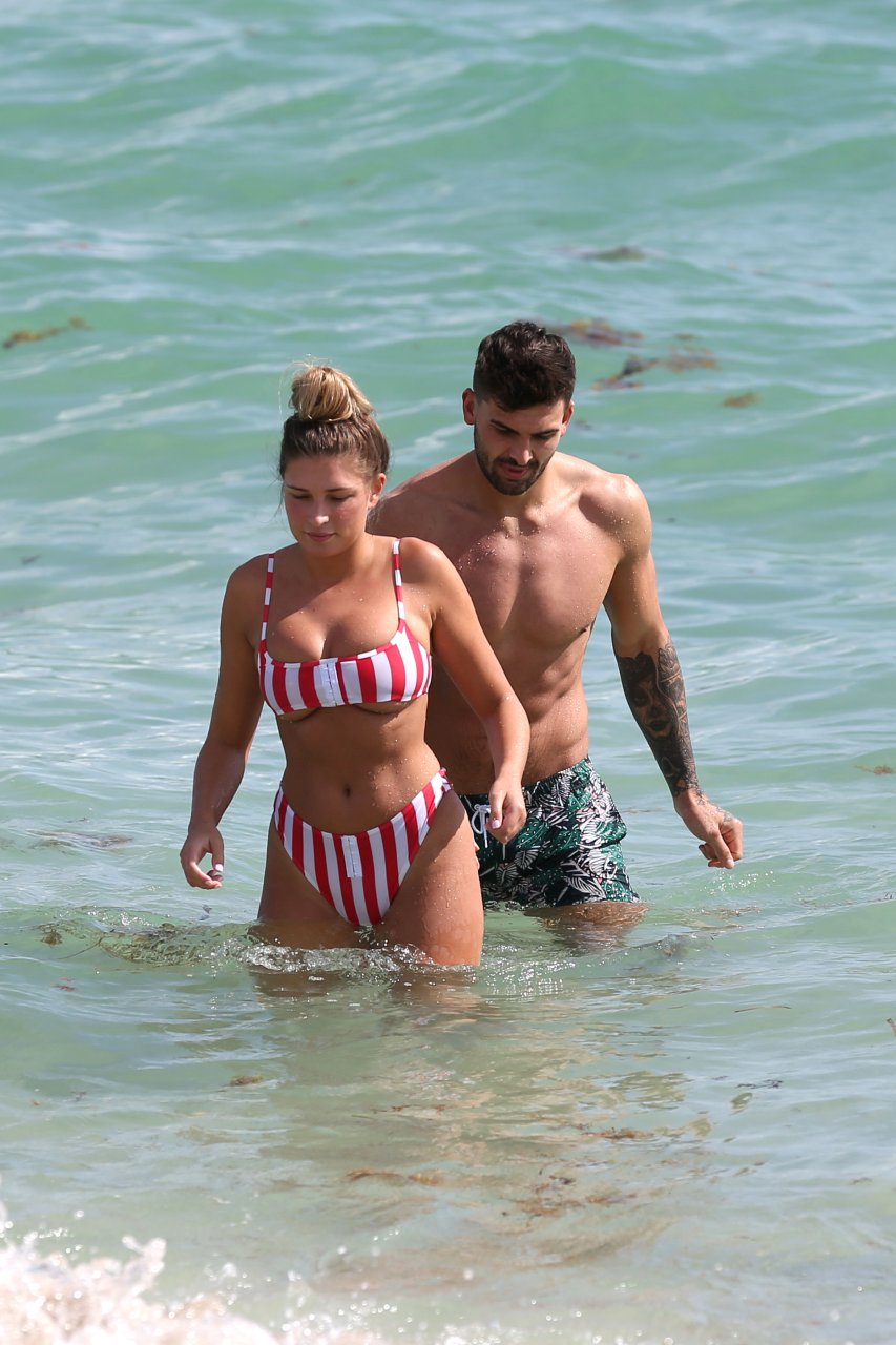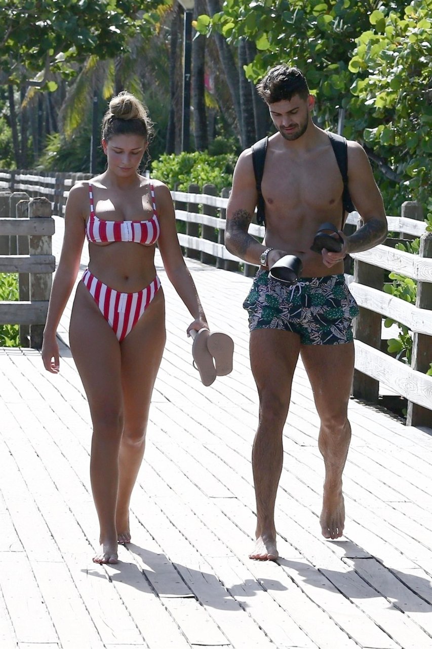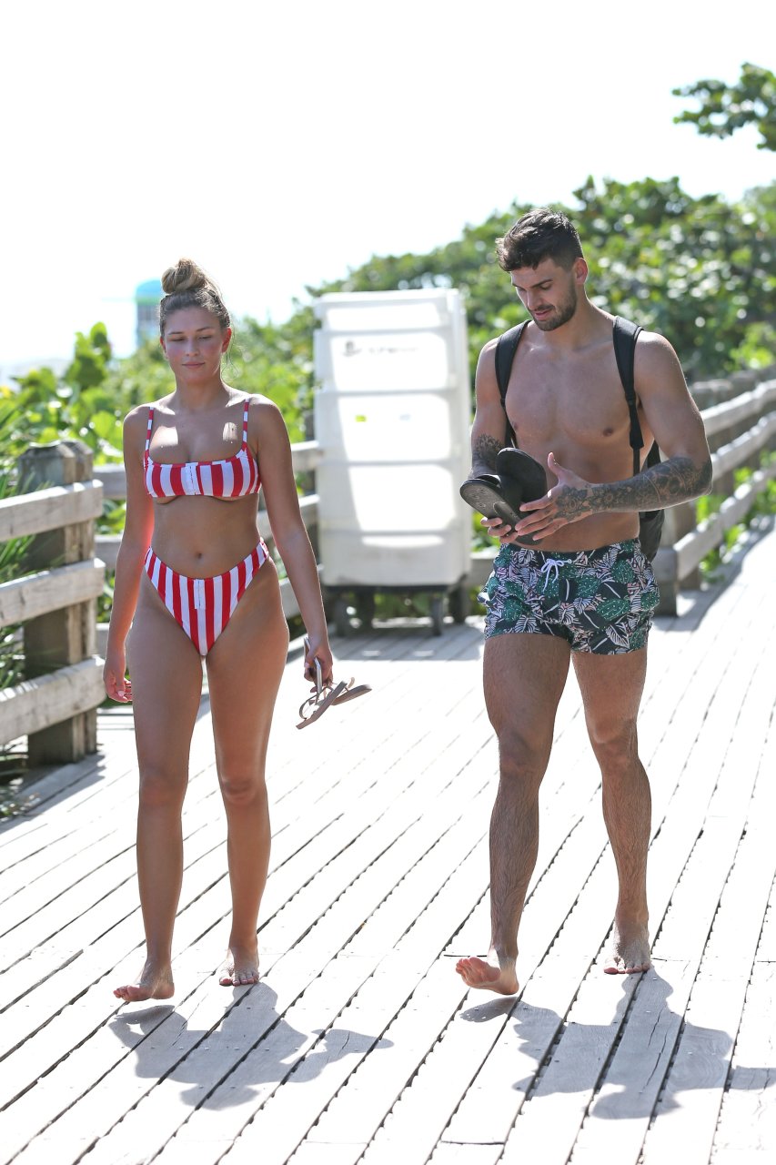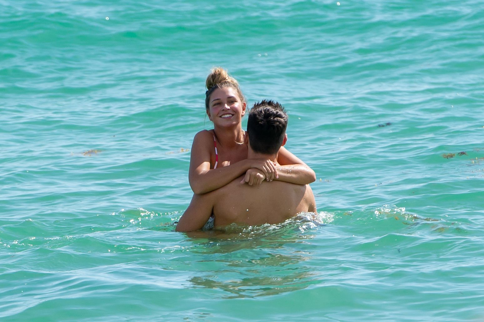Zara impressionou Adam com uma viagem de aniversário para Miami e as Bahamas e hoje foi a primeira manhã deles ao sol. O casal de reality show que se conheceu no programa de sucesso parecia tão apaixonado como sempre enquanto demonstravam afeto público ao se refrescarem no oceano. Zara exibiu um underboob acentuado em um biquíni muito justo listrado vermelho e branco.