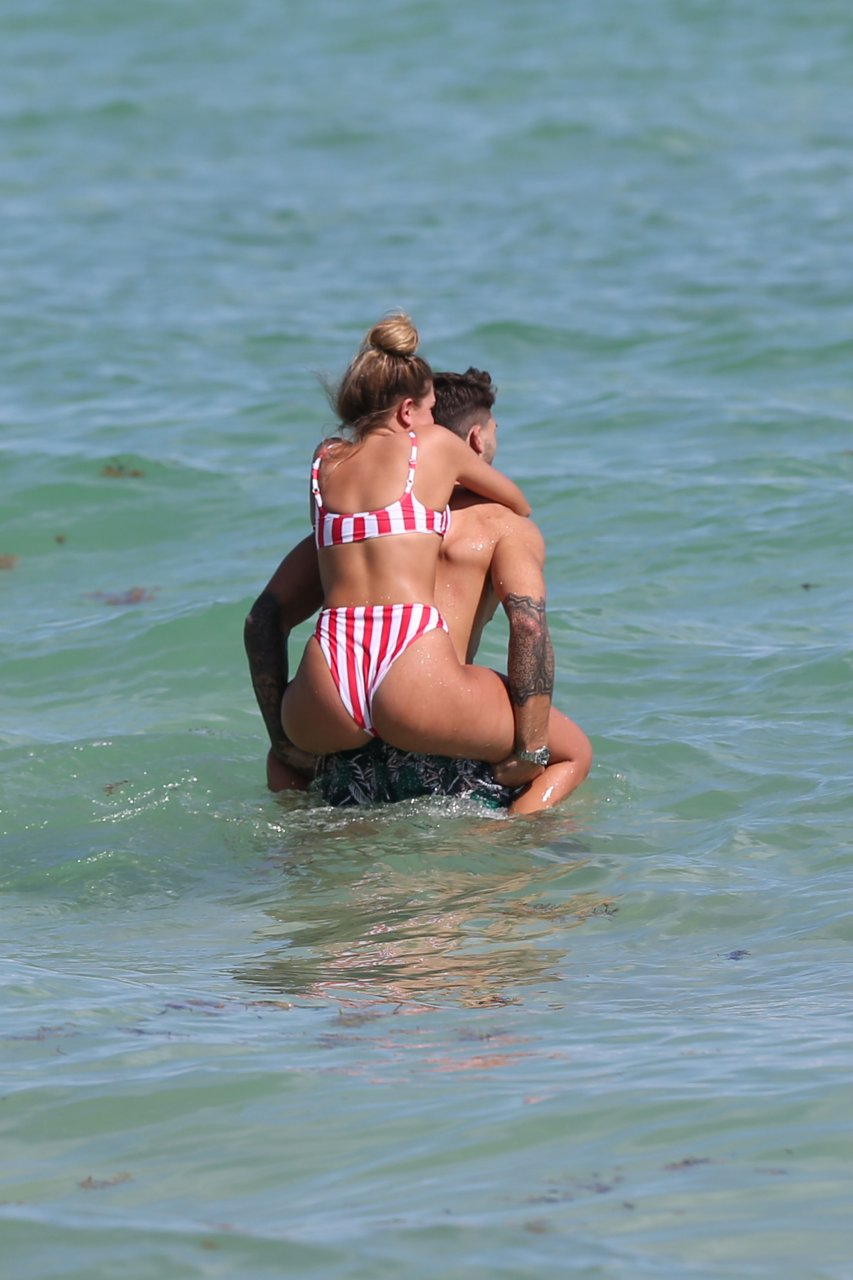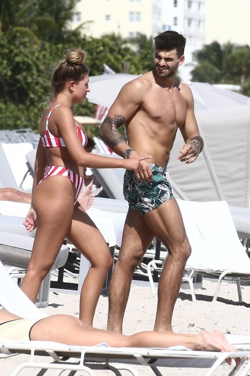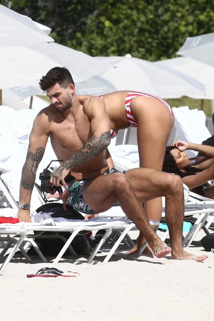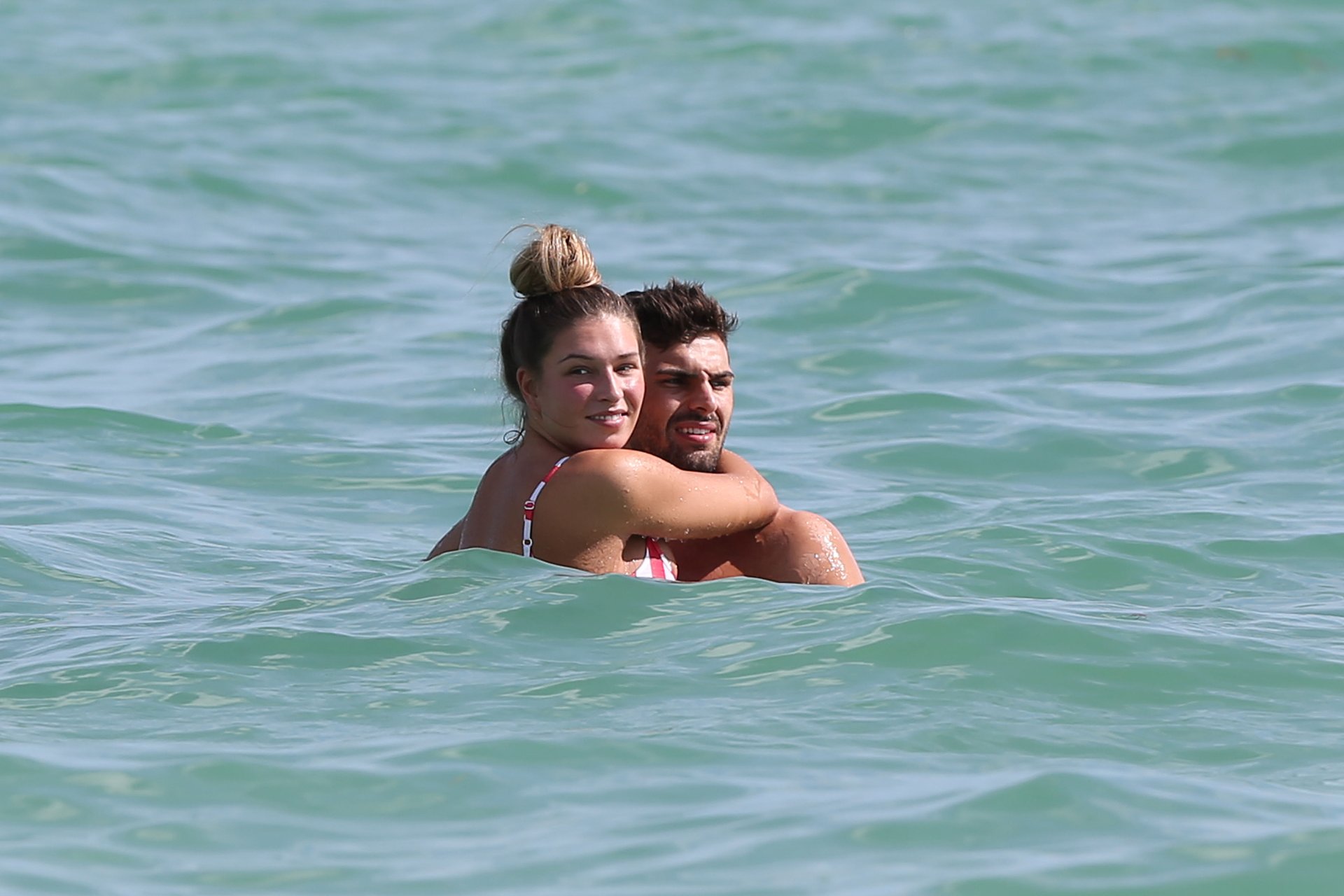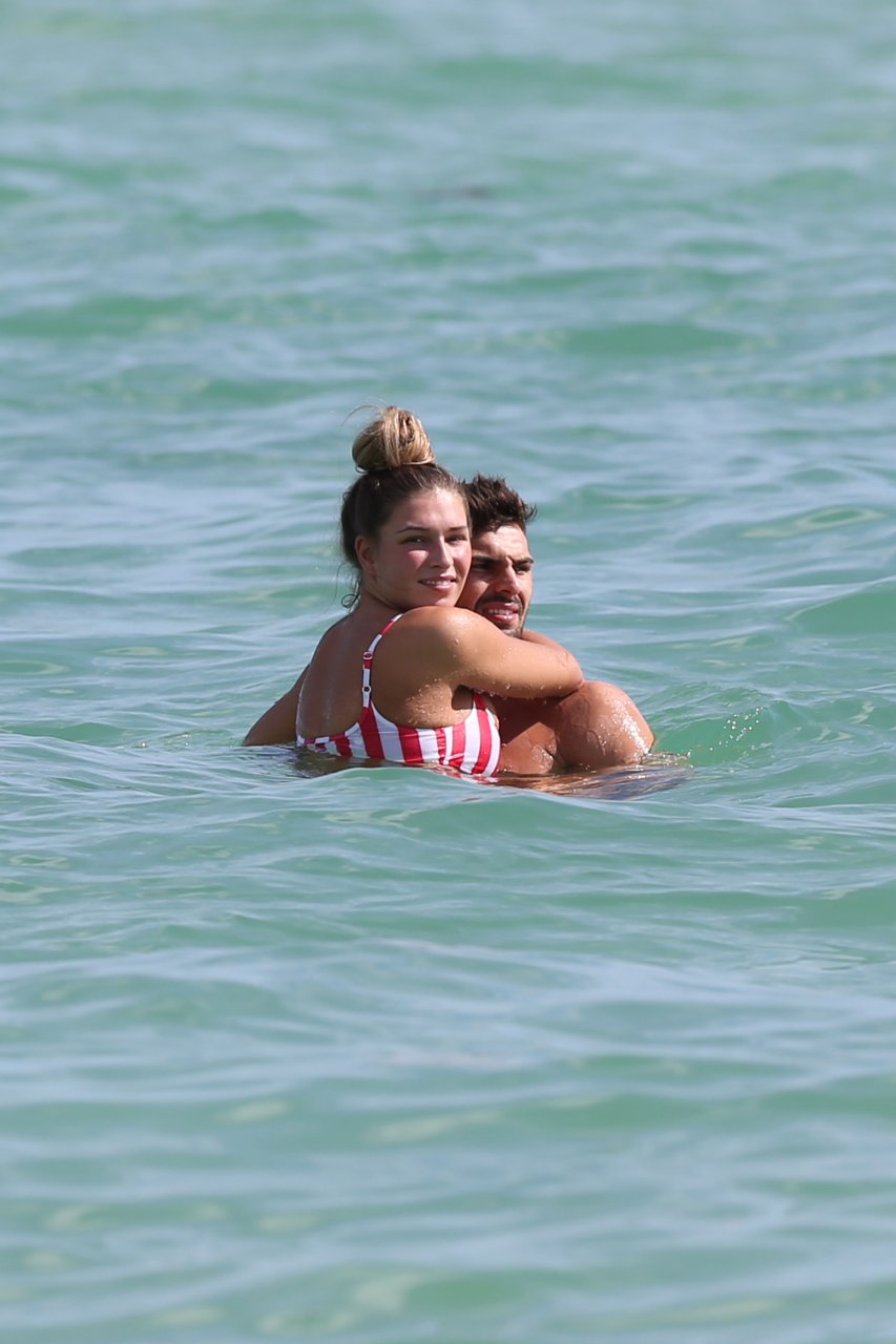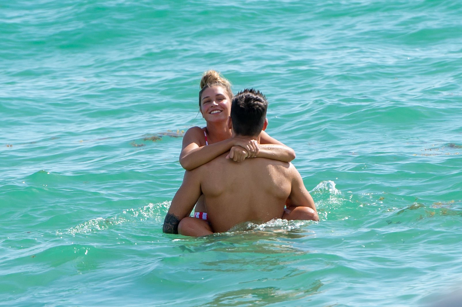 Zara impressionou Adam com uma viagem de aniversário para Miami e as Bahamas e hoje foi a primeira manhã deles ao sol. O casal de reality show que se conheceu no programa de sucesso parecia tão apaixonado como sempre enquanto demonstravam afeto público ao se refrescarem no oceano. Zara exibiu um underboob acentuado em um biquíni muito justo listrado vermelho e branco.