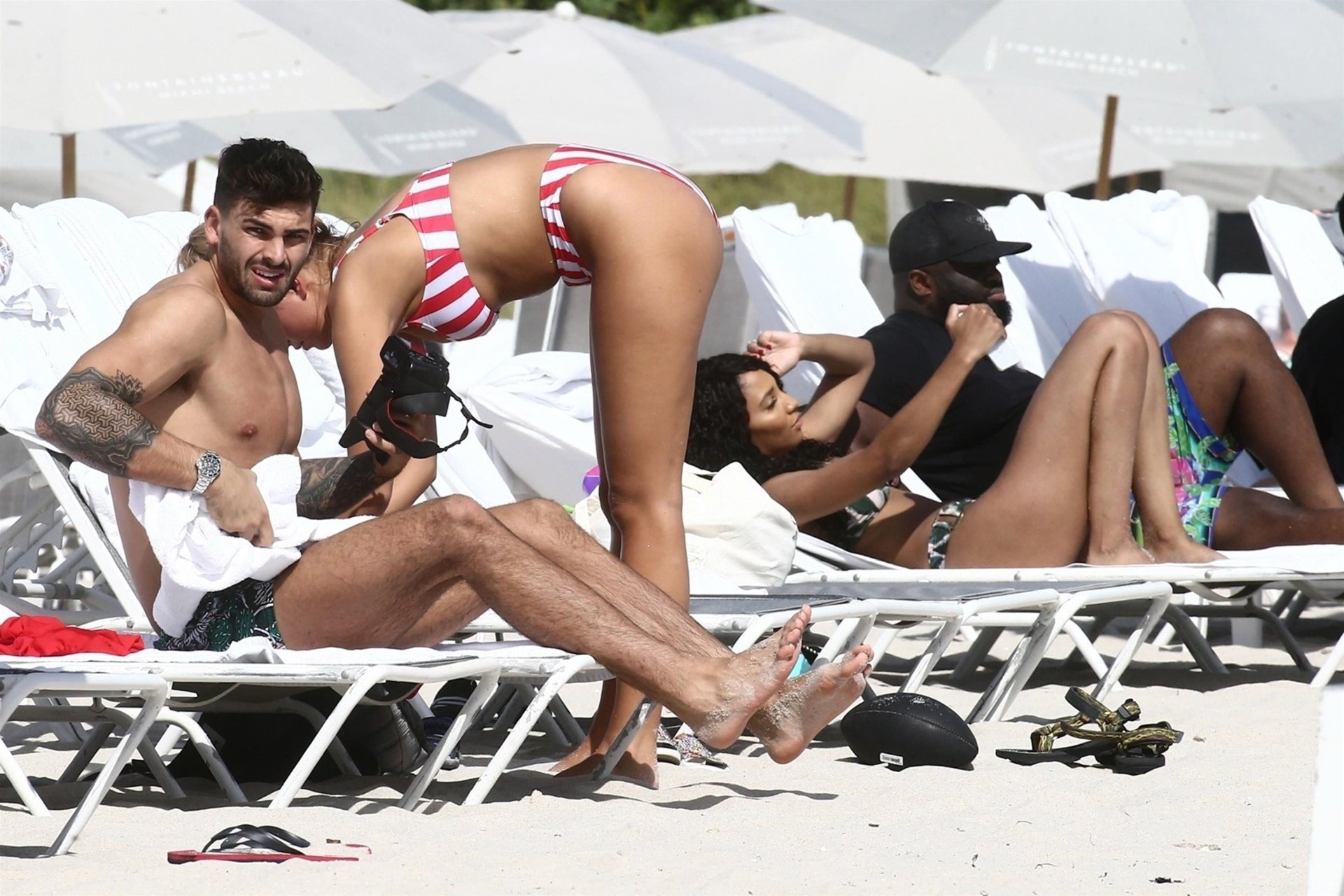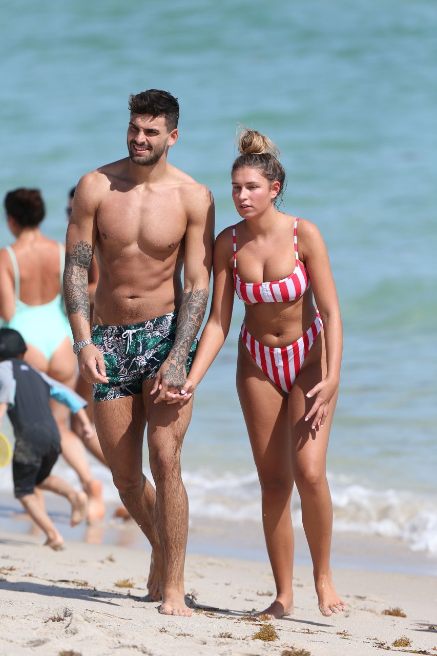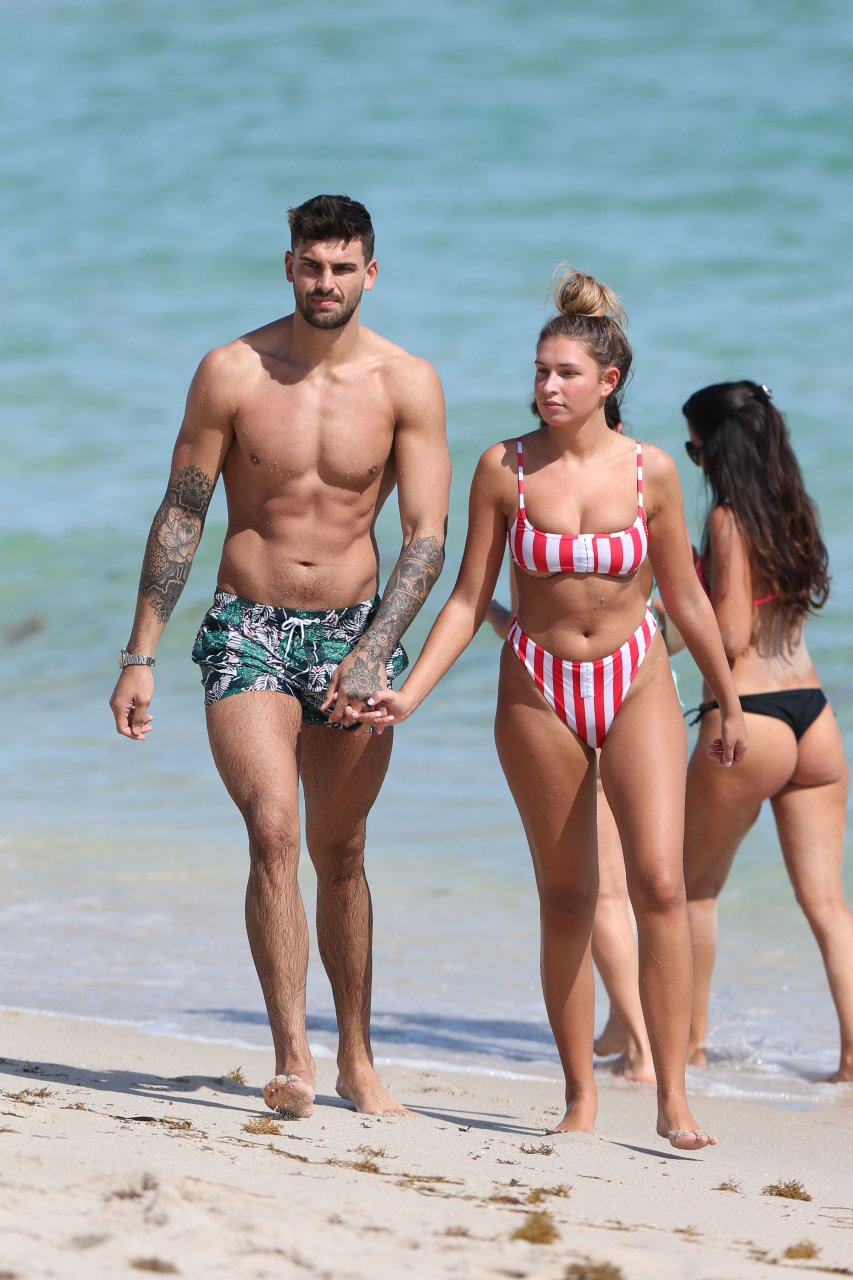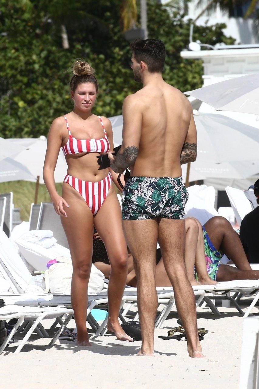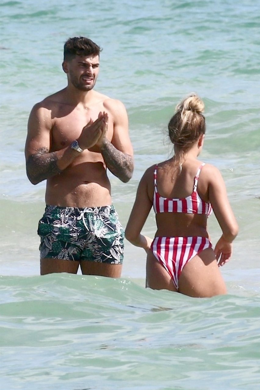 Zara impressionou Adam com uma viagem de aniversário para Miami e as Bahamas e hoje foi a primeira manhã deles ao sol. O casal de reality show que se conheceu no programa de sucesso parecia tão apaixonado como sempre enquanto demonstravam afeto público ao se refrescarem no oceano. Zara exibiu um underboob acentuado em um biquíni muito justo listrado vermelho e branco.