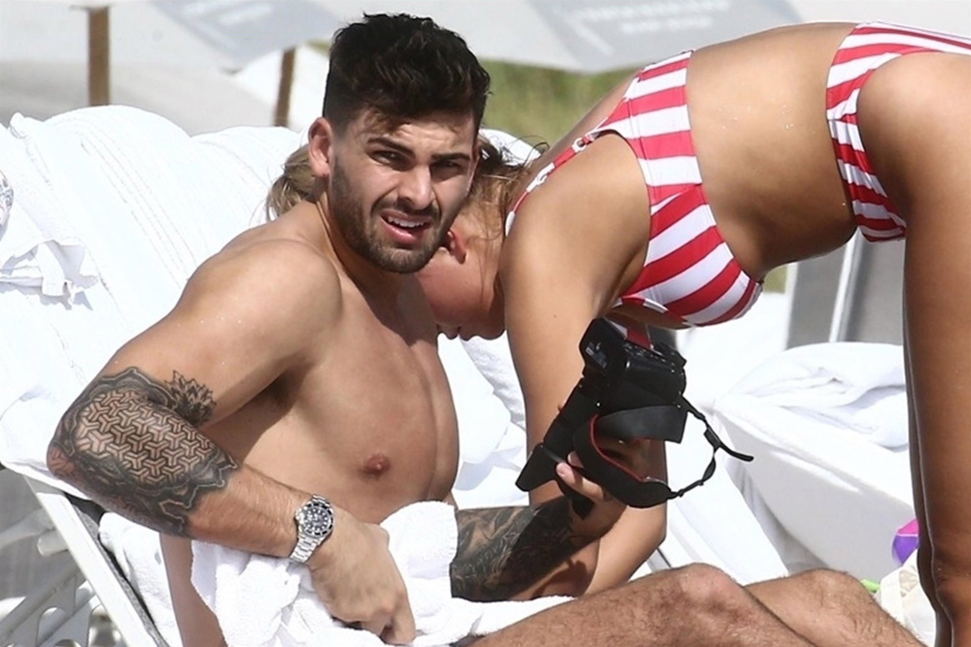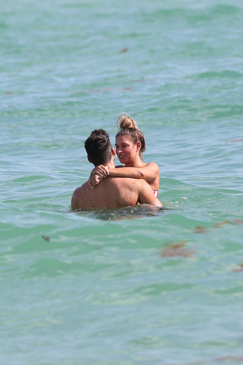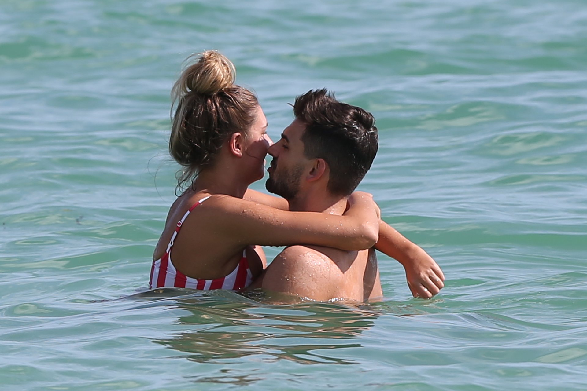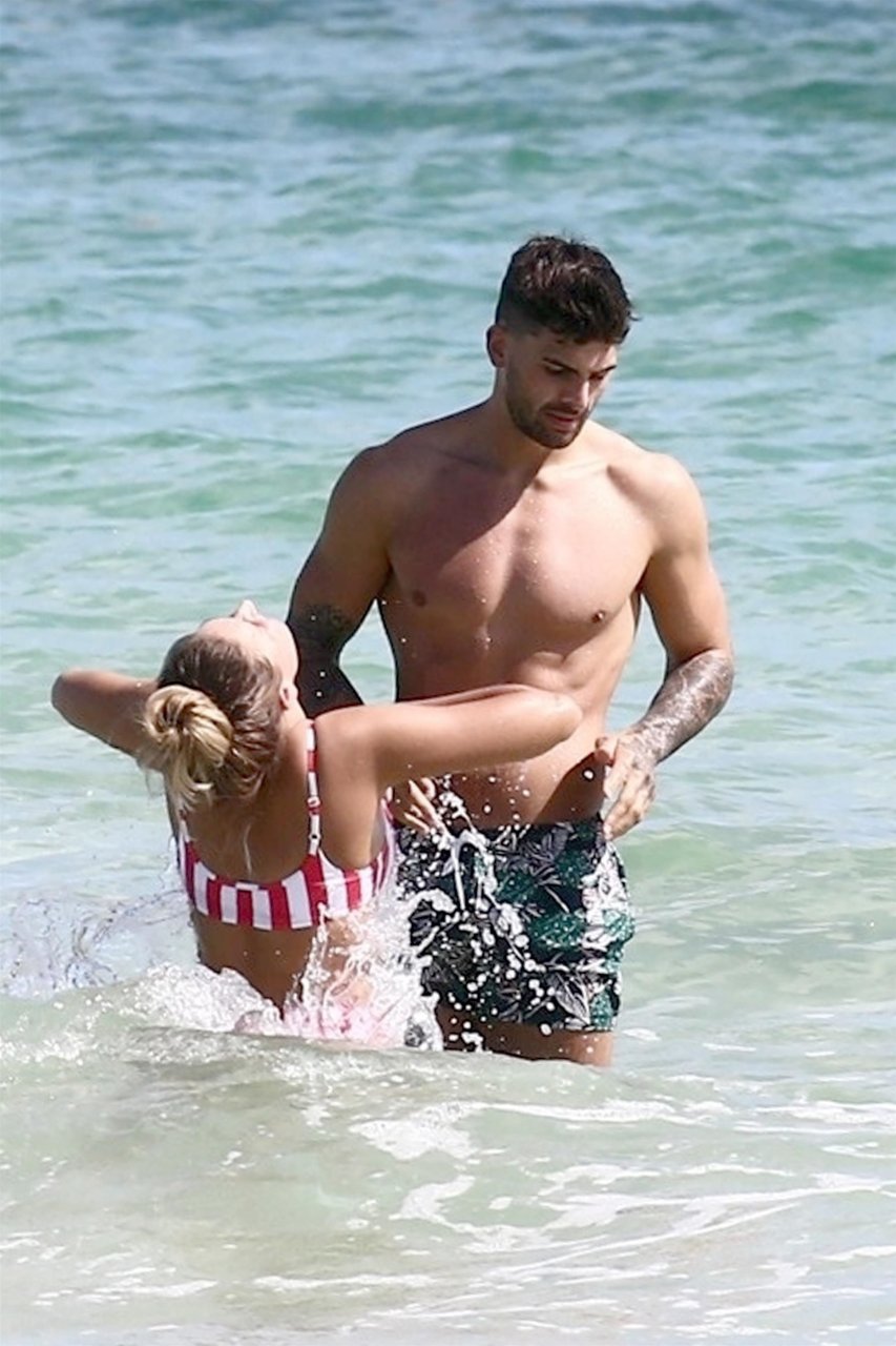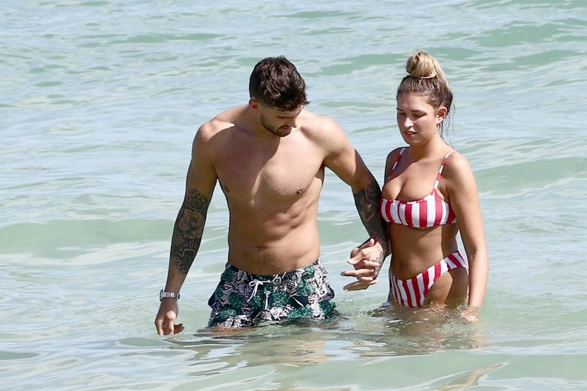 Zara impressionou Adam com uma viagem de aniversário para Miami e as Bahamas e hoje foi a primeira manhã deles ao sol. O casal de reality show que se conheceu no programa de sucesso parecia tão apaixonado como sempre enquanto demonstravam afeto público ao se refrescarem no oceano. Zara exibiu um underboob acentuado em um biquíni muito justo listrado vermelho e branco.