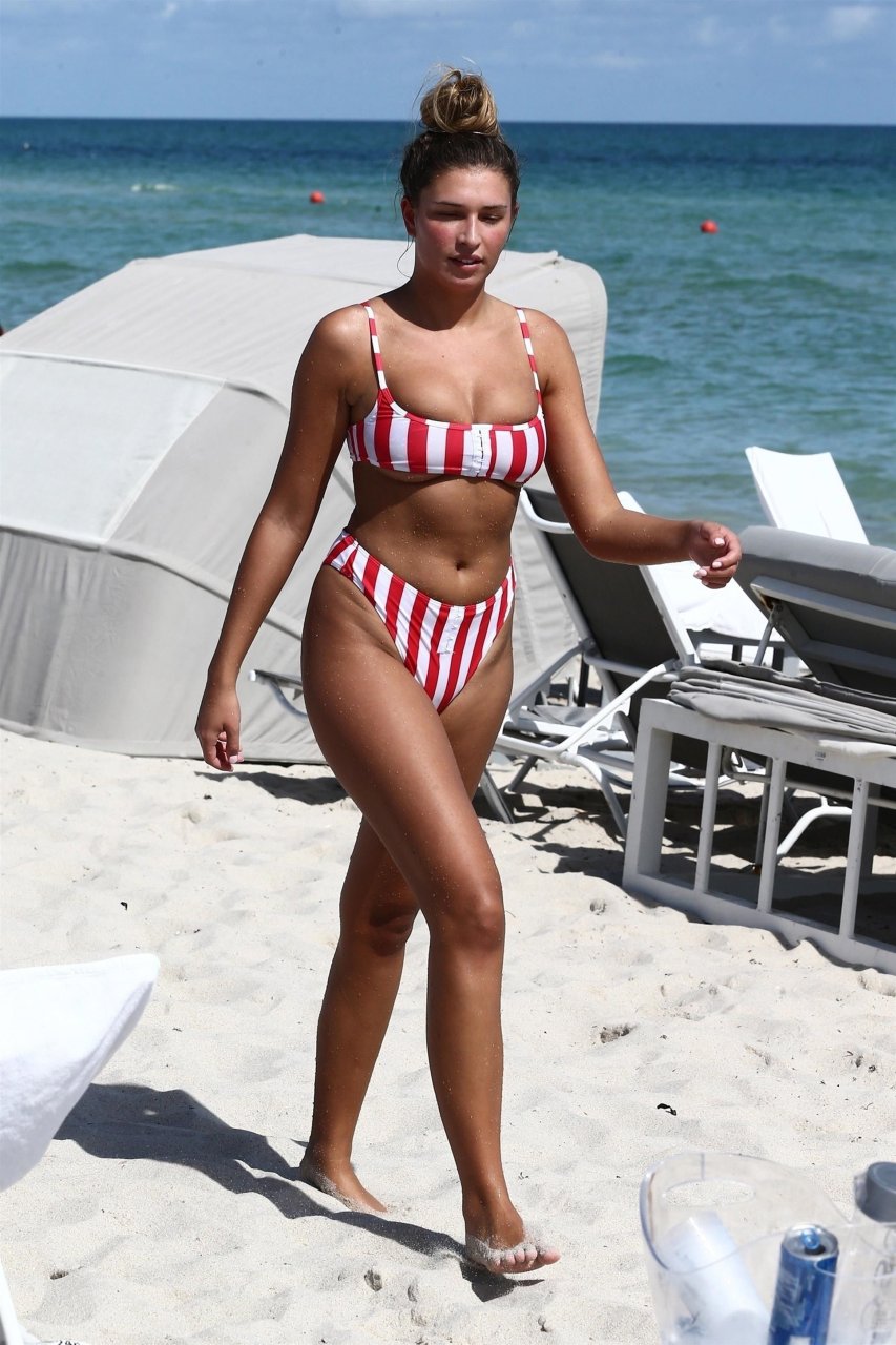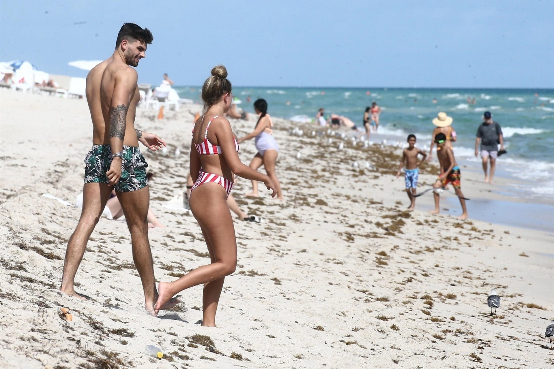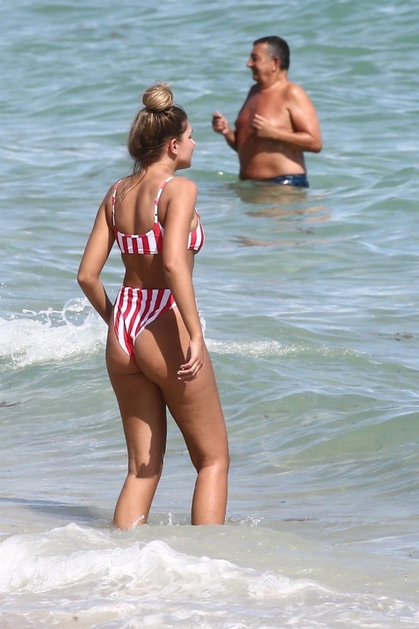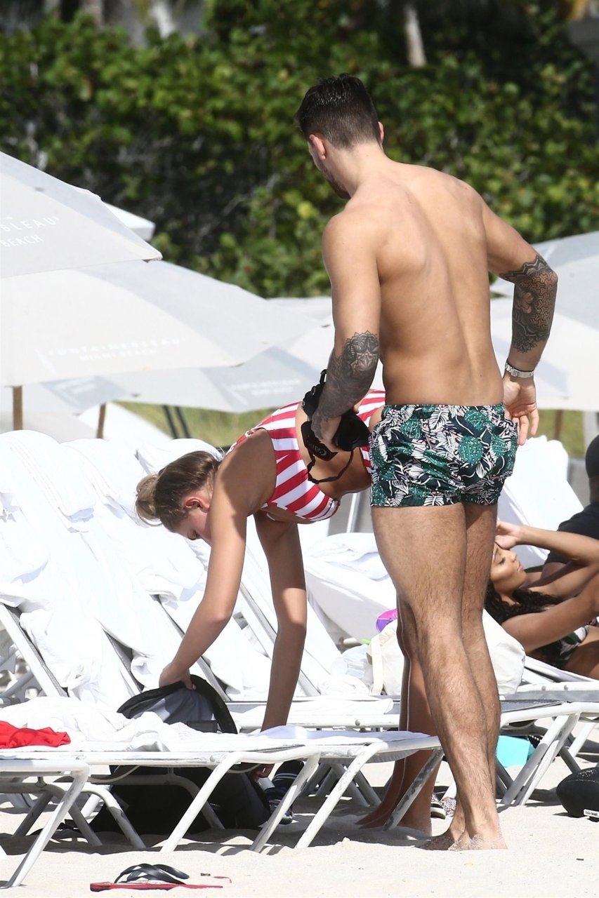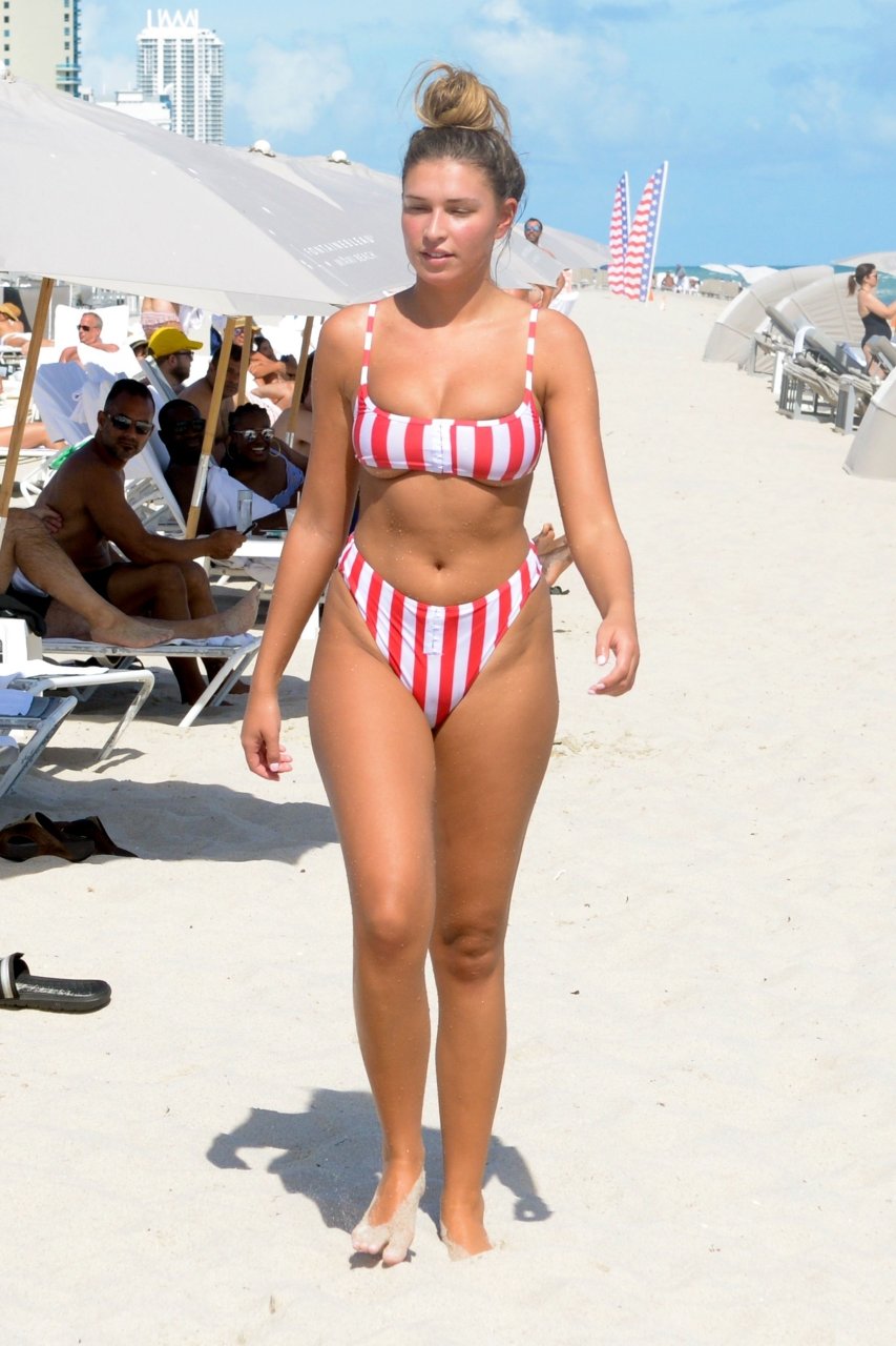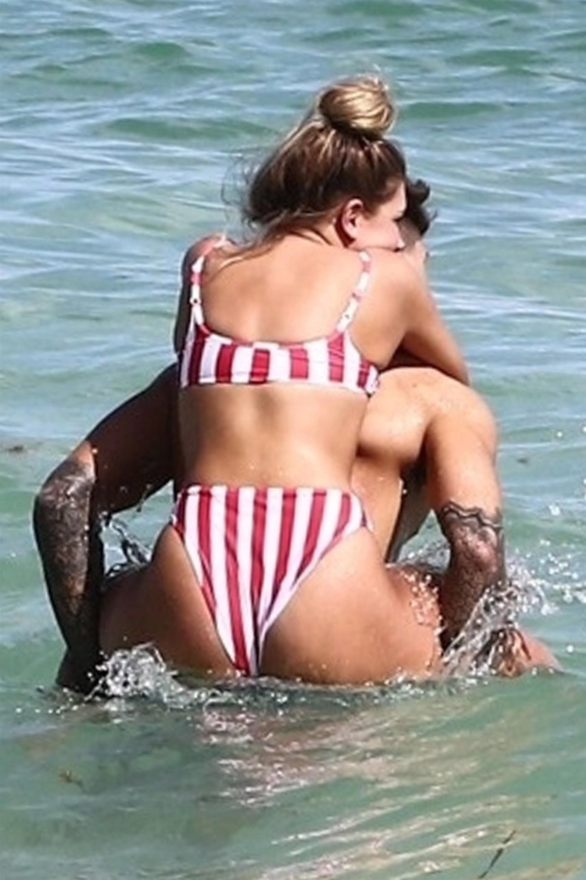 Zara impressionou Adam com uma viagem de aniversário para Miami e as Bahamas e hoje foi a primeira manhã deles ao sol. O casal de reality show que se conheceu no programa de sucesso parecia tão apaixonado como sempre enquanto demonstravam afeto público ao se refrescarem no oceano. Zara exibiu um underboob acentuado em um biquíni muito justo listrado vermelho e branco.