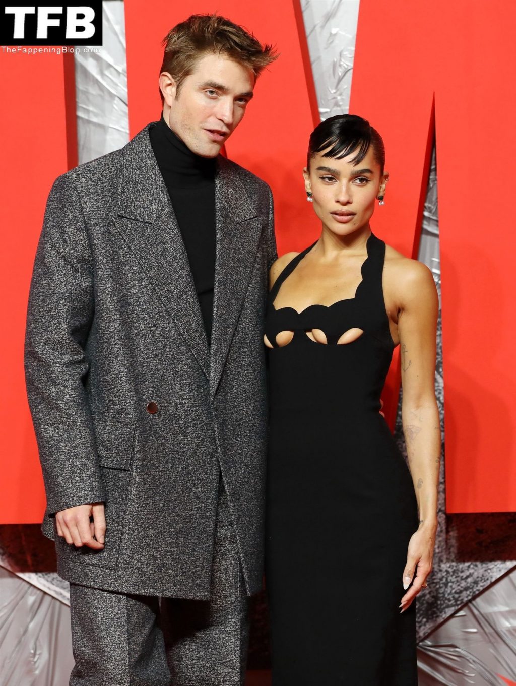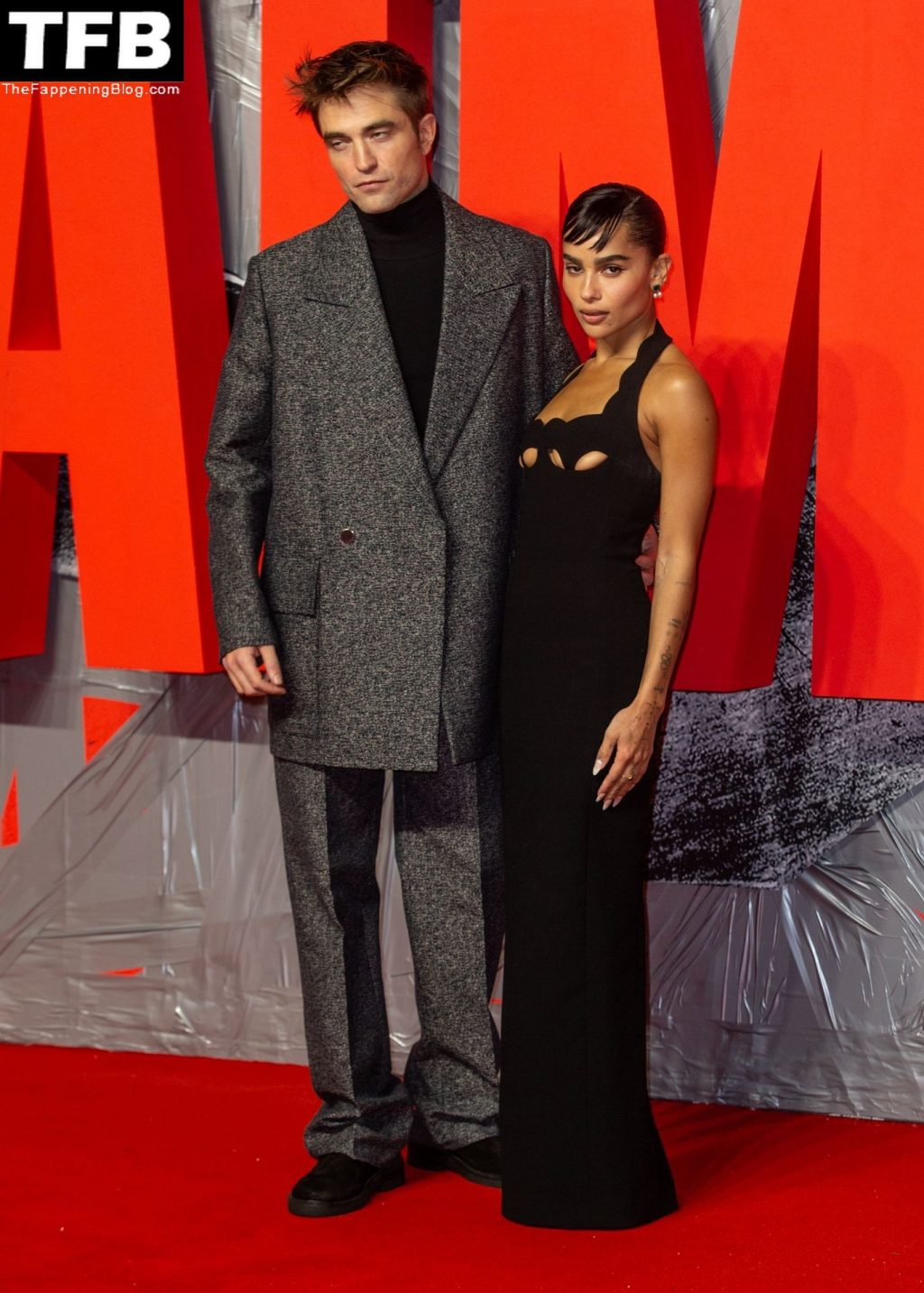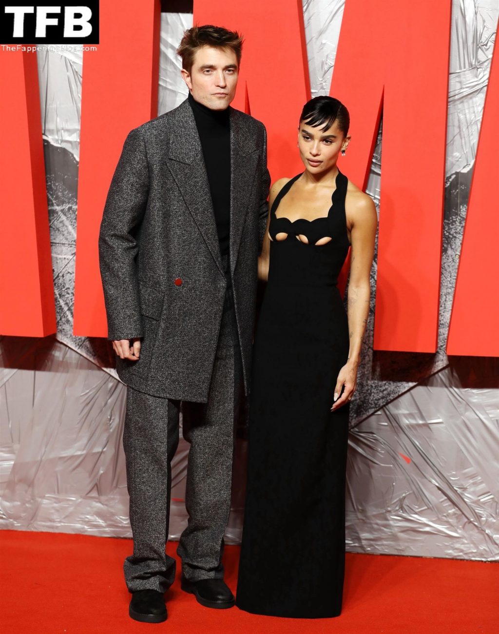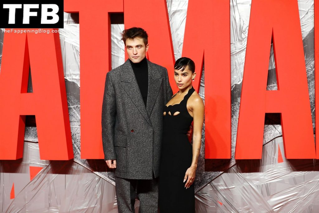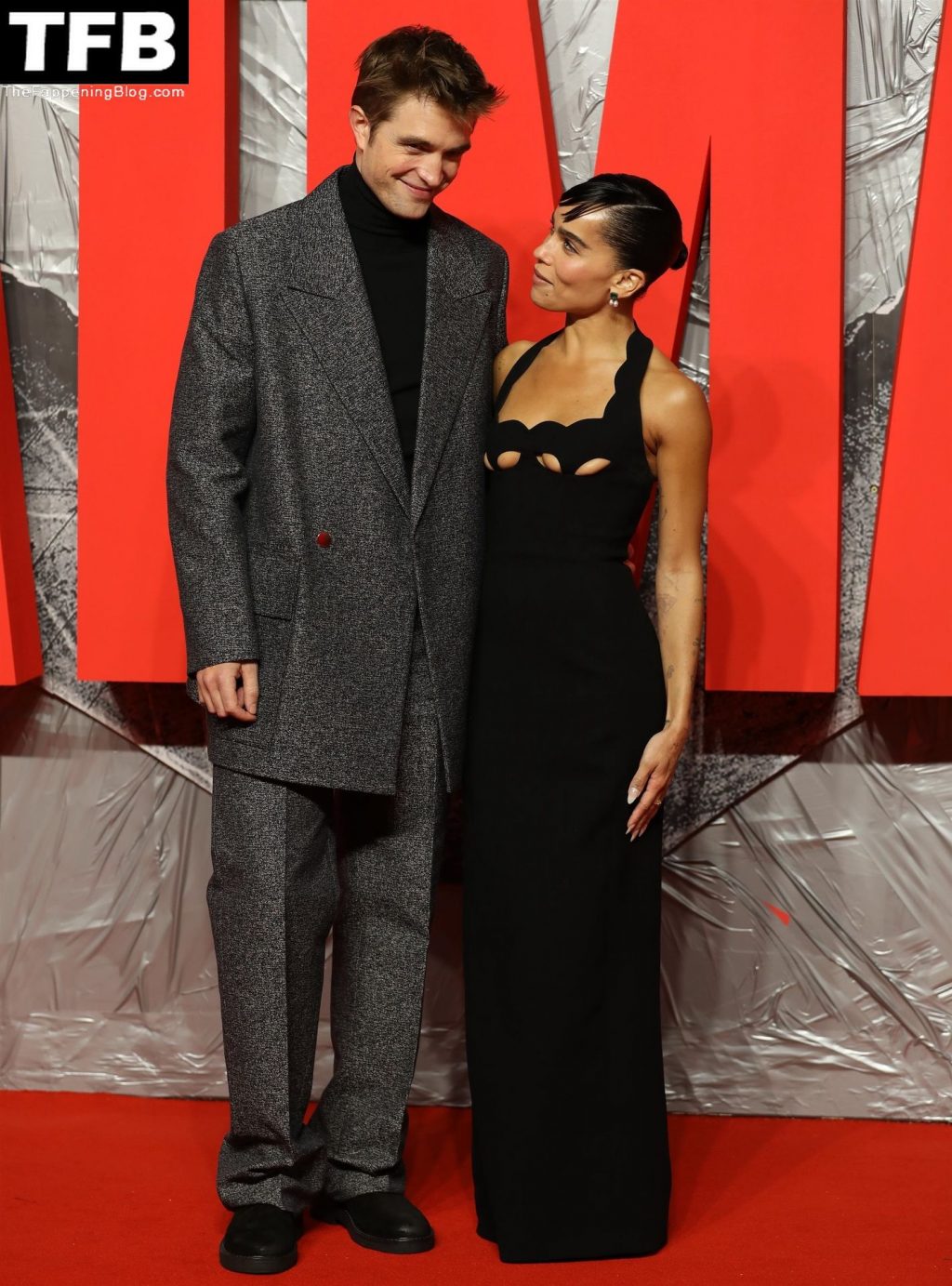 Atores Zoe Kravitz e Robert Pattinson posam juntos no tapete vermelho da premiere do filme The Batman em Londres, 23/02/2022.