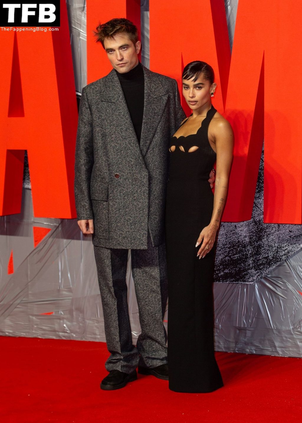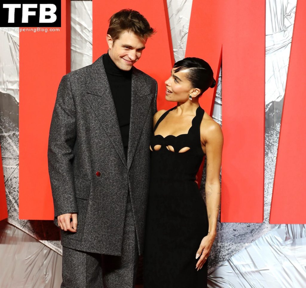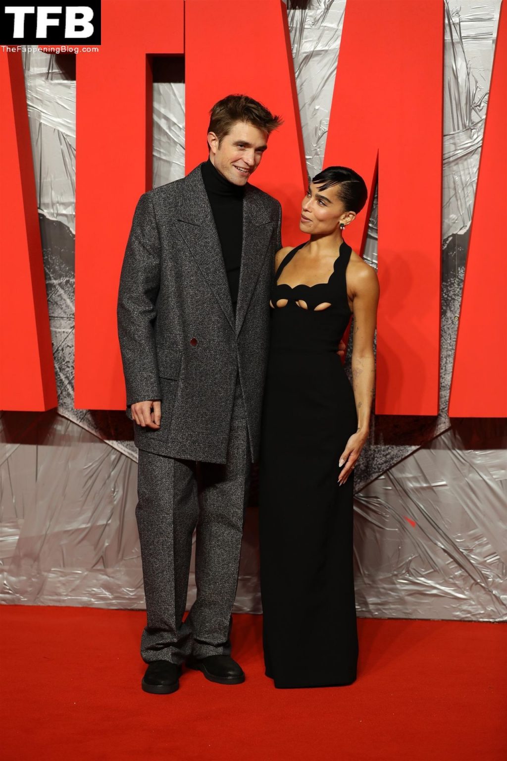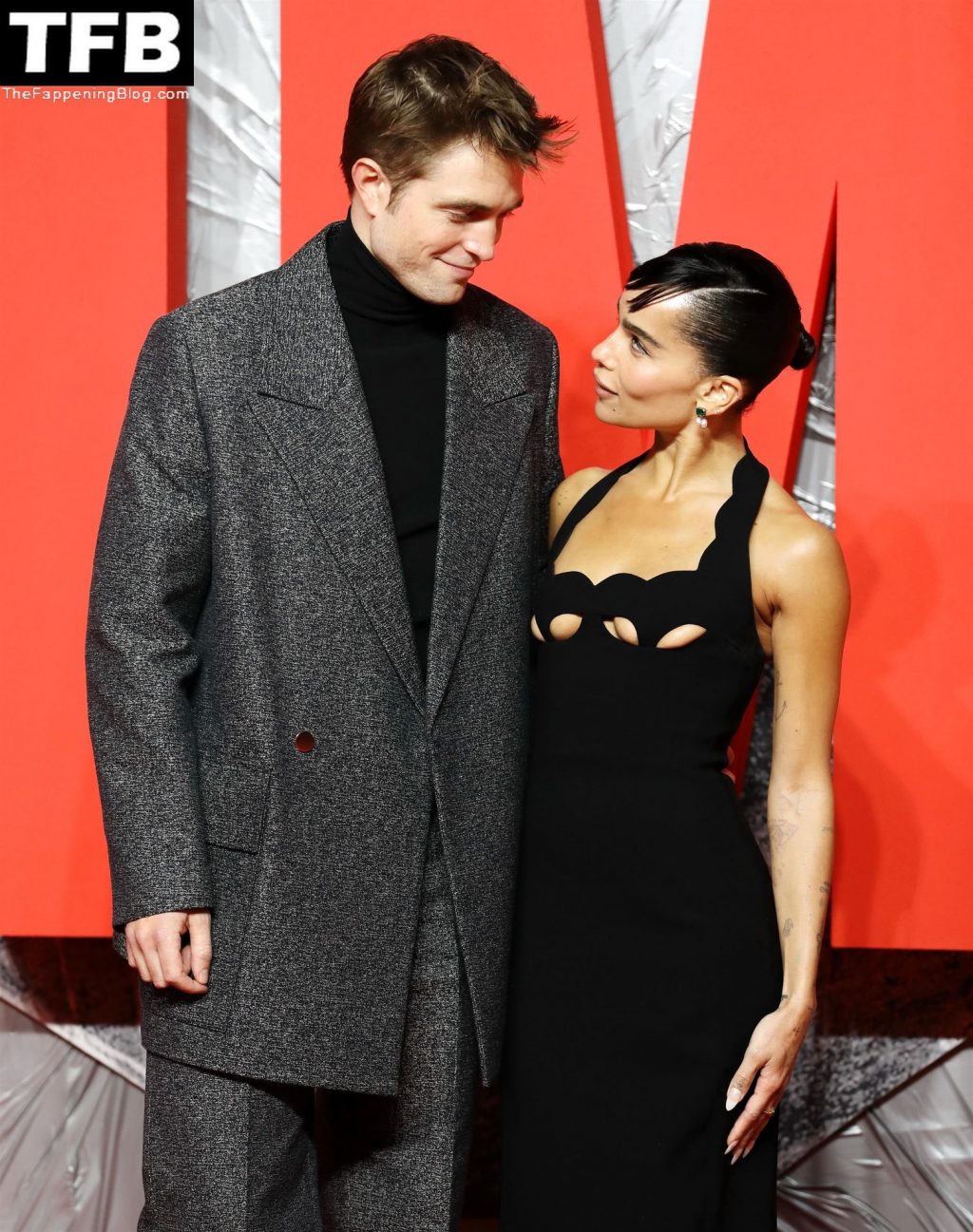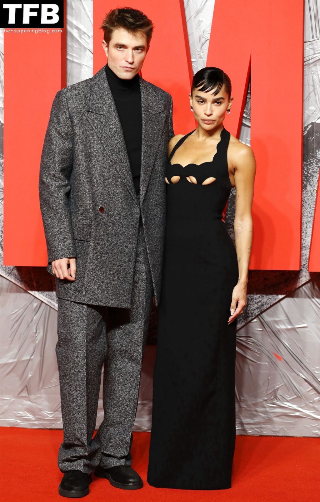 Atores Zoe Kravitz e Robert Pattinson posam juntos no tapete vermelho da premiere do filme The Batman em Londres, 23/02/2022.