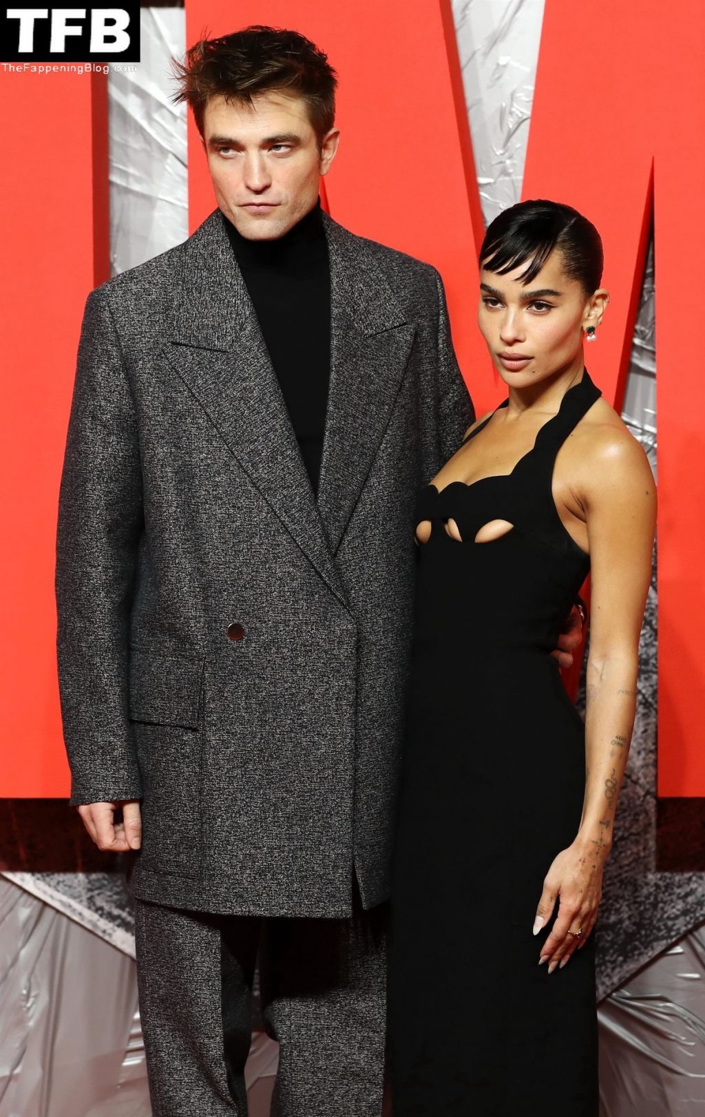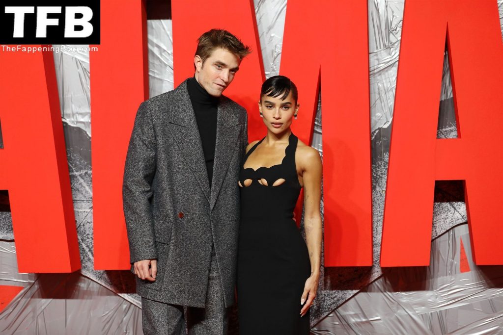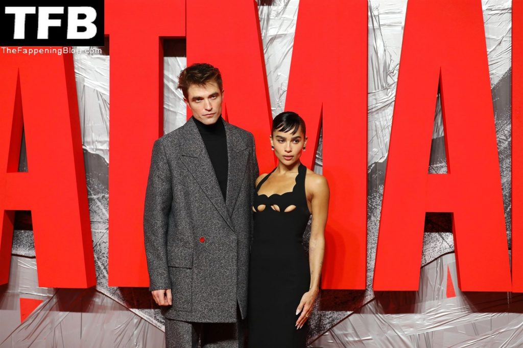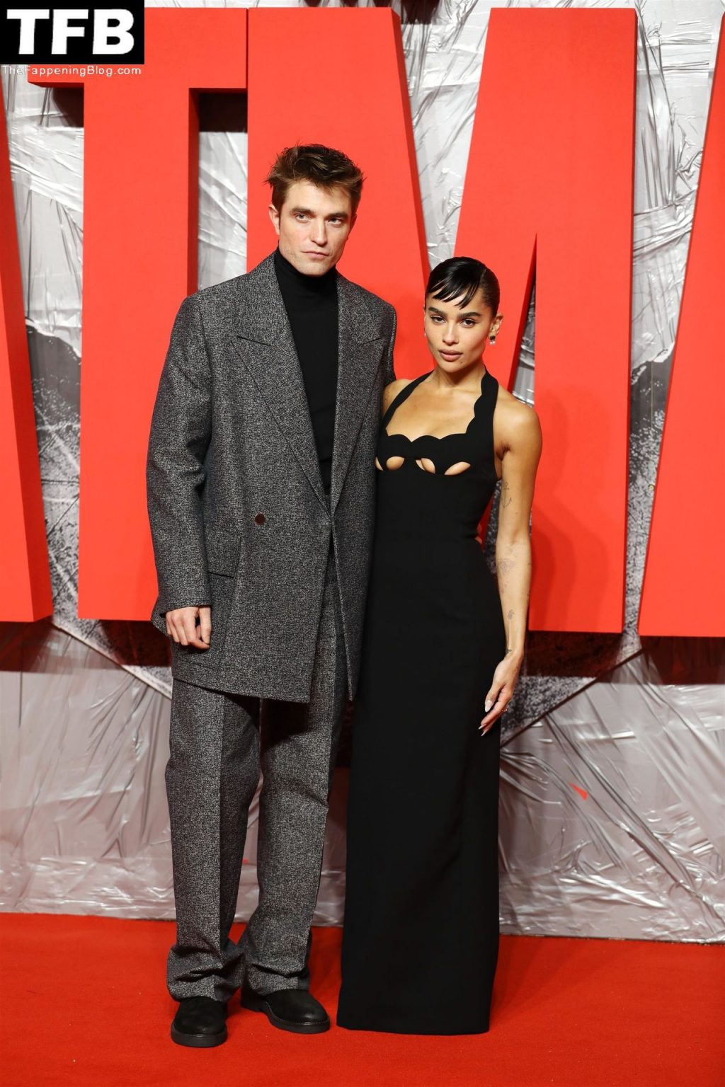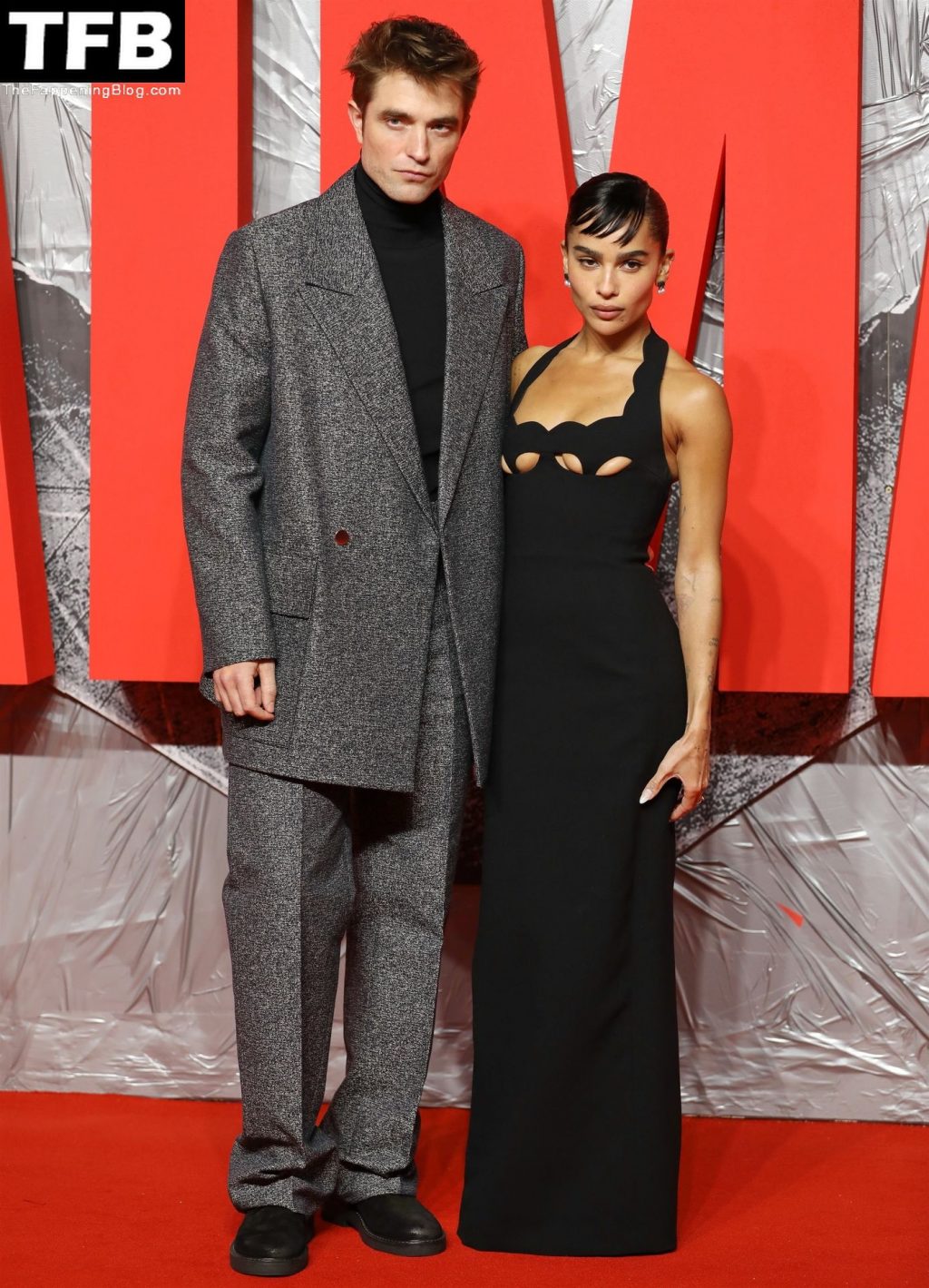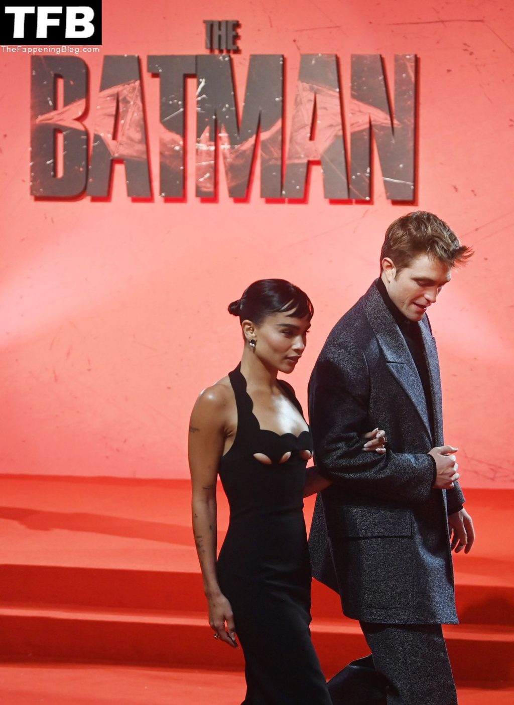 Atores Zoe Kravitz e Robert Pattinson posam juntos no tapete vermelho da premiere do filme The Batman em Londres, 23/02/2022.