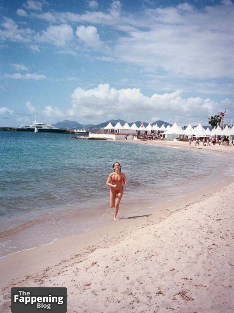 Zoey Deutch arrasando com um biquíni minúsculo, mostrando um decote incrível, pernas quentes e um corpo firme enquanto corre na praia.
